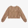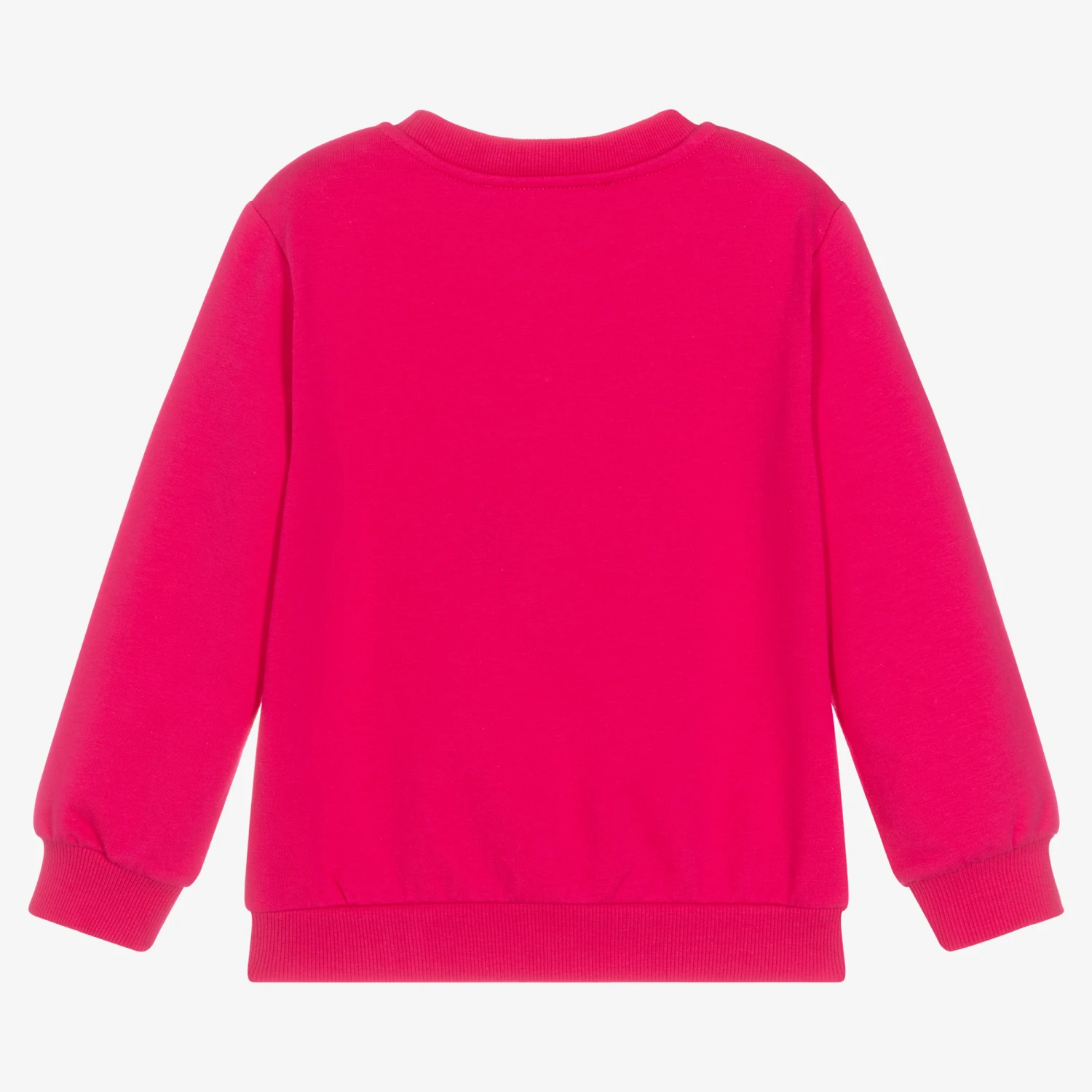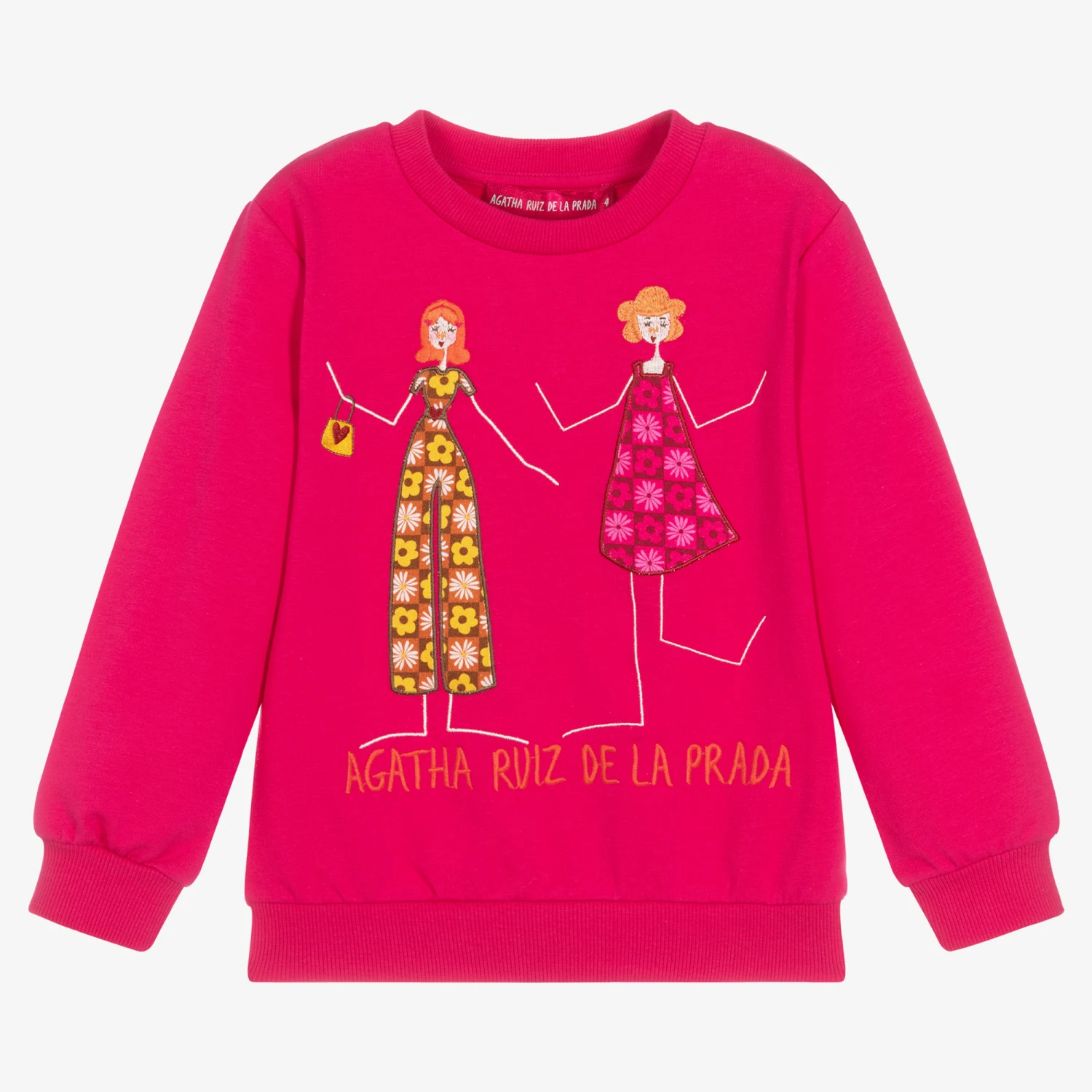 Chic fuchsia pink sweatshirt for girls by Agatha Ruiz de la Prada, made in soft and mid-weight cotton jersey. It has a fun embroidered girl design on the front, with flower print appliqués in pink and mustard yellow. There are also embroidered orange details in the form of the girls hair and a logo above the hem.