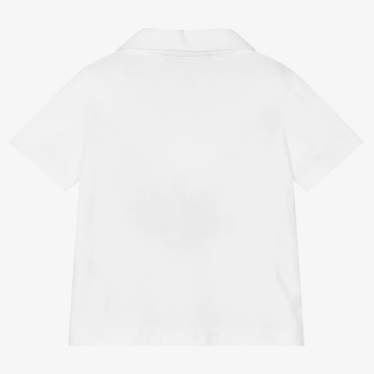 Made in soft cotton piqué, a white polo shirt for girls by Agatha Ruiz de la Prada. It has a transparent yellow chest pocket with a blue sequin star that is attached by a satin ribbon.