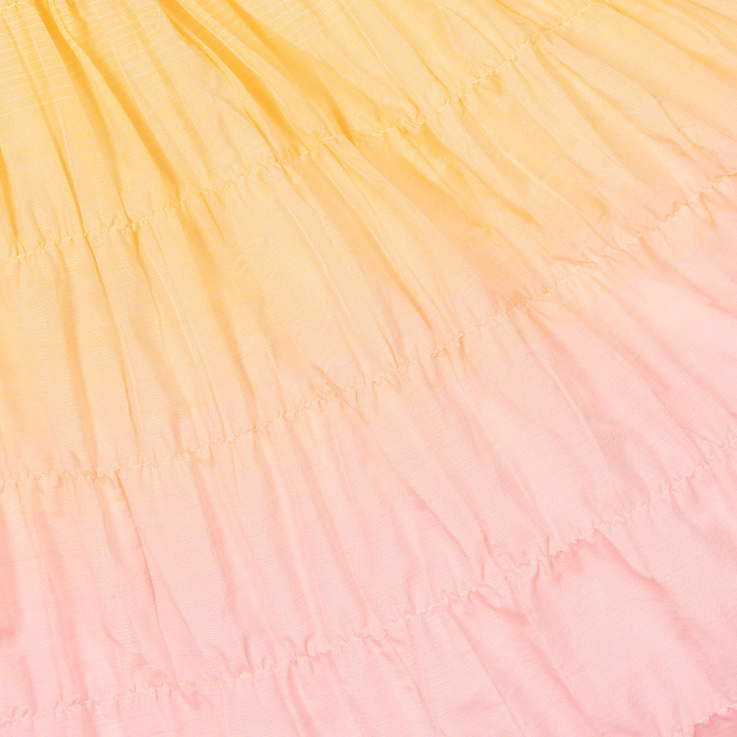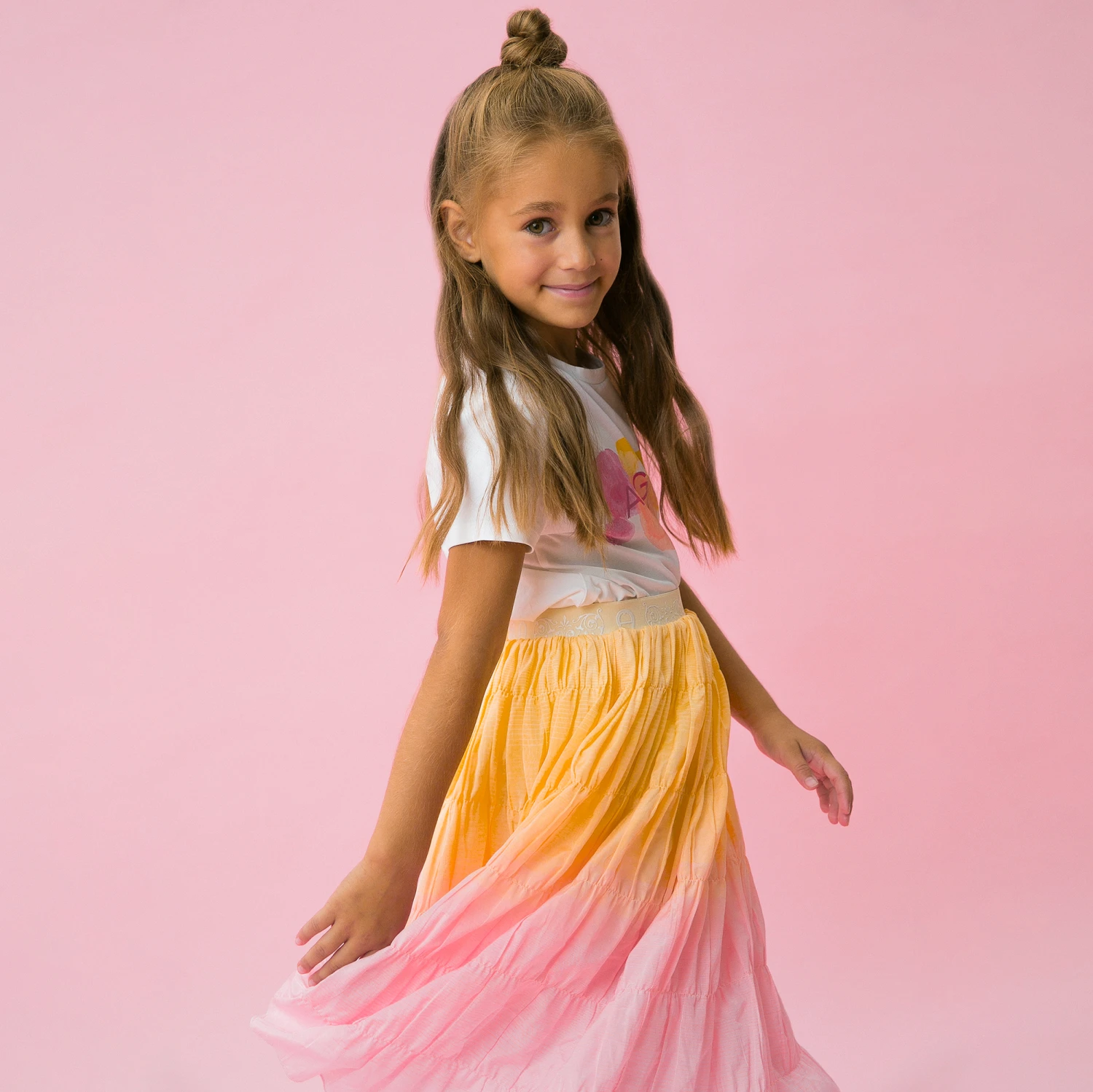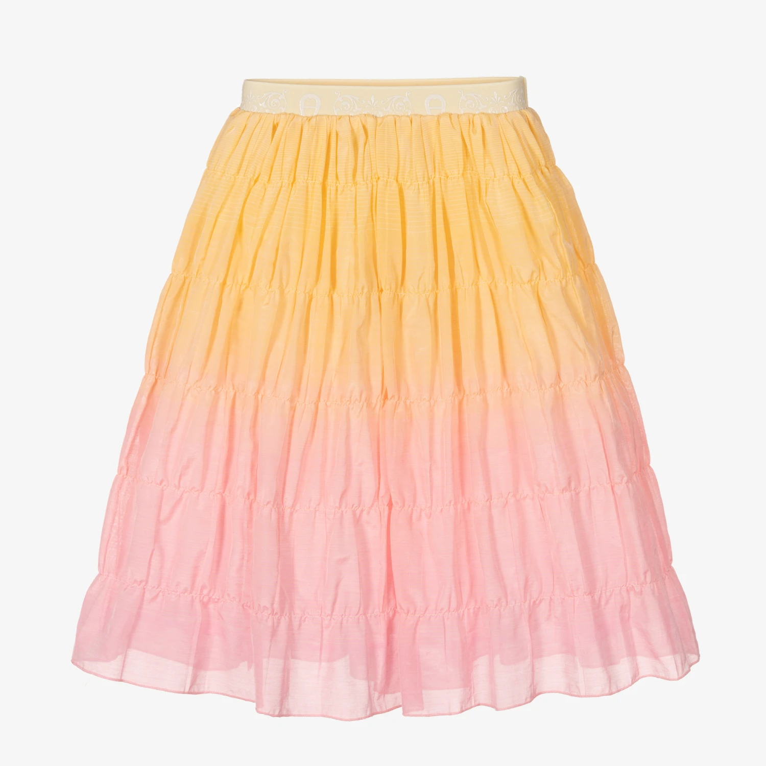 Pink and orange ombré skirt for girls by German designer AIGNER. Lightweight with a sheen, this pretty skirt has gently ruched tiers and a subtle horizontal striped print. Lined for comfort, the ivory elasticated waistband has a white rubberised signature ‘A’ horseshoe logo.