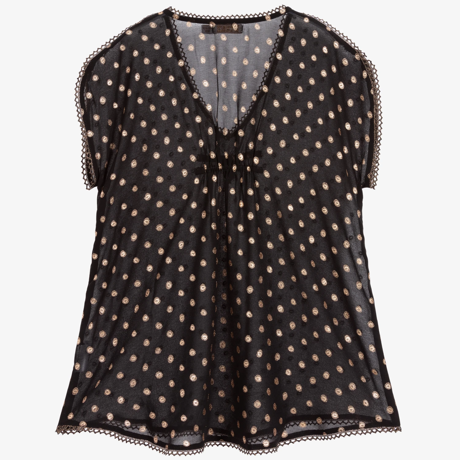 Girls black beach cover-up from Angel’s Face, made in lightweight polyester chiffon. Patterned with gold dots, and sparkling dark gold trim, it has the designer’s signature golden angel wings charm and bow on the front.