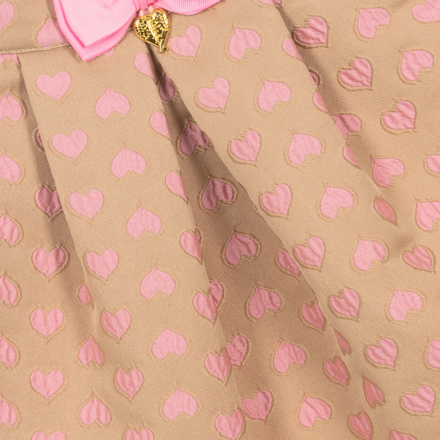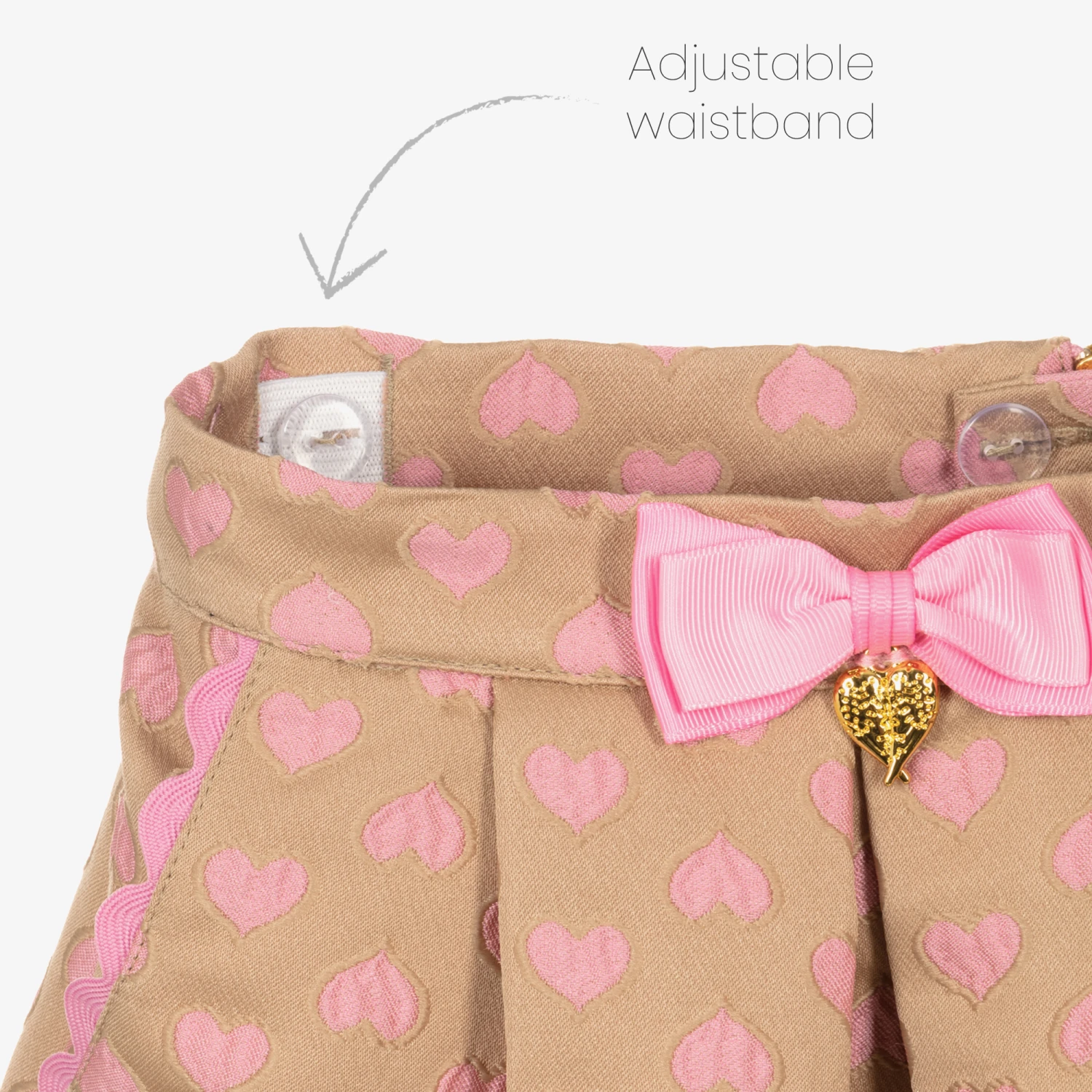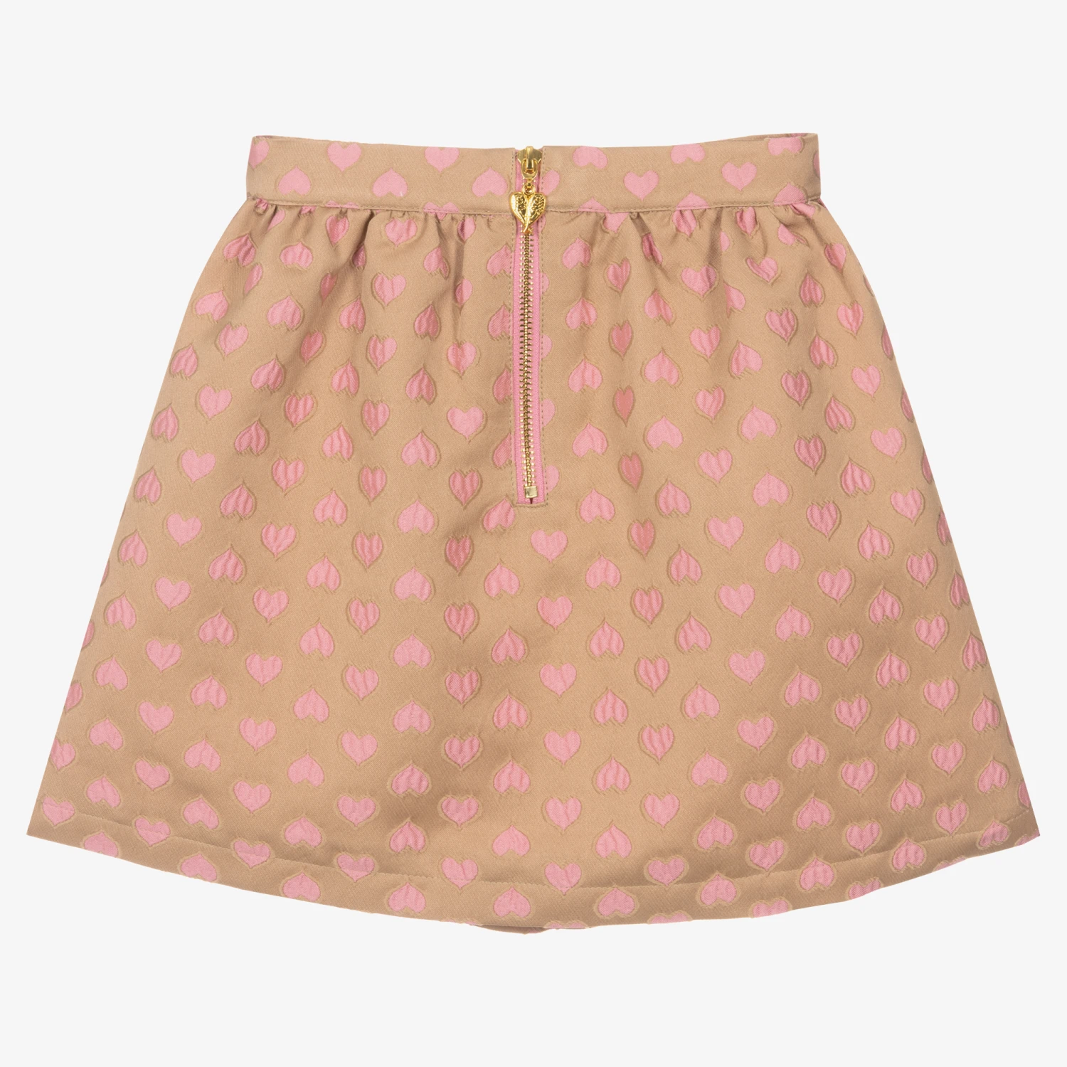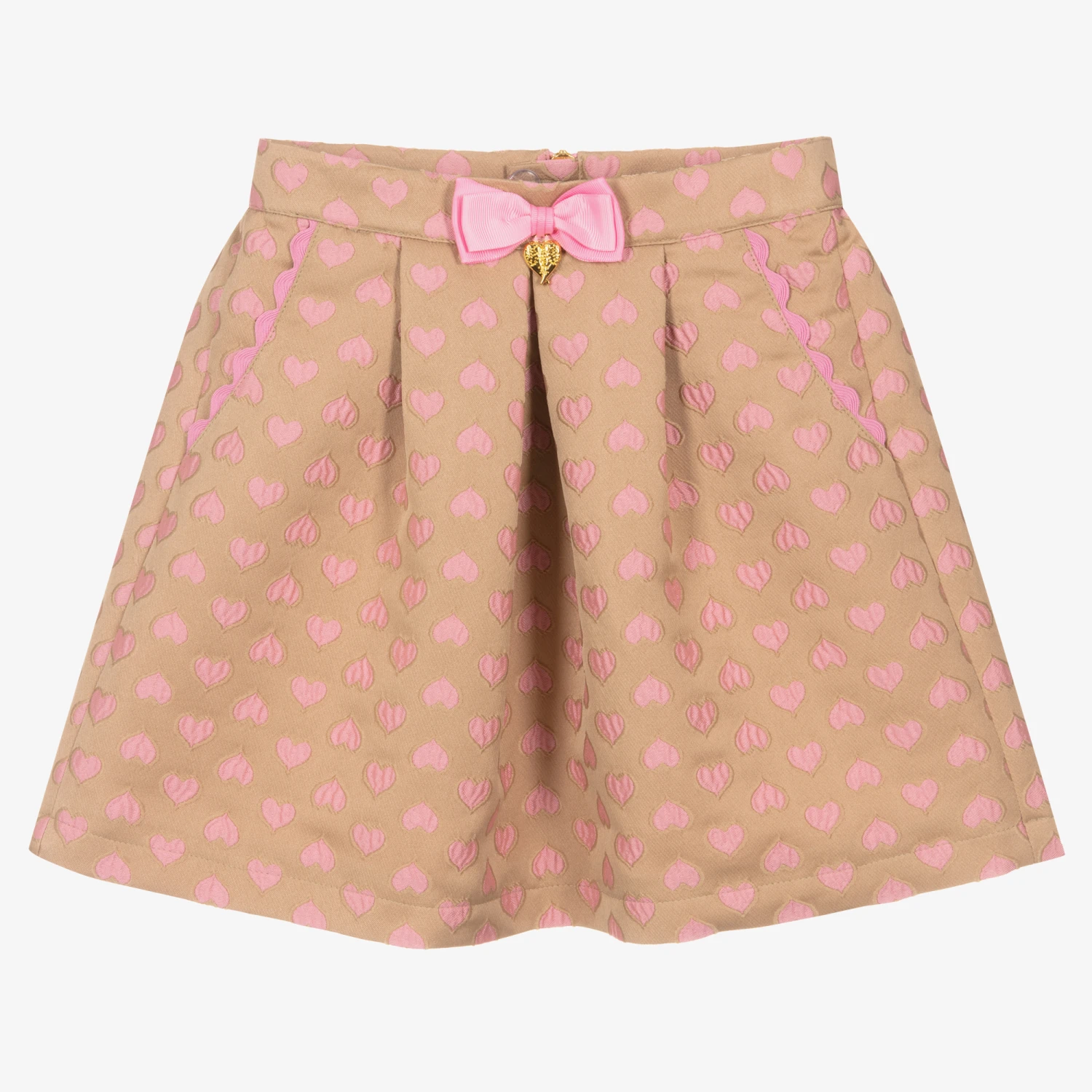 From Angel’s Face, a lovely beige and pink skirt for girls. It is made in soft, mid-weight woven fabric, with a pretty jacquard heart design. It has useful front pockets with pink ric rac trims and an adjustable waist for a comfortable fit. Lined with soft pink crêpe, it fastens on the back with a hidden button and statement gold branded zip. Decorating the waist is the designer’s signature golden heart charm and bow branding to complete this feminine look.
