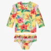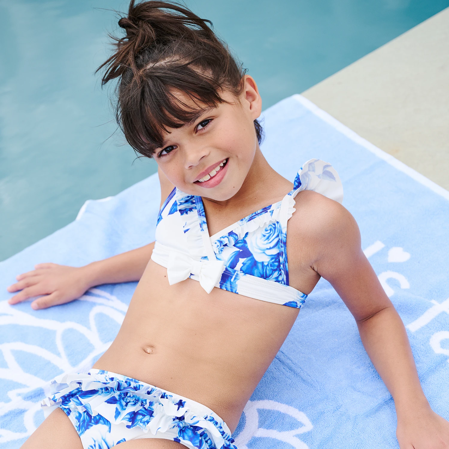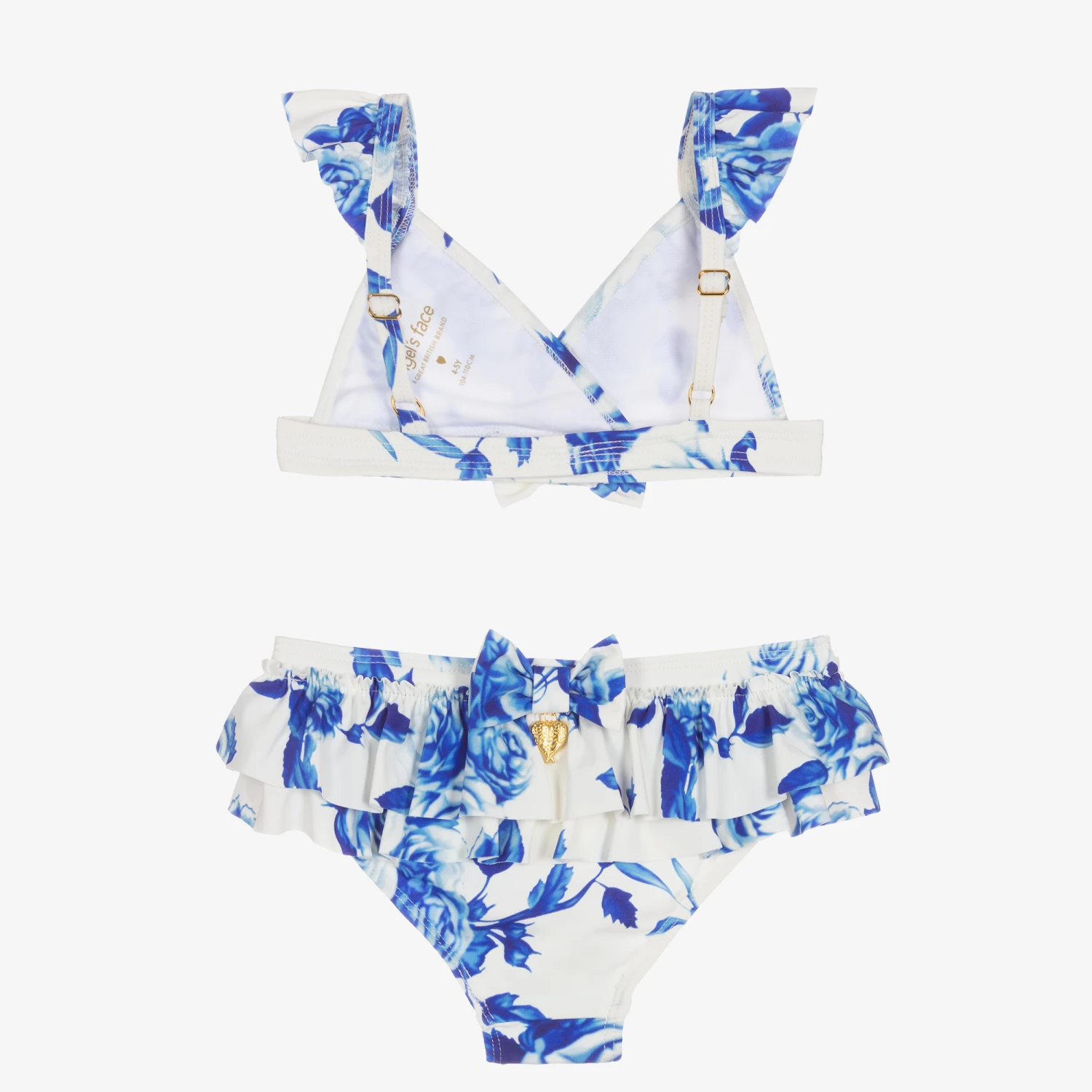 A white and blue floral bikini for girls from Angel’s Face, with UPF50+. Both the top and bottoms are made in silky, stretchy fabric and lined with soft jersey for comfort. The triangle-shaped bikini top has a decorative bow on the front, pretty frilled trims across the front and shoulders, and adjustable straps for a good fit. The bottoms are trimmed with lovely frills and have the designer’s signature golden heart charm and bow on the back.