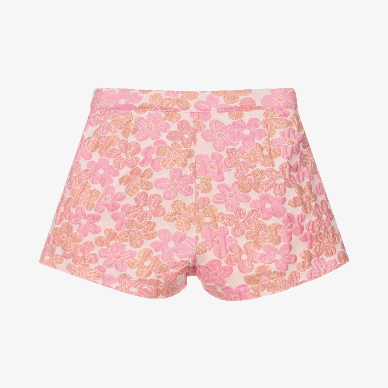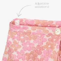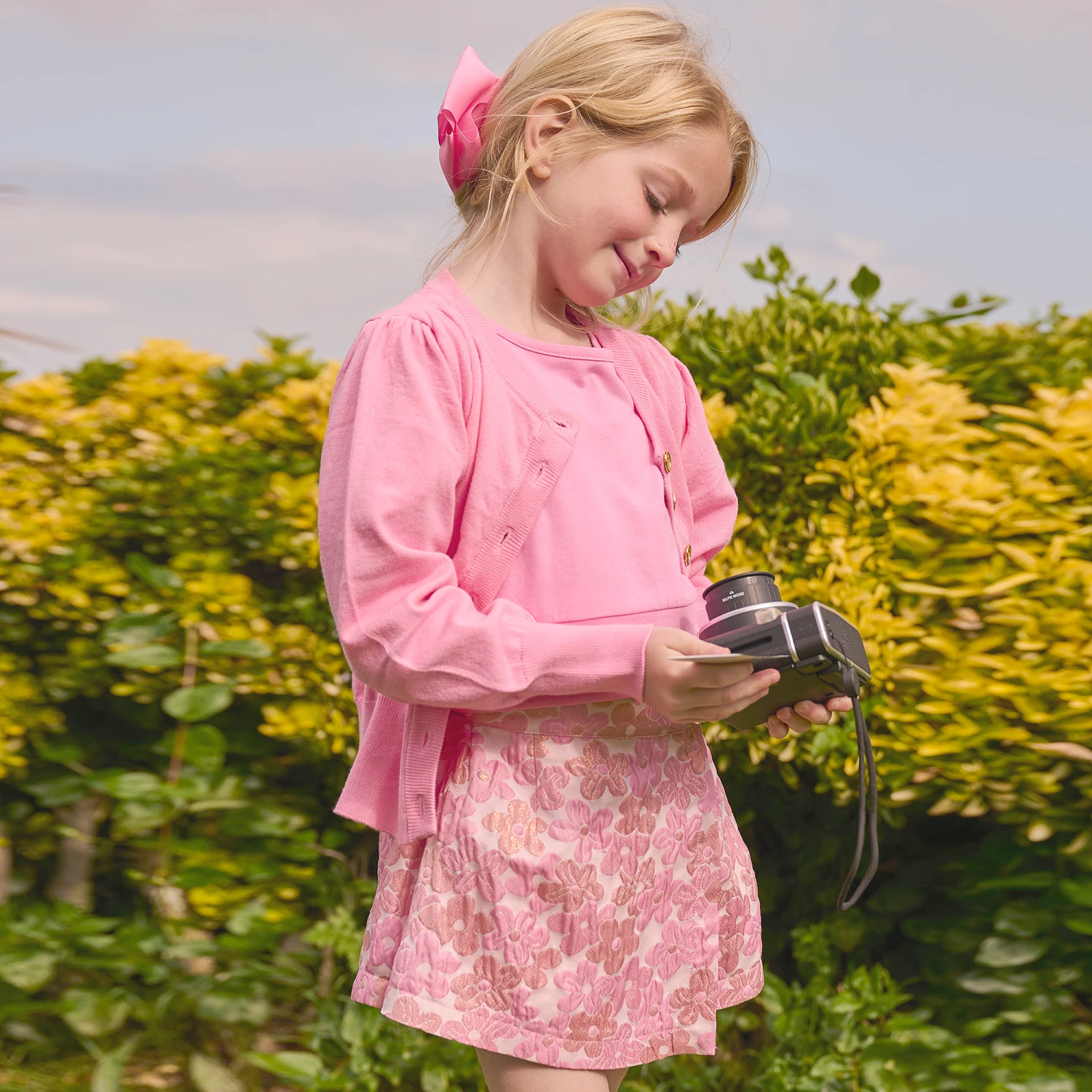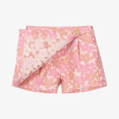From Angel’s Face, a lovely pink skort for girls. This stunning piece is made in floral jacquard, with glittering rose gold glitter accents woven within the soft fabric. The front panel has a shiny gold branded metal button fastening, with shorts underneath. An adjustable waist, concealed side zip and soft crêpe lining ensure easy dressing and a comfortable fit.