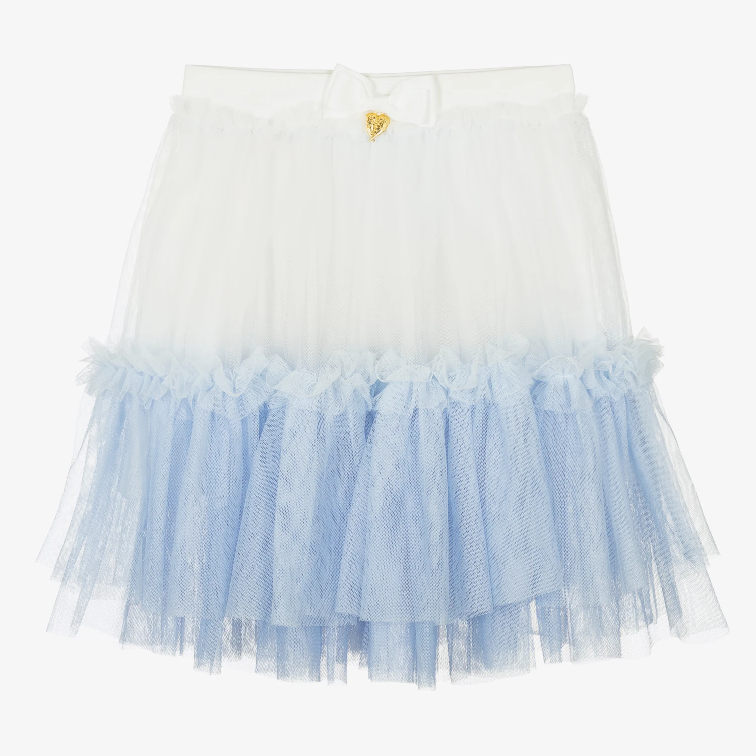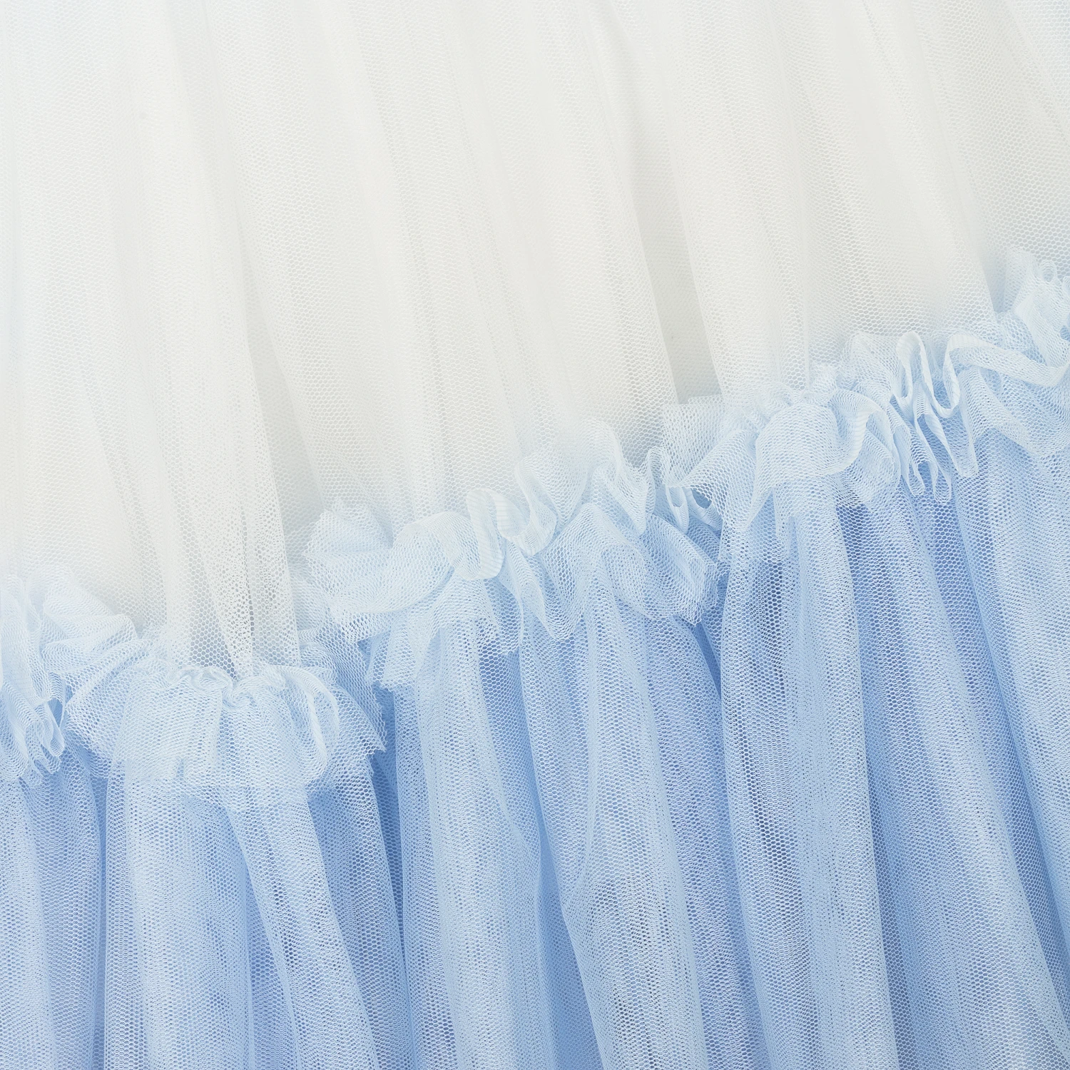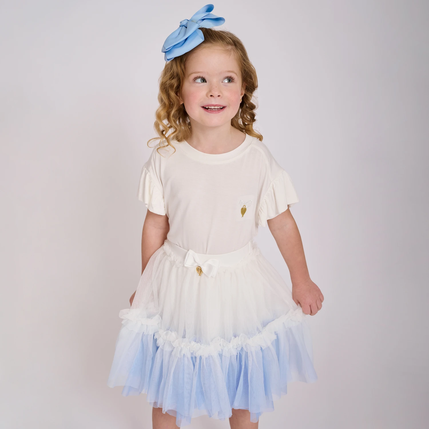 Beautiful off-white and blue tutu skirt for girls by British brand Angel’s Face. In a unique blue ombré design, the voluminous skirt is made with layers of soft tulle for a special party look. The designer’s golden wings heart charm and grosgrain bow is sewn on the stretchy waistband for a touch of glamour.