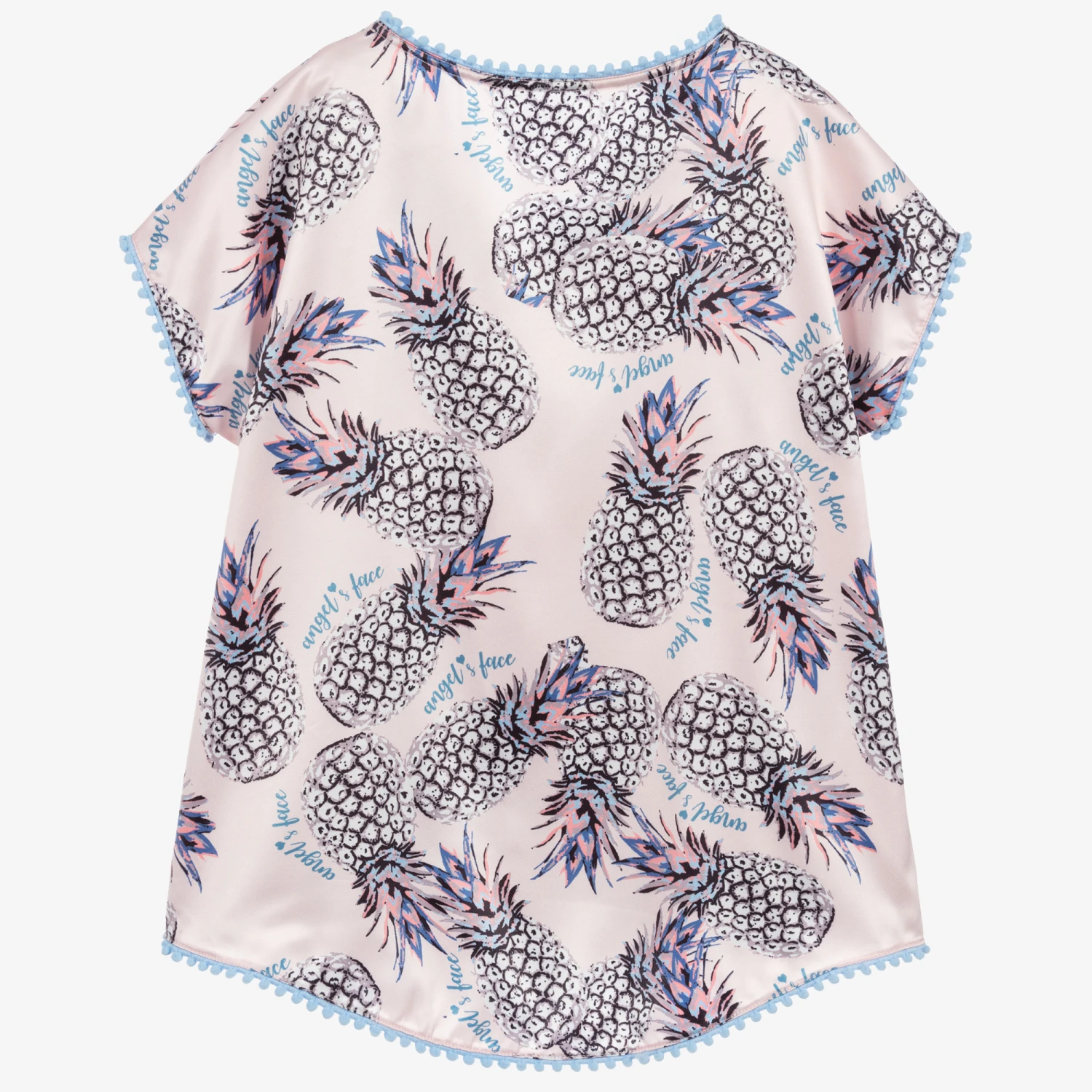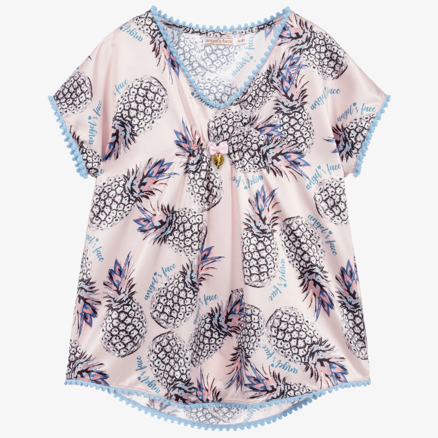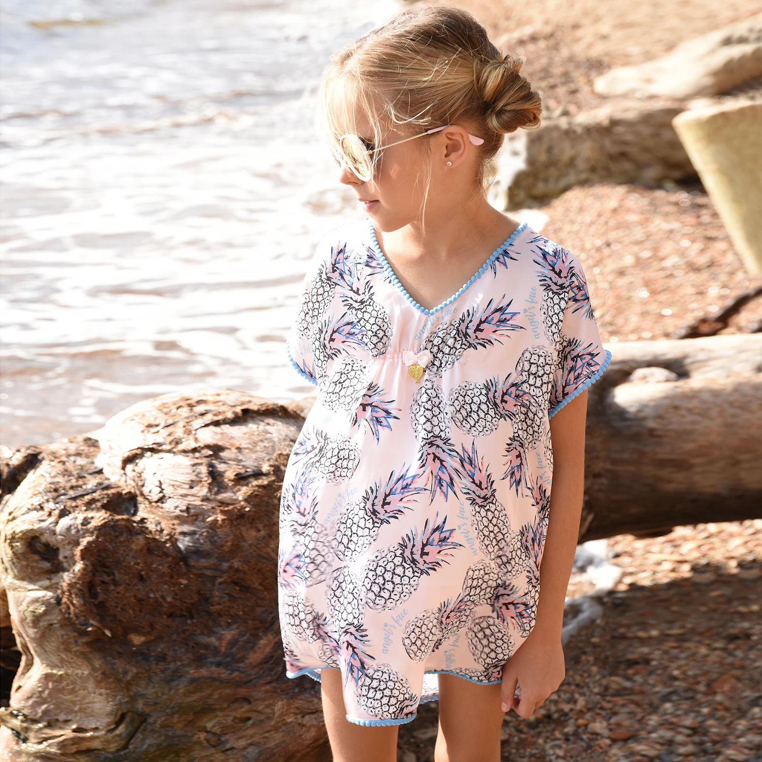 A pretty pink kaftan for girls by Angel’s Face, made from silky, lightweight polyester. This lovely cover-up is ideal for around the beach or pool and has a pretty white pineapple print. The edges are trimmed with fun blue pom-poms and the chest is lightly elasticated.