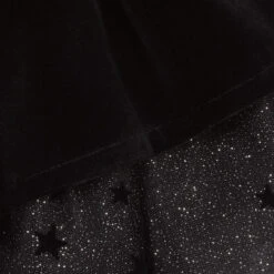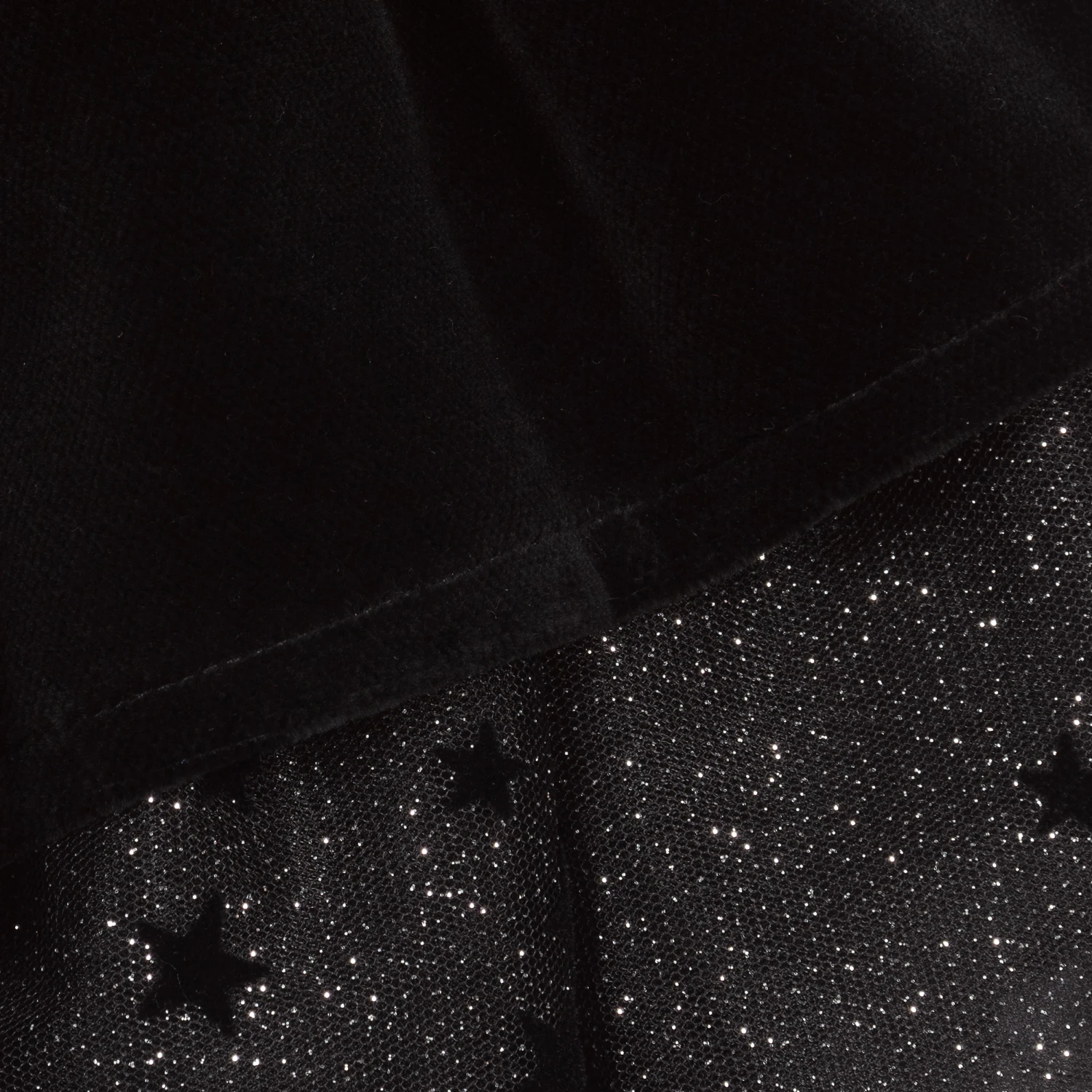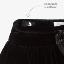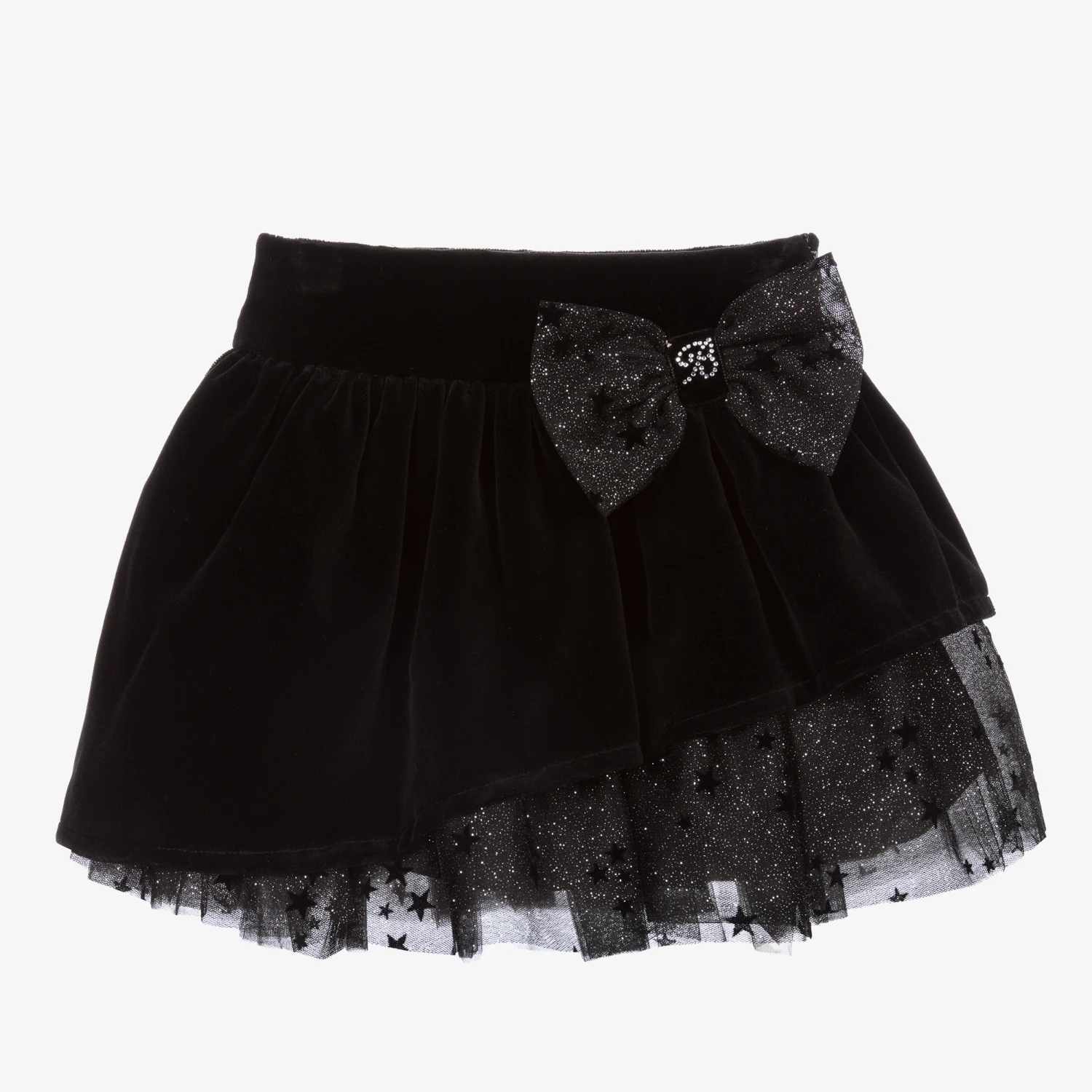 Girls black skirt for girls by Balloon Chic. Made in soft cotton velvet, it has an asymmetrical hem. The skirt is layered with sparkly tulle with flocked black stars for volume and has a cotton lining. There is a matching fixed bow trim on the waistband. It fastens with a side zip and has a useful adjustable waist.