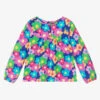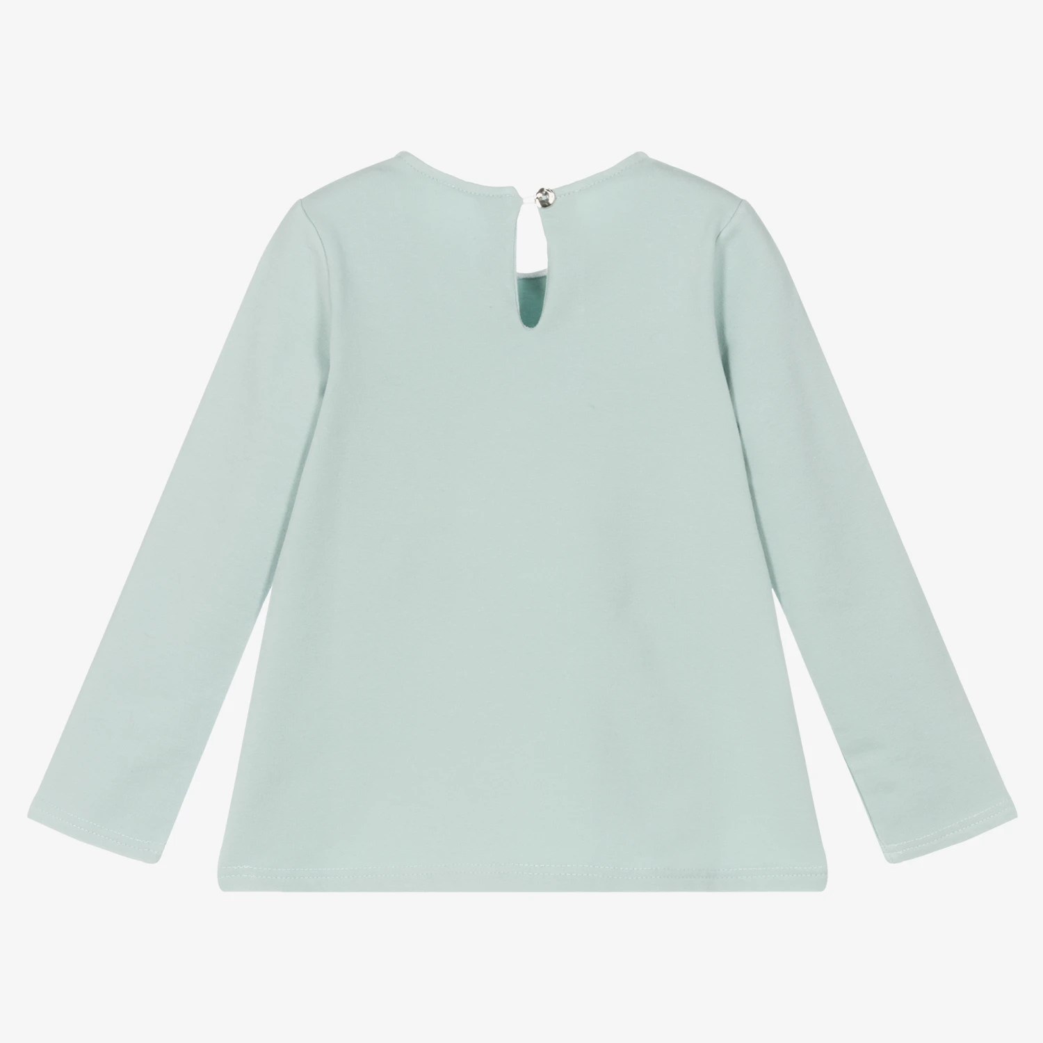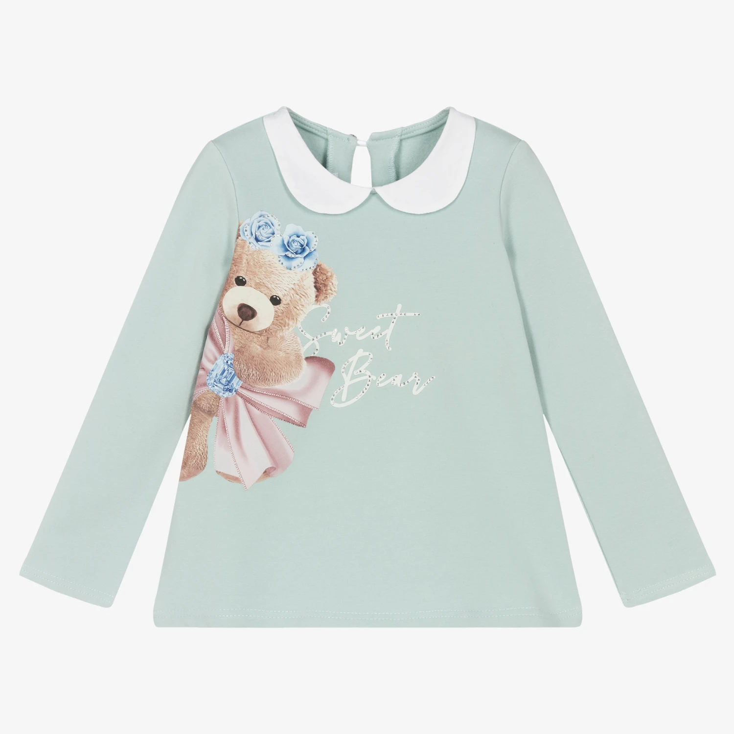 Lovely green long sleeved top for girls by Balloon Chic, made in mid-weight cotton jersey, with a soft fleecy inside. Comfortable to wear, it has a white poplin collar and fastens at the back with a button. A gorgeous ‘Sweet Bear’ motif is printed on the front holding a pink bow, with diamanté detailing adding a touch of sparkle.