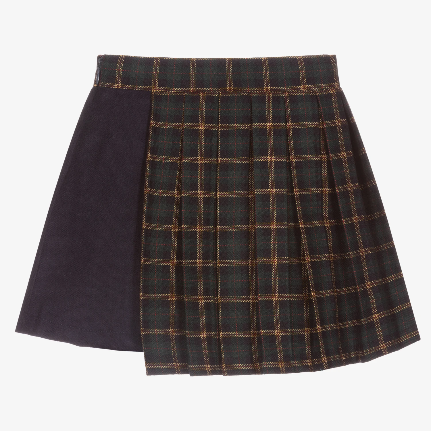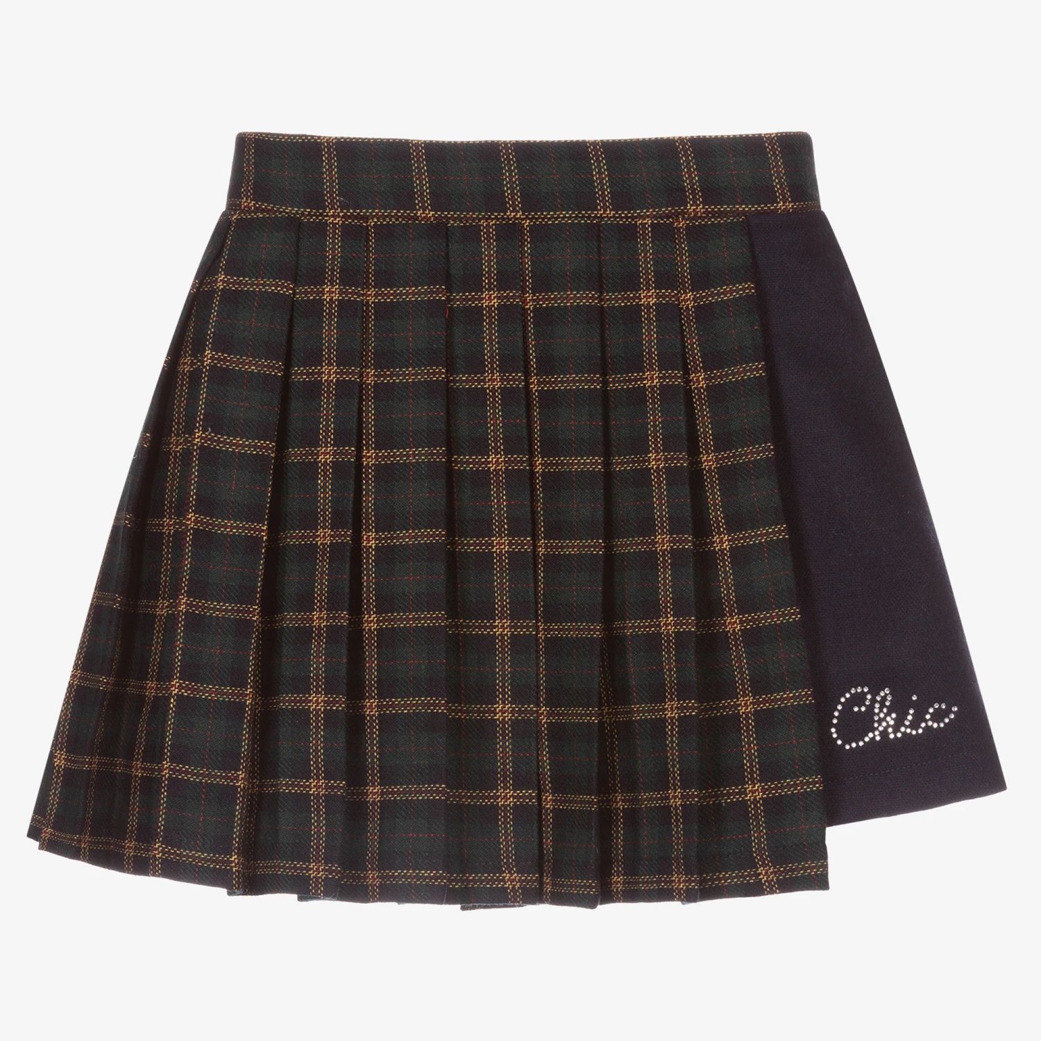 Green pleated tartan skirt for girls by Balloon Chic, made in a soft wool blend. It has a navy blue side panel, embellished with a sparkly diamanté logo. Lined in lightweight cotton, the skirt fastens with a concealed zip on the side.