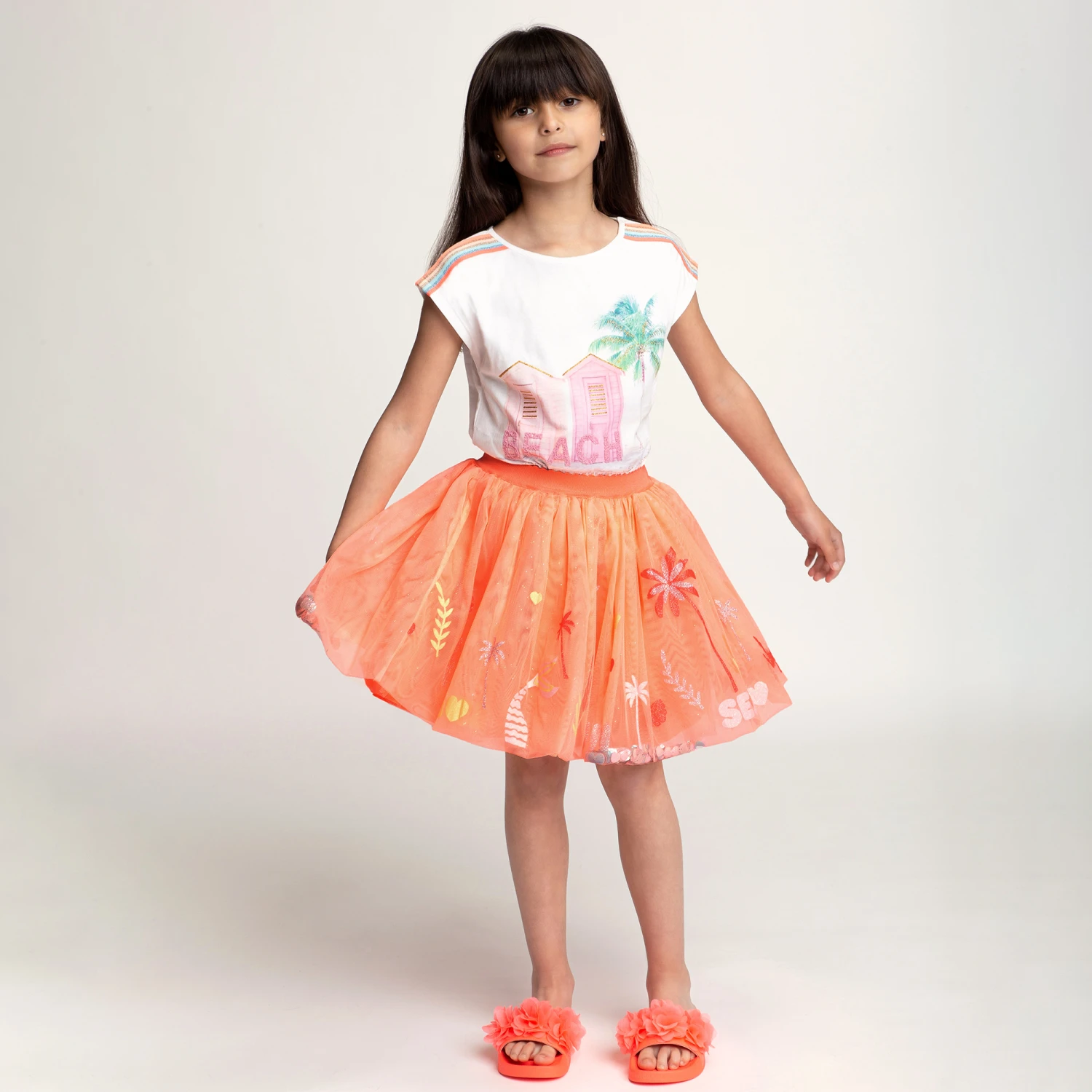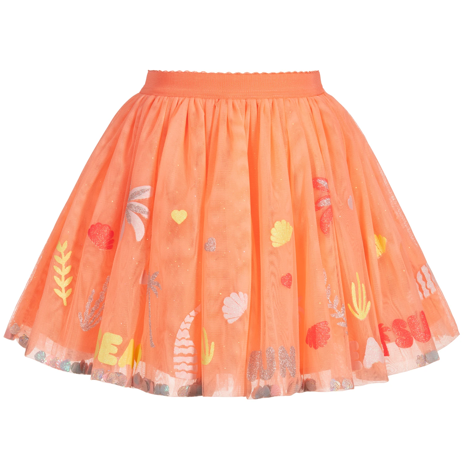 Pretty and fun orange skirt by Billieblush, with sparkling silver and blue shells held between the double top layer of tulle. Full and gathered, it is printed with glittery silver palm trees, yellow and pink shells and the words ‘Sea, Sun, Fun’. Fully lined in lightweight polyester, it has a comfortable elasticated waistband.