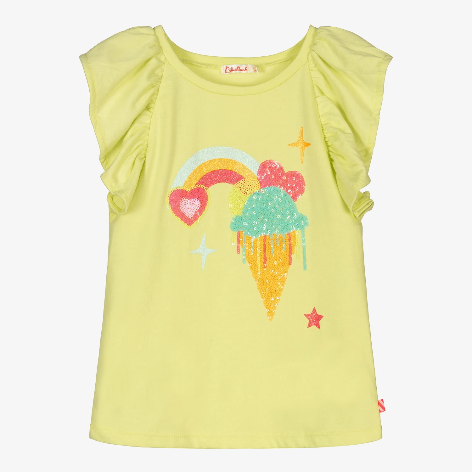 Pale neon yellow T-shirt for girls by Billieblush. Made from soft cotton jersey, it has a neon pink, orange and blue ice cream design in sequins and glitter prints. There are lovely capped sleeves with ruffles and a striped logo tab on the side seam.