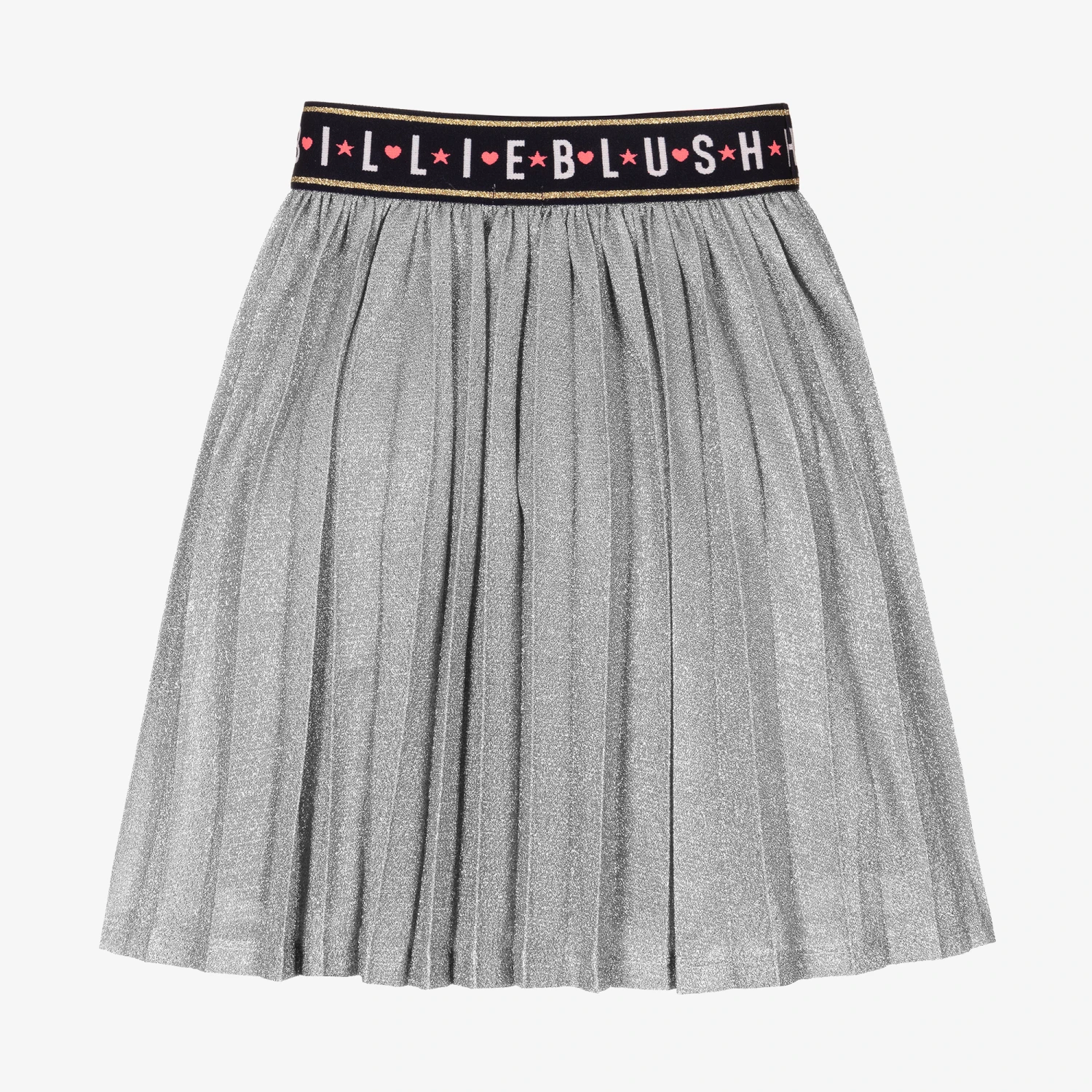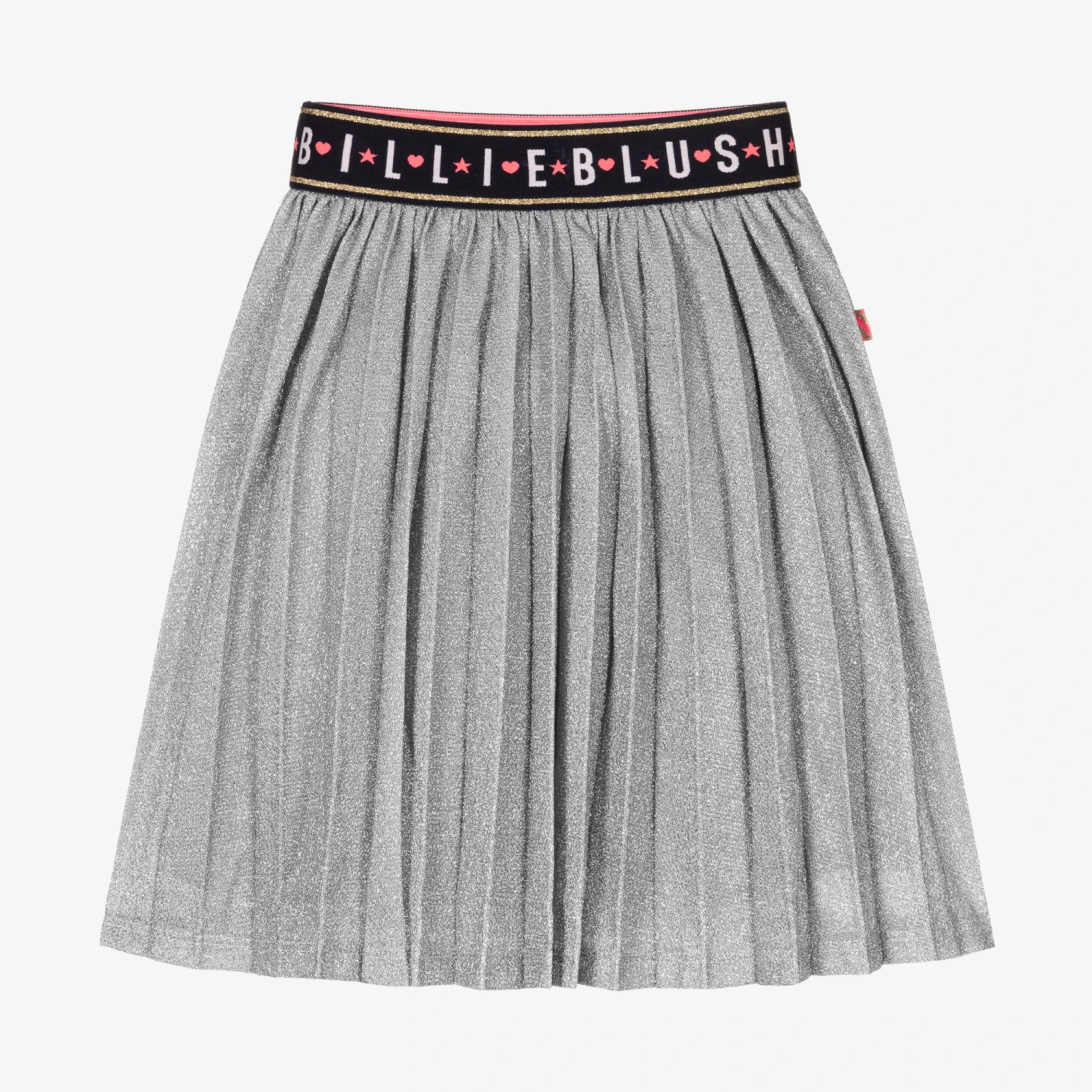 Glittery silver skirt for girls by Billieblush, made in sheer, pleated polyester. It has a comfortable, elasticated waistband with glittery gold stripes, a repeat white logo and neon pink stars and hearts. The skirt is fully lined in soft navy blue viscose for comfort.