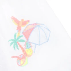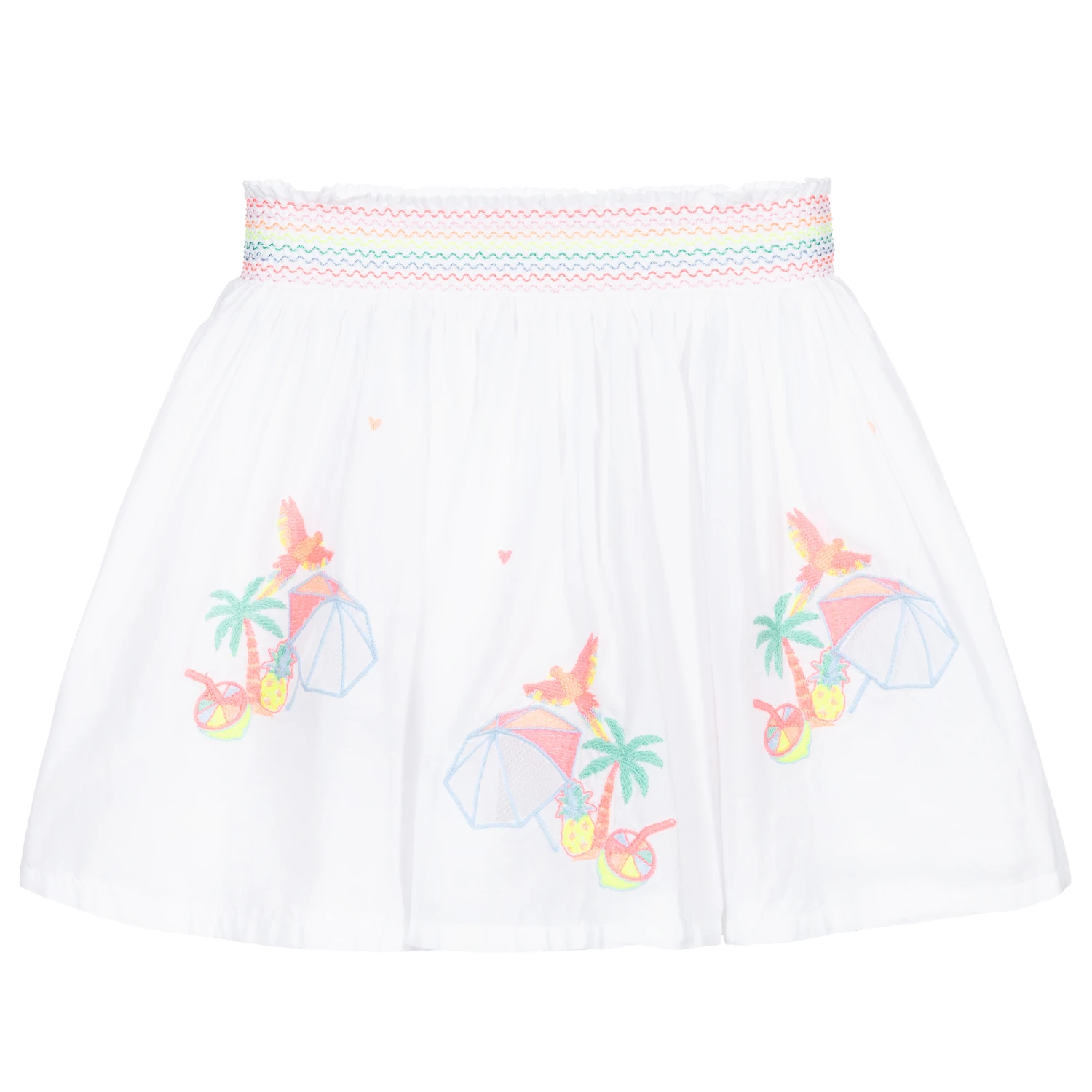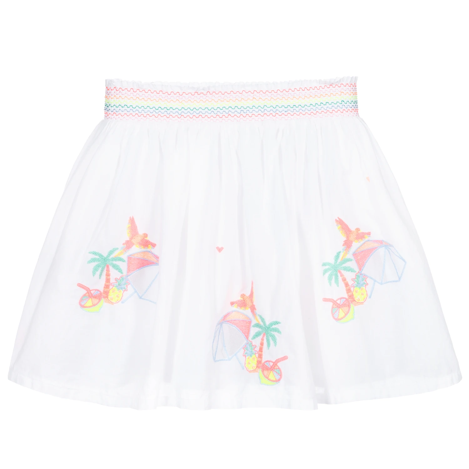 Pretty white skirt for girls by Billieblush, made in a double layer of white cotton voile. It has embroidered tropical designs in colourful neon thread and an elasticated waistband with matching neon embroidery.