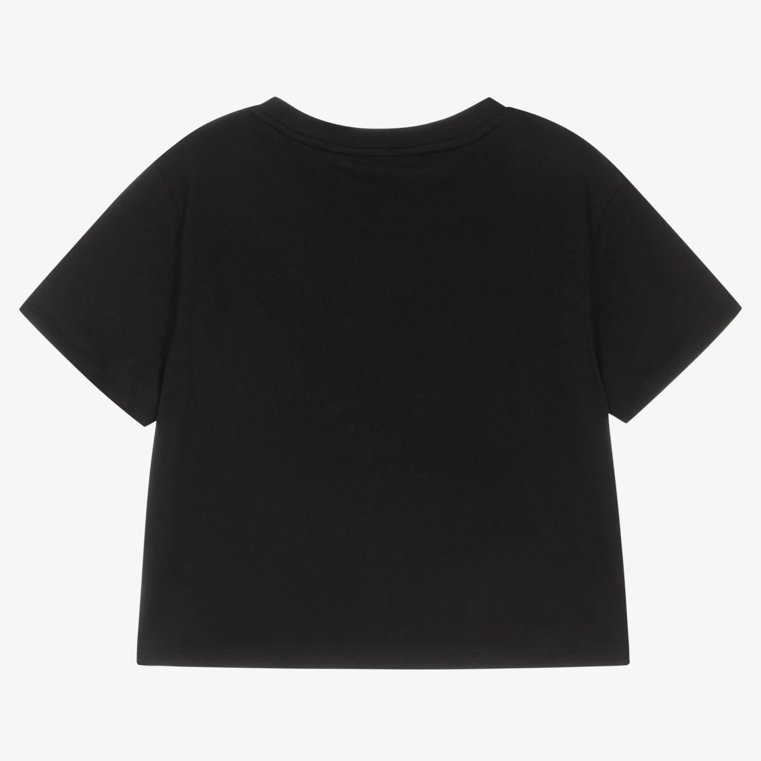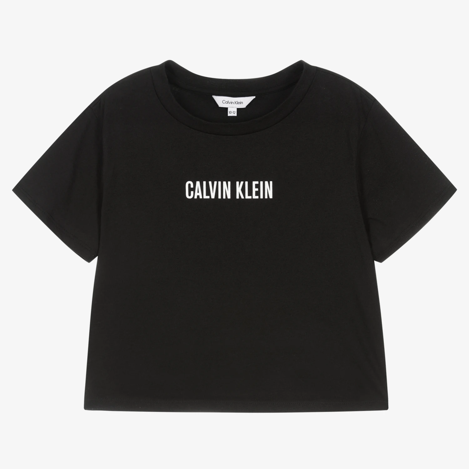 Black cropped T-shirt for girls by American brand, Calvin Klein. Made in comfortable cotton jersey, it has a relaxed fit and a stand-out white logo print across the front.