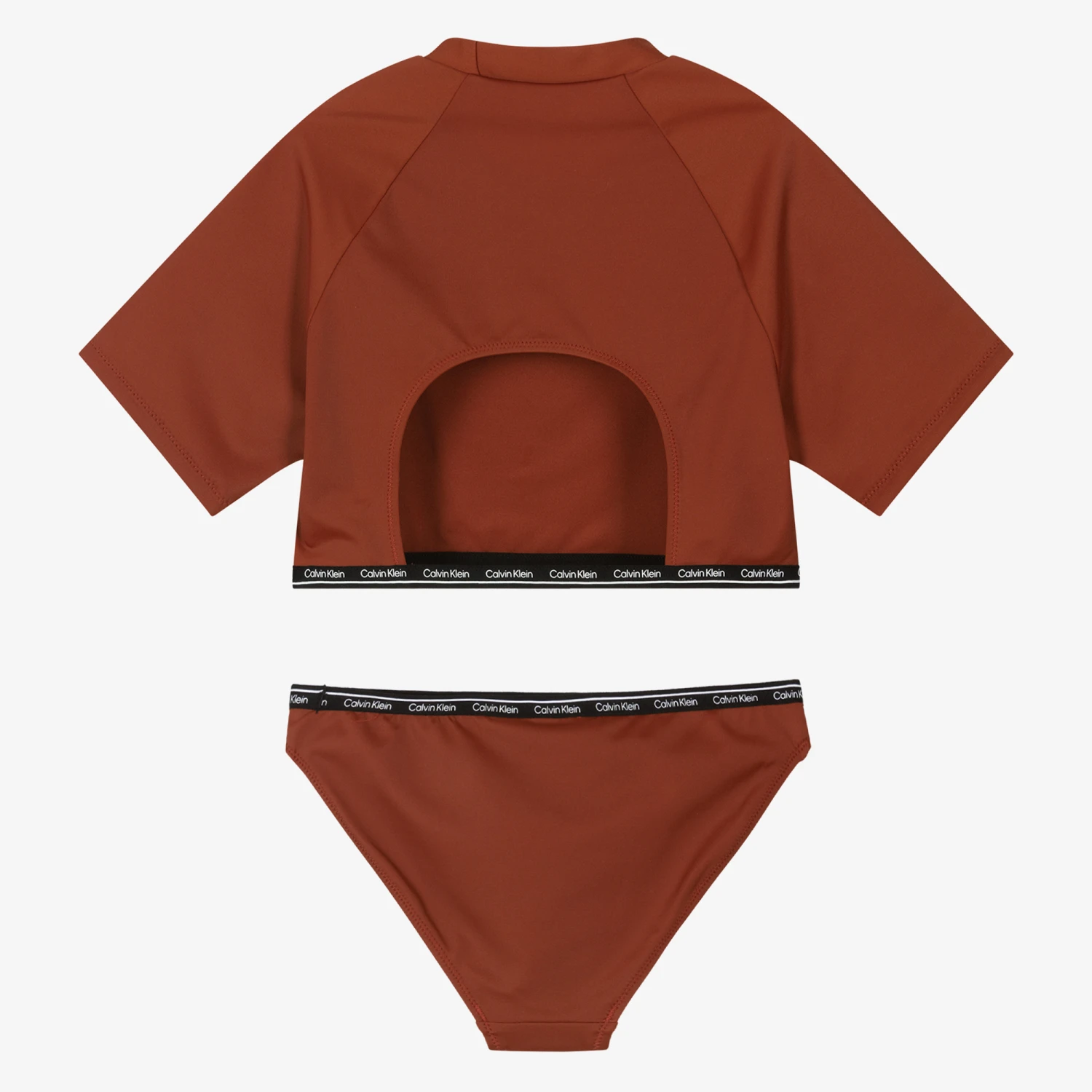 Stylish reddish-brown tankini for girls by Calvin Klein. Using recycled nylon, it is made in stretchy lycra and fully lined for comfort. The top has a cut out detail on the back for a sporty look, and both pieces are trimmed with signature black and white logo tape.