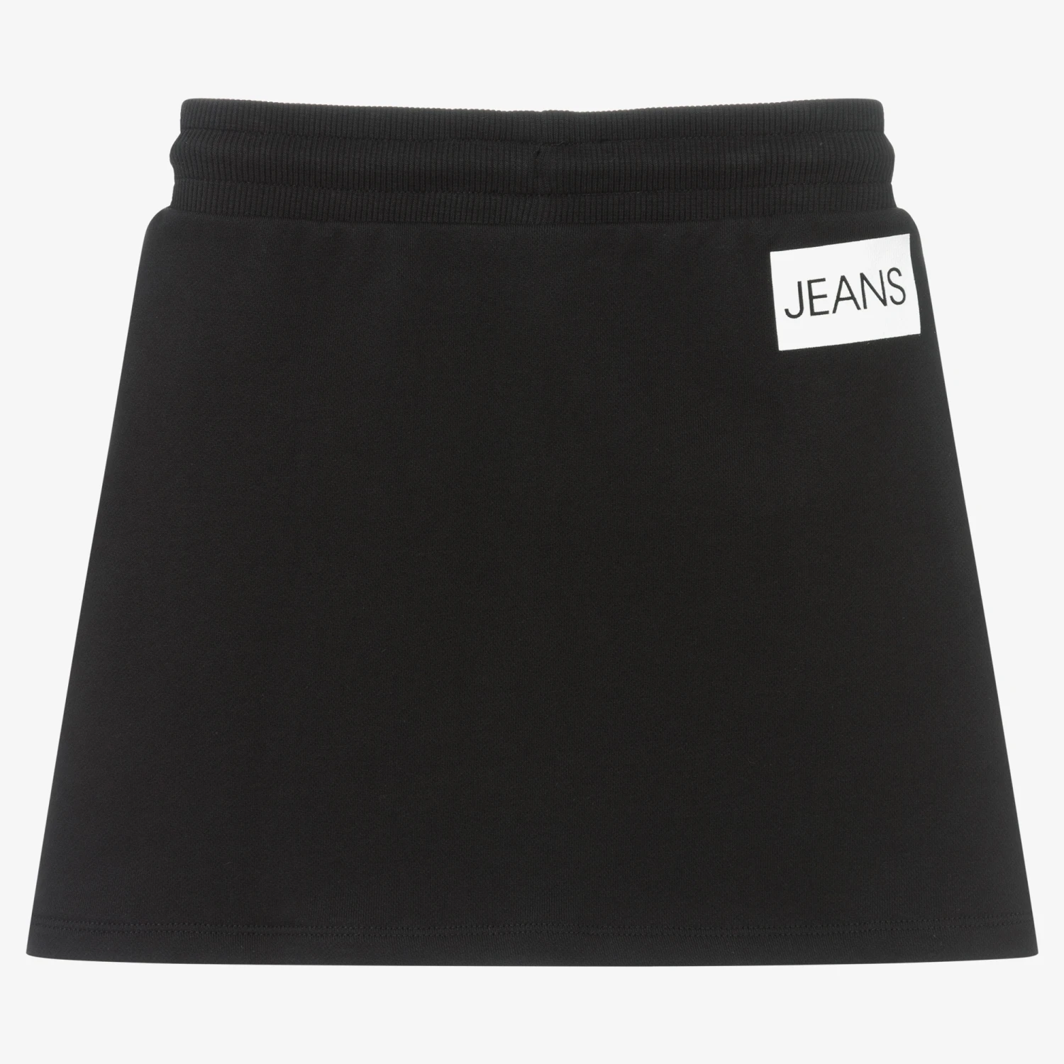 Casual black skirt for girls by Calvin Klein Jeans, made in mid-weight cotton jersey. It has white logo prints on the back and front, with a smaller CK monogram logo at the hip. There are concealed side seam pockets and the elasticated waistband can be adjusted with the drawstring tie.