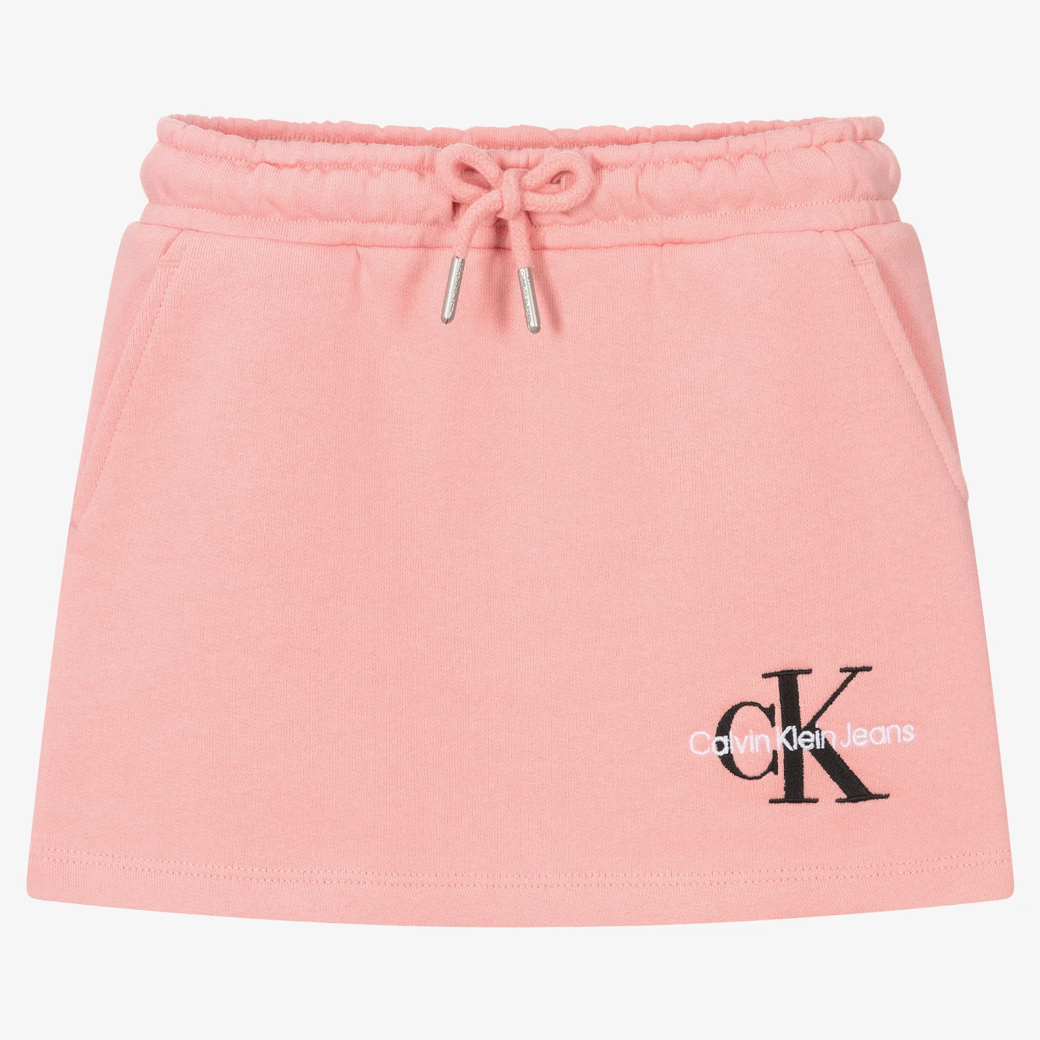 Casual pink skirt for girls by Calvin Klein Jeans, made in soft mid-weight cotton jersey. It has a CK monogram logo embroidered on the front in black and white. There are slanted front pockets and the elasticated waist has drawstring ties to adjust the fit.