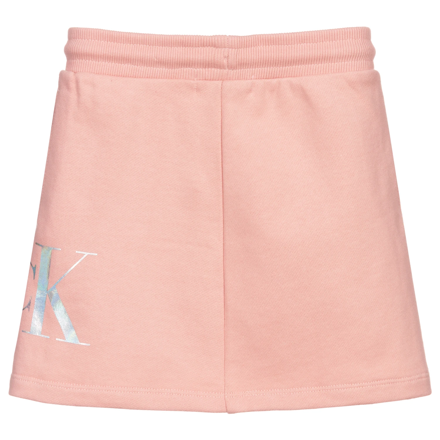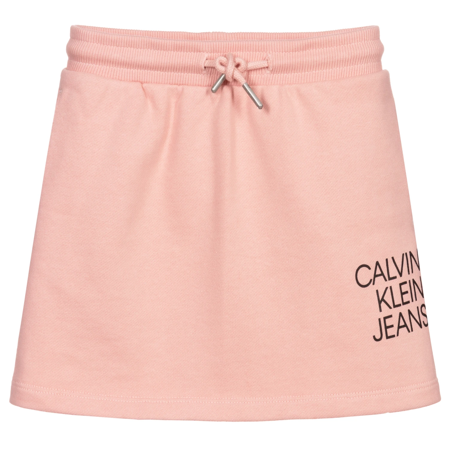 Girls pale pink skirt by Calvin Klein Jeans, made in organic cotton jersey. It has a silver and black logo print, and an elasticated drawstring waistband. There are useful pockets on the hips.