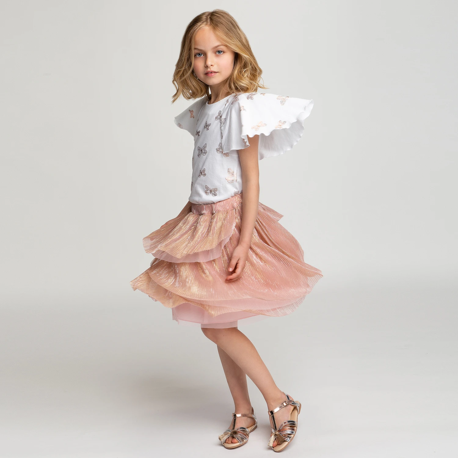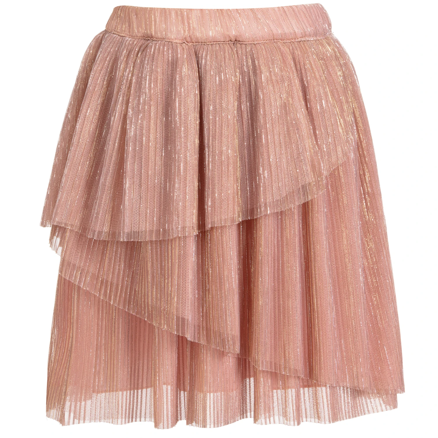 Girls charming blush pink skirt with shiny gold an silver thread, by Carrément Beau. Made from layers of super soft tulle, it has a comfortable cotton lining.