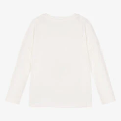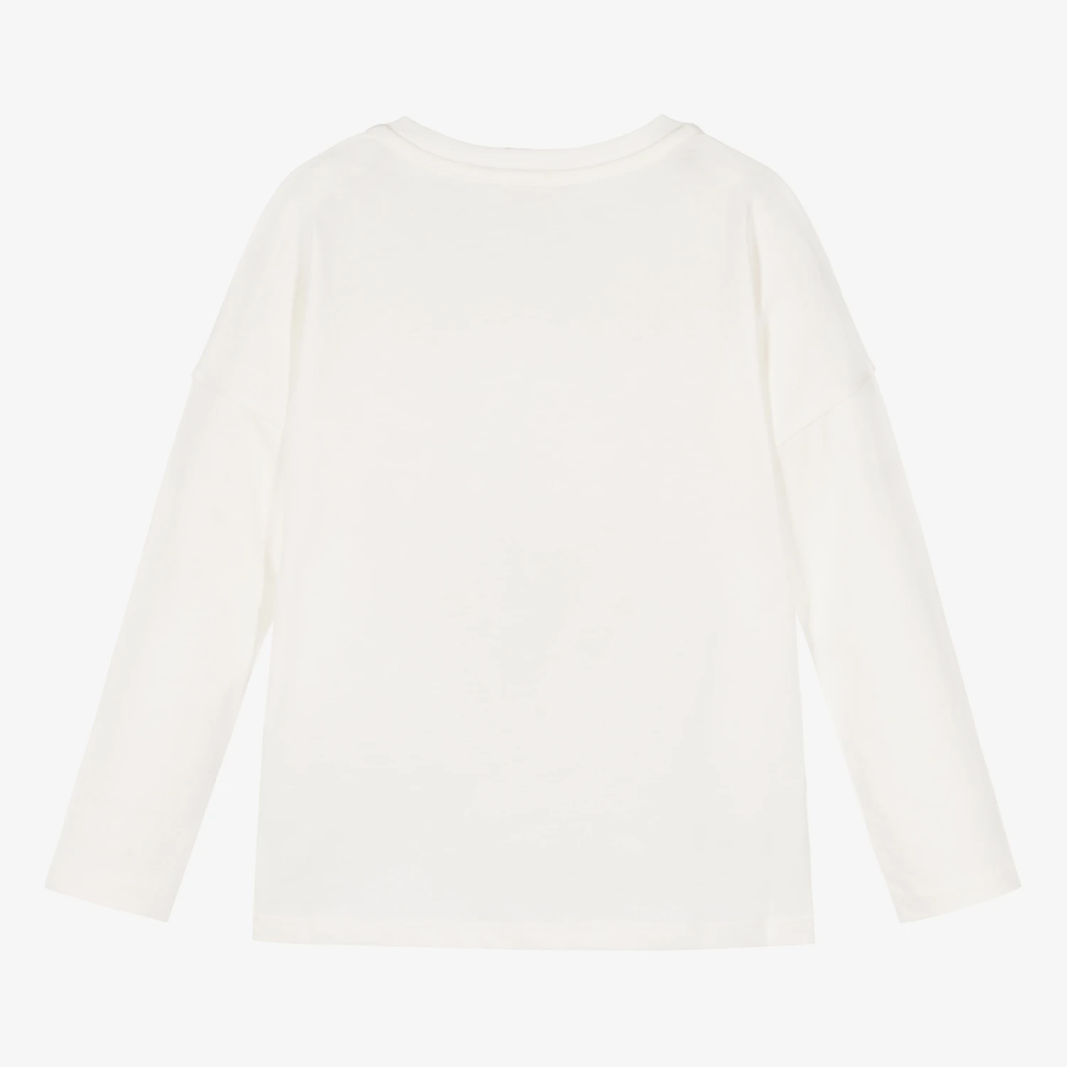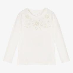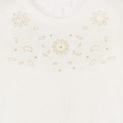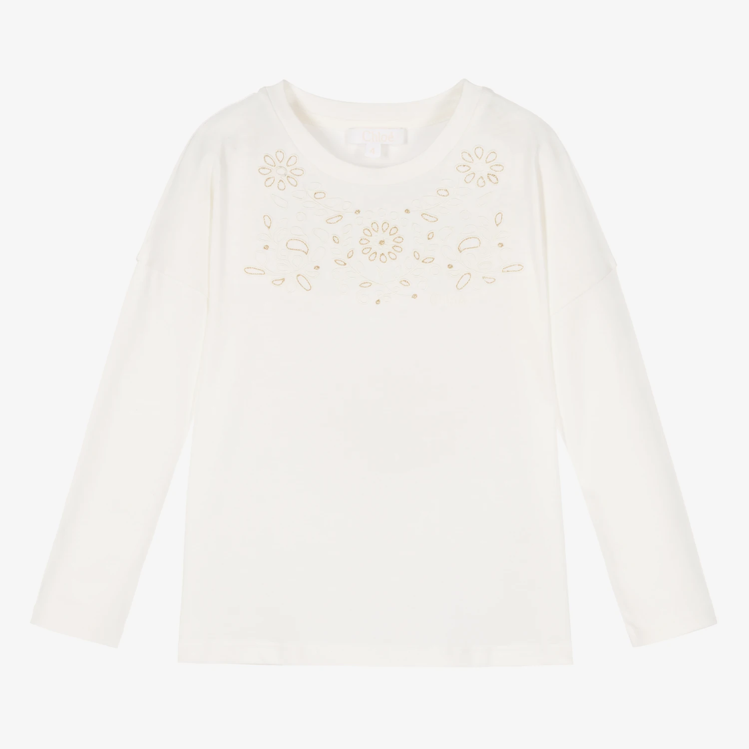 Ivory top for girls by luxury French designer Chloé. The front is intricately embroidered with floral details and the brand’s logo in ivory and gold.