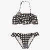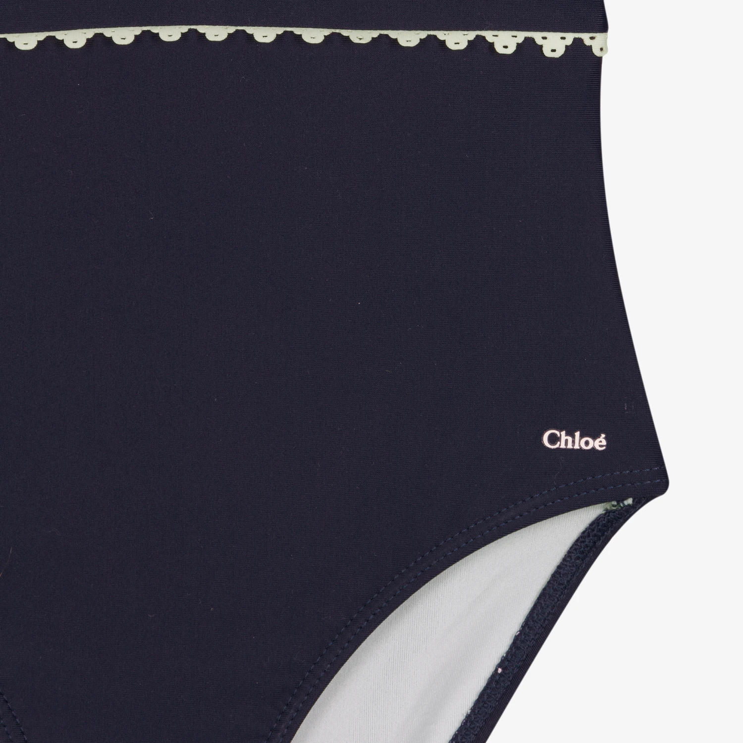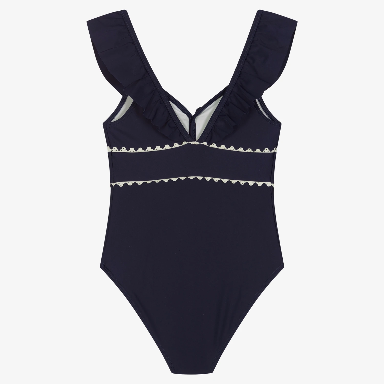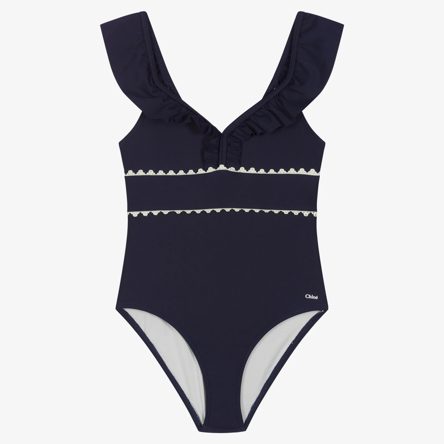 A navy blue swimsuit for girls from luxury label ChloĆ©, made and lined in silky-soft fabric. This chic swimwear piece is designed with a stylish V-shaped neckline, ivory scalloped trims with cut-out details and ruffled edges across the shoulder straps. The French brand’s logo is stamped on the front in ivory for a subtle designer detail.