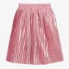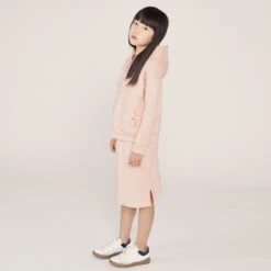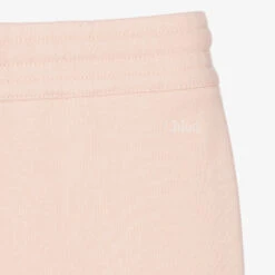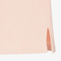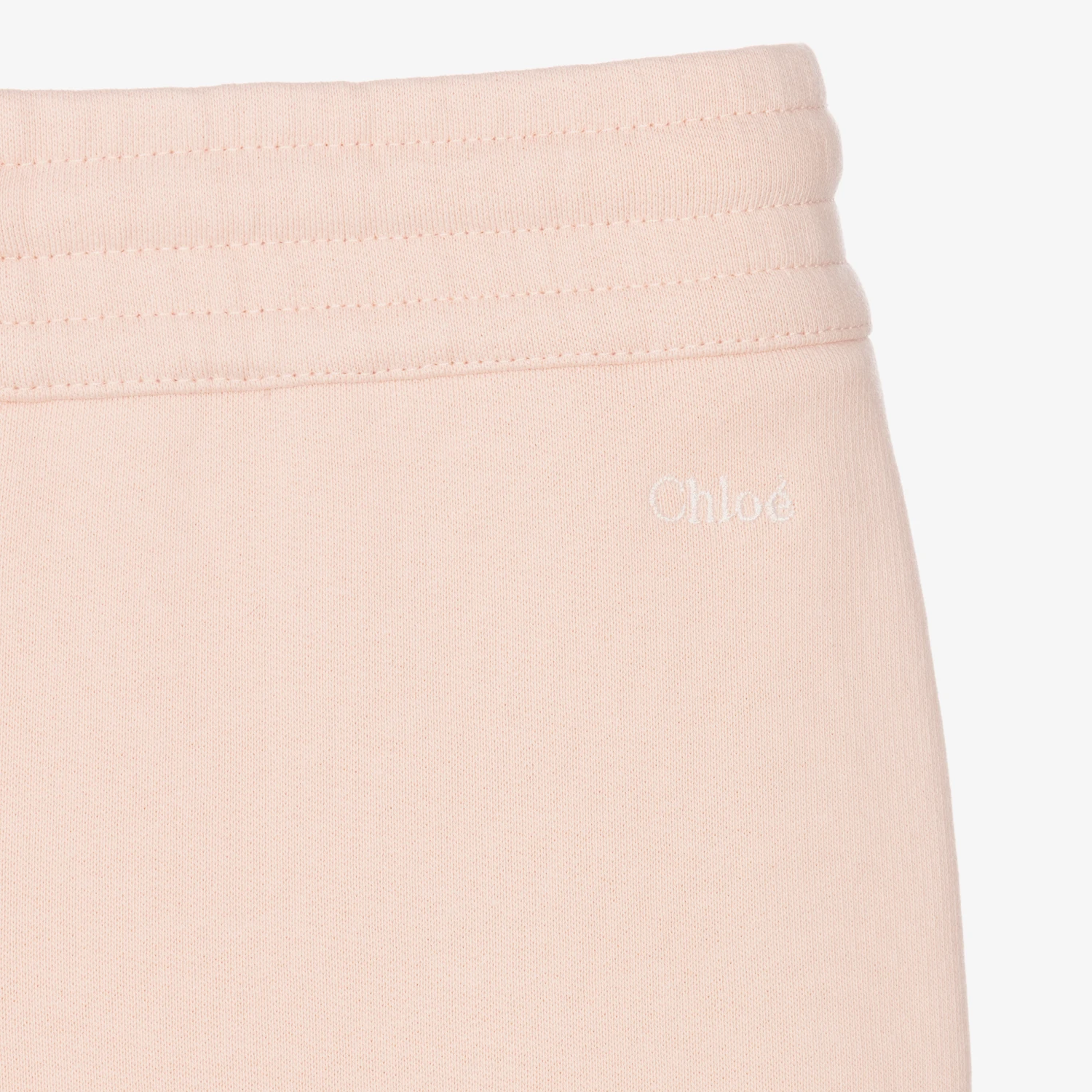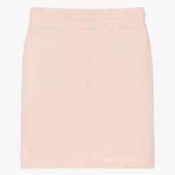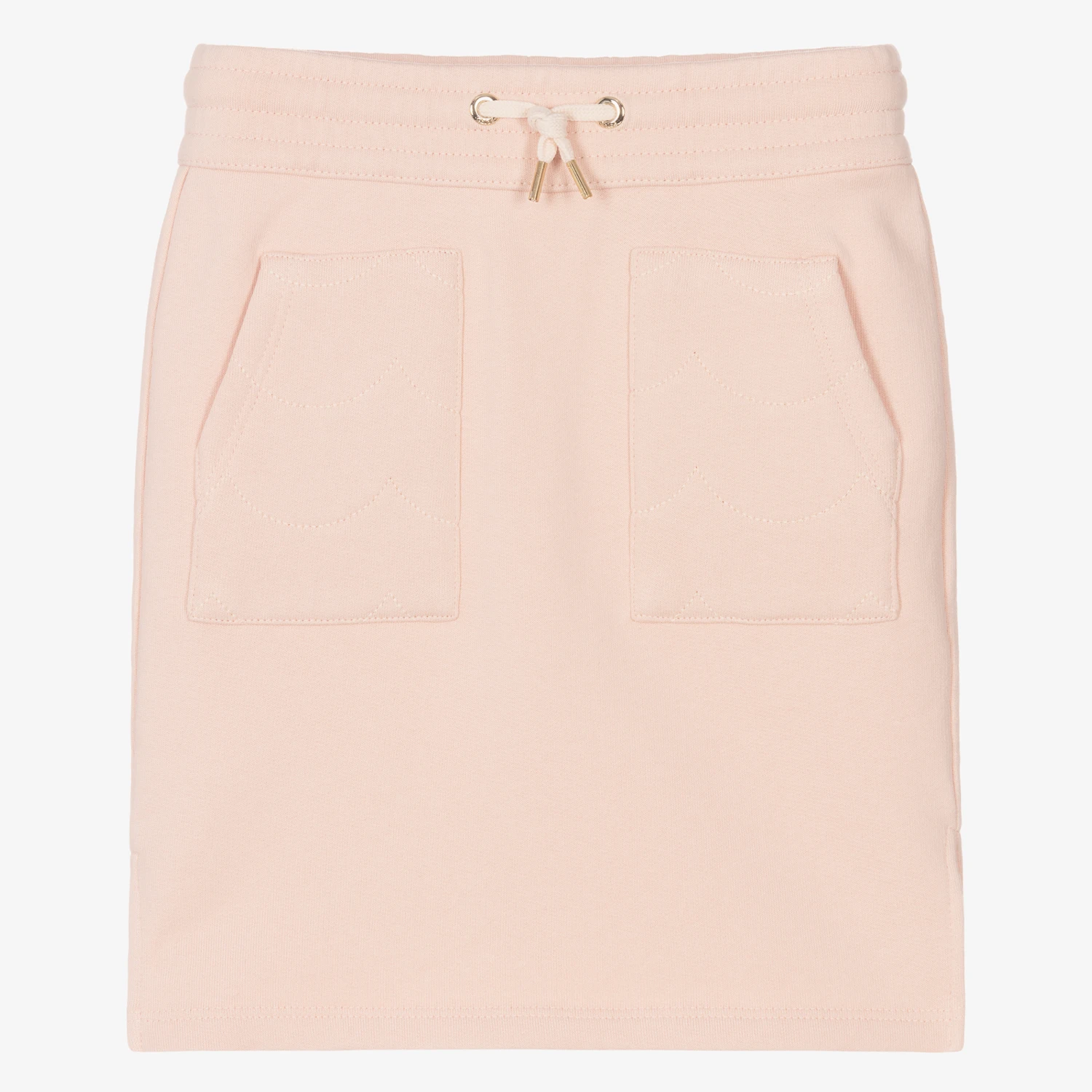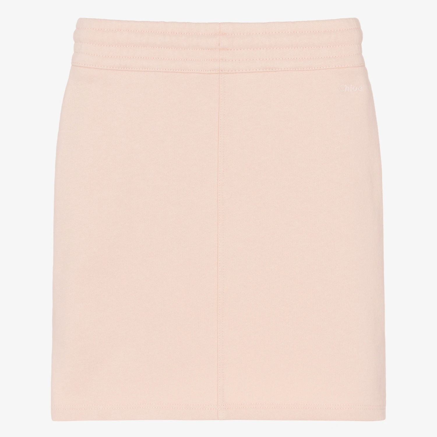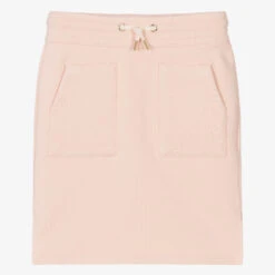 Pale pink skirt for girls by luxury French designer ChloĆ©. Made in soft organic cotton sweatshirt jersey, the front has front patch pockets embroidered with chic scalloping. It has side seam slits and a drawstring waistband with gold metal branded tips. The brand’s logo is discreetly embroideredĀ on the back under the waistband.