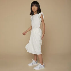 Lovely Mini-me skirt for girls by luxury French designer Chloé. Fully lined, it is made in lightweight, off-white crêpe with glittery gold and silver stripes. There is a frilled trim down the front with shiny gold logo button fastenings.