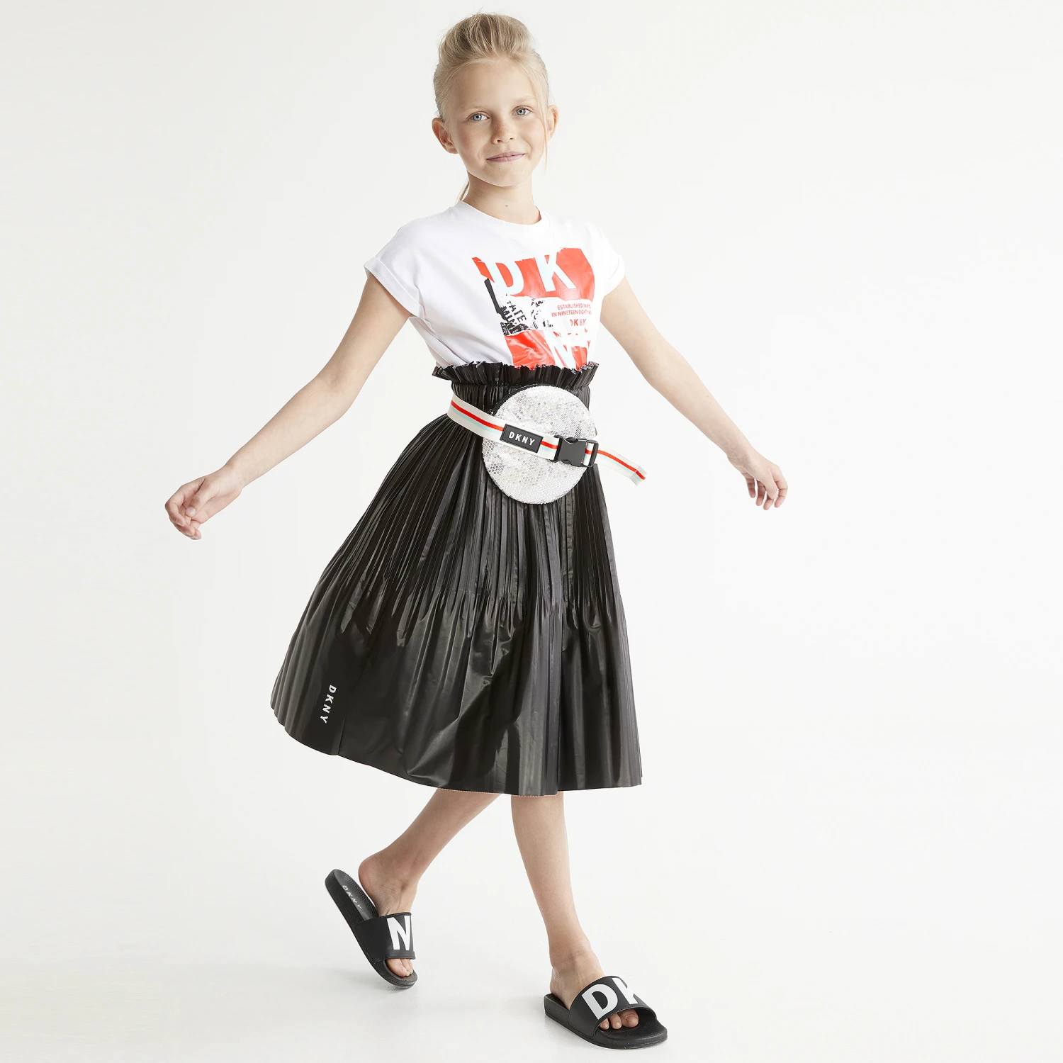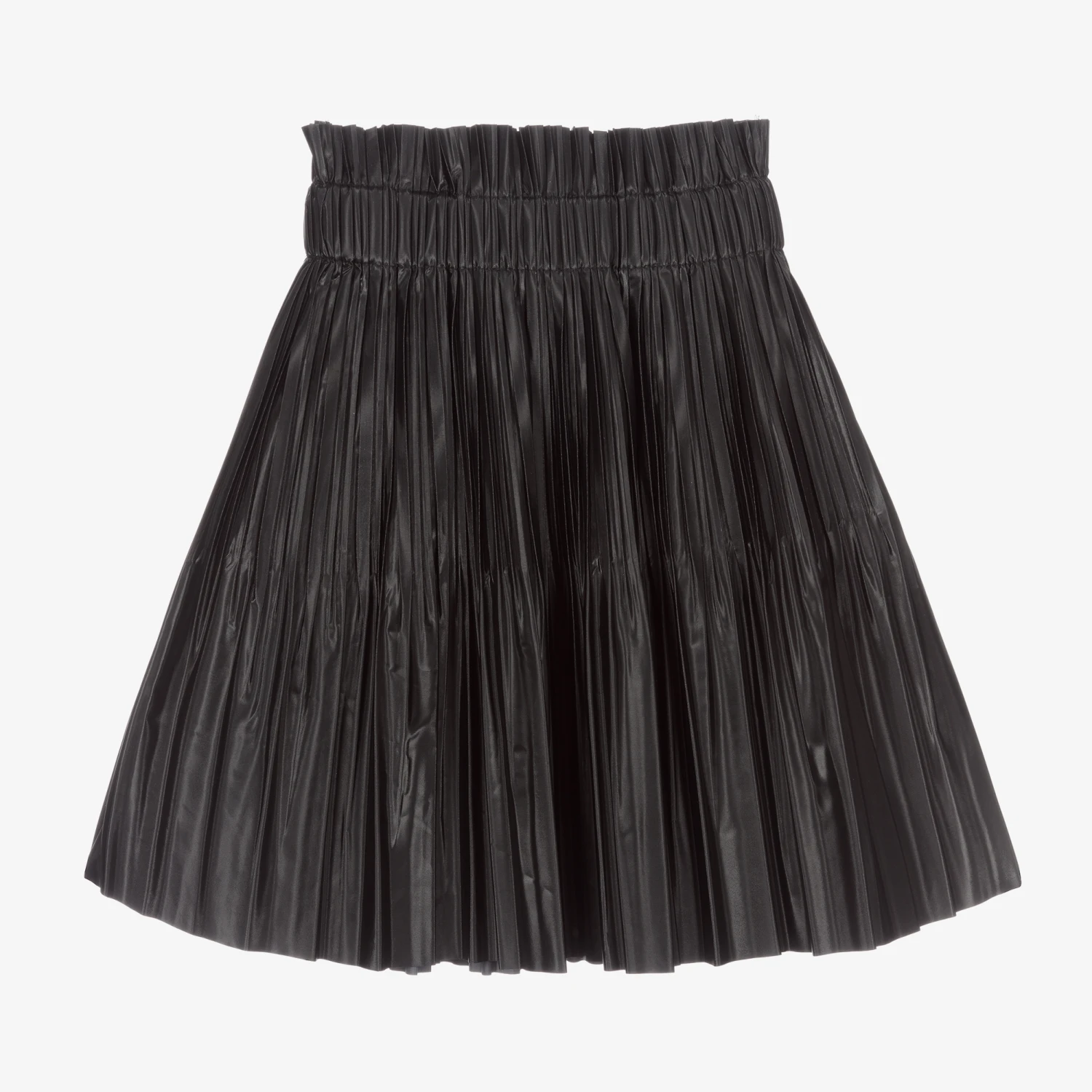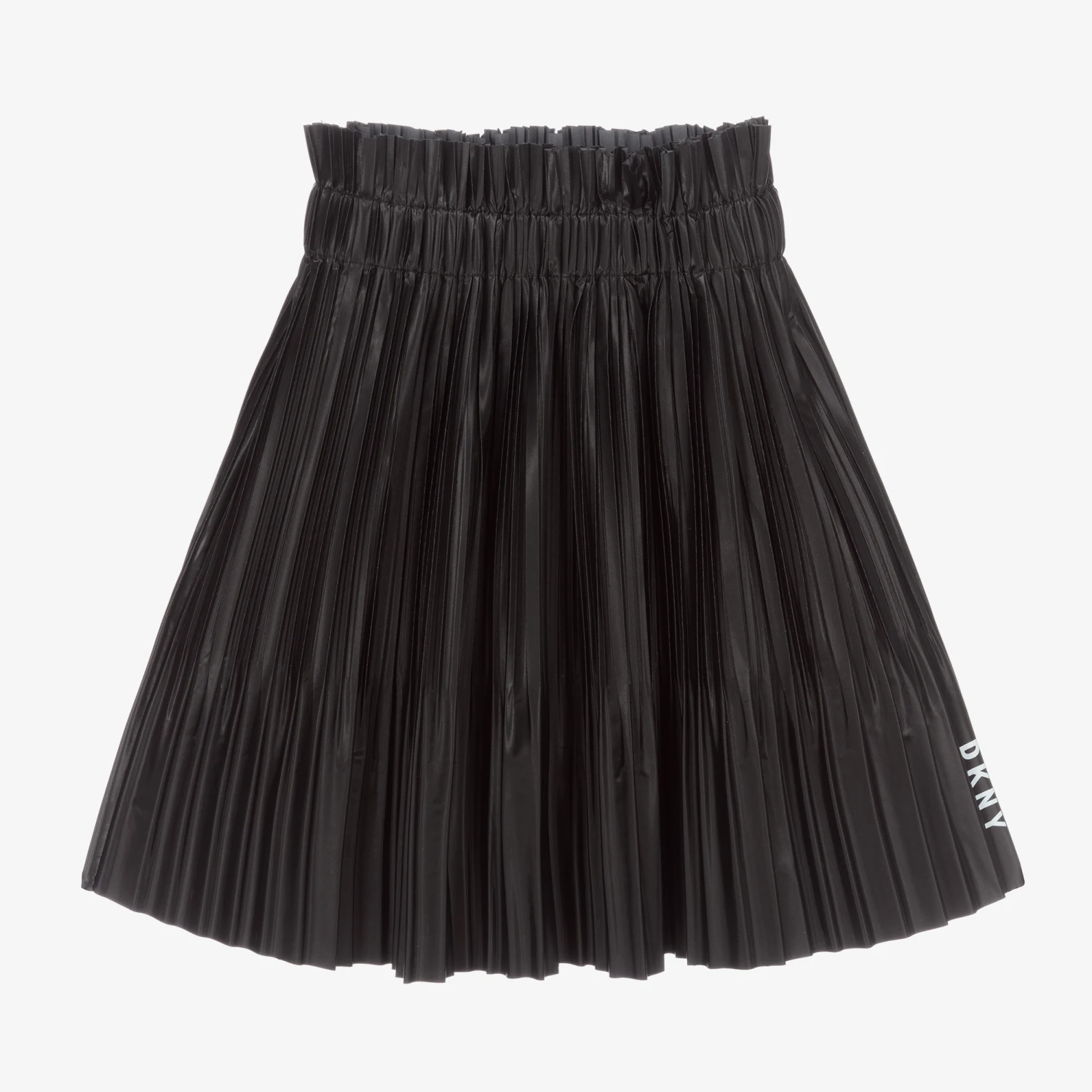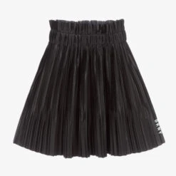 Black pleated skirt for girls by DKNY. Made in silky and lightweight fabric with a pearlised sheen, this modern design features a stretchy ruffle waistband, a raw-edged hemline and logo print.