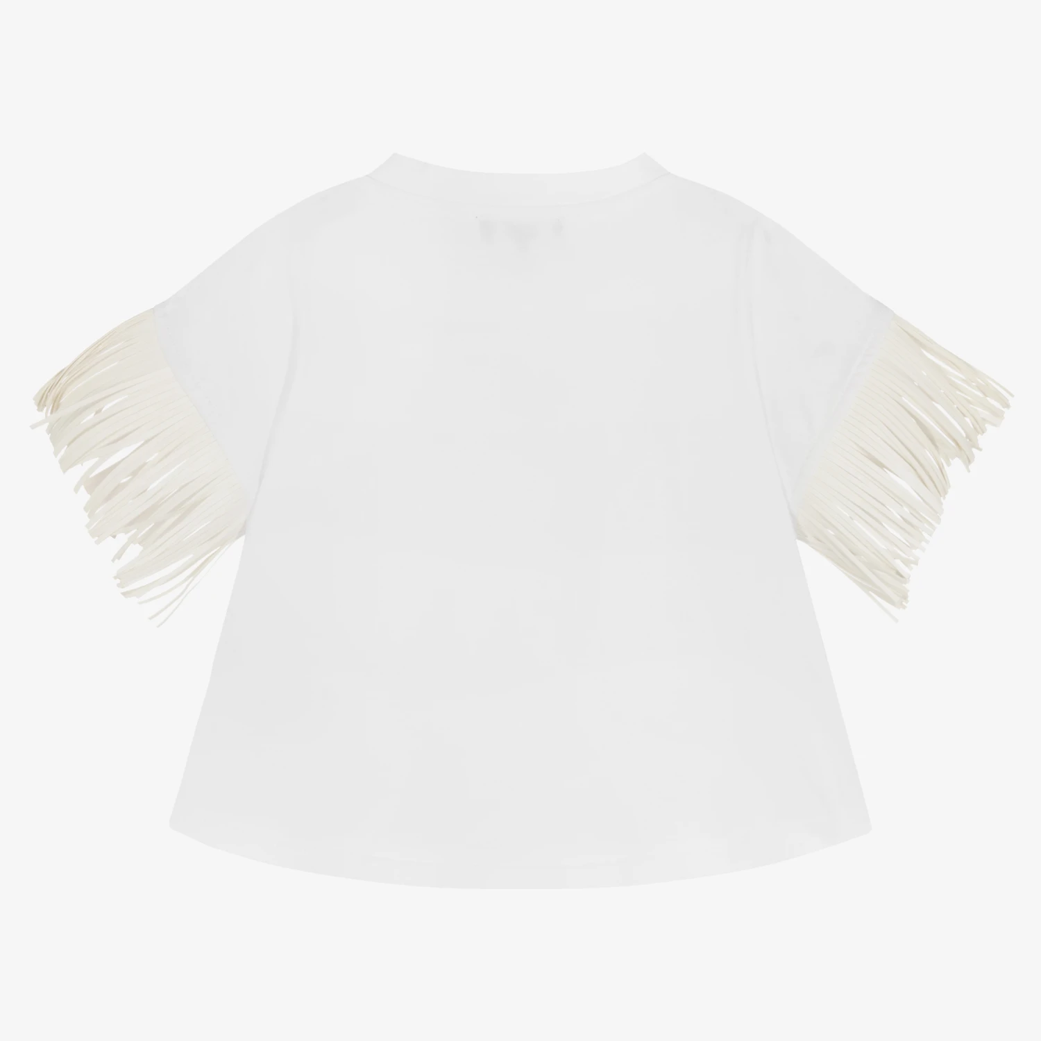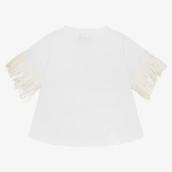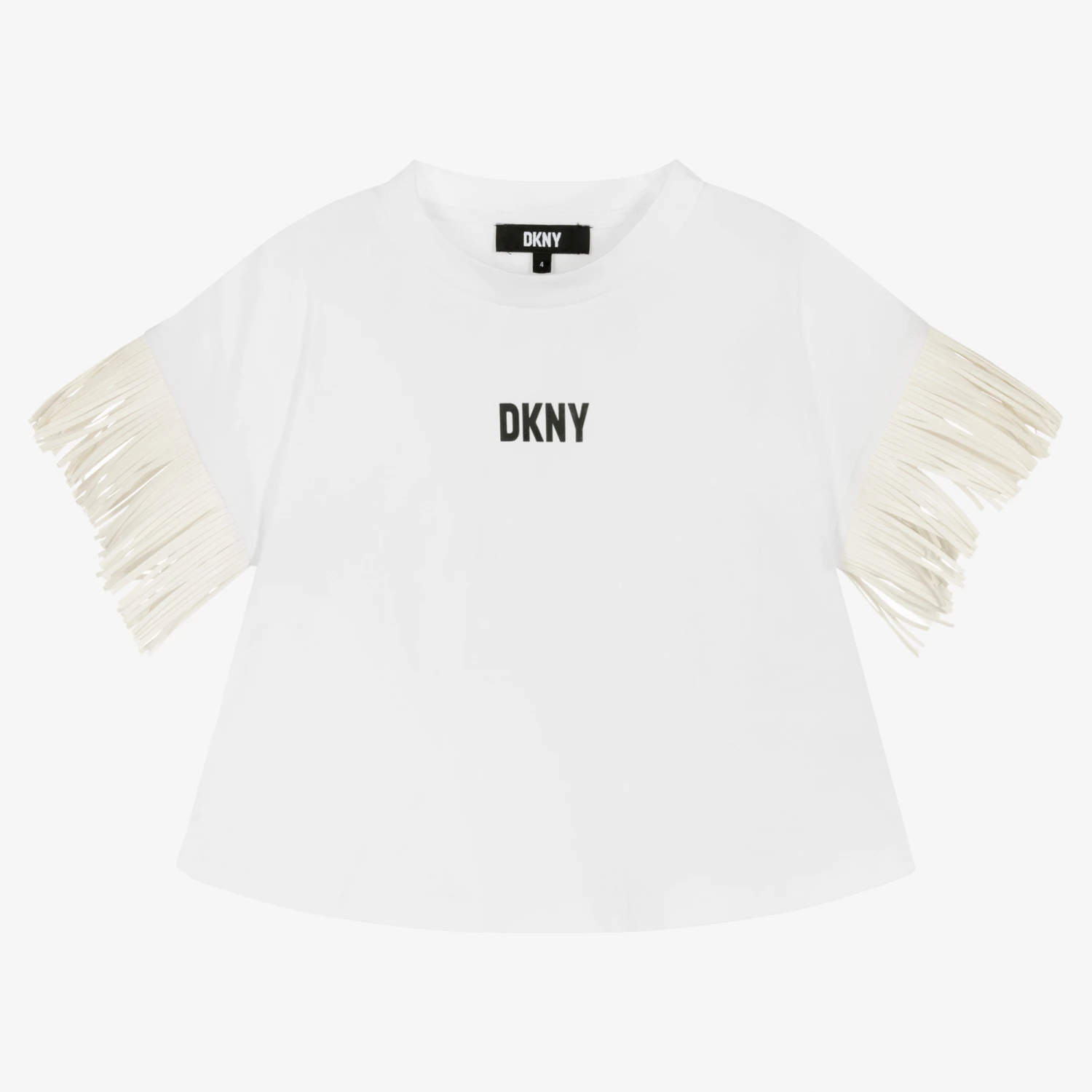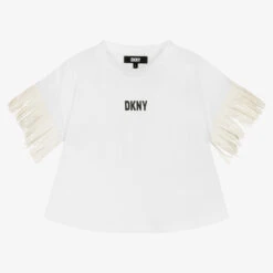 White T-shirt for girls by DKNY, made in the softest cotton jersey. Cool and edgy, it has a white black print on the front, with fringed faux leather trims and piping down the side.