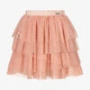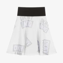 Ivory jersey skirt for girls by American brand DKNY, with an all-over logo design in a shiny iridescent silver print. Soft and silky, this trapeze-shaped skirt has a wide black, elasticated waistband with a black and white branded zip fastening on the front.