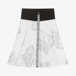 Ivory jersey skirt for girls by American brand DKNY, with an all-over logo design in a shiny iridescent silver print. Soft and silky, this trapeze-shaped skirt has a wide black, elasticated waistband with a black and white branded zip fastening on the front.
