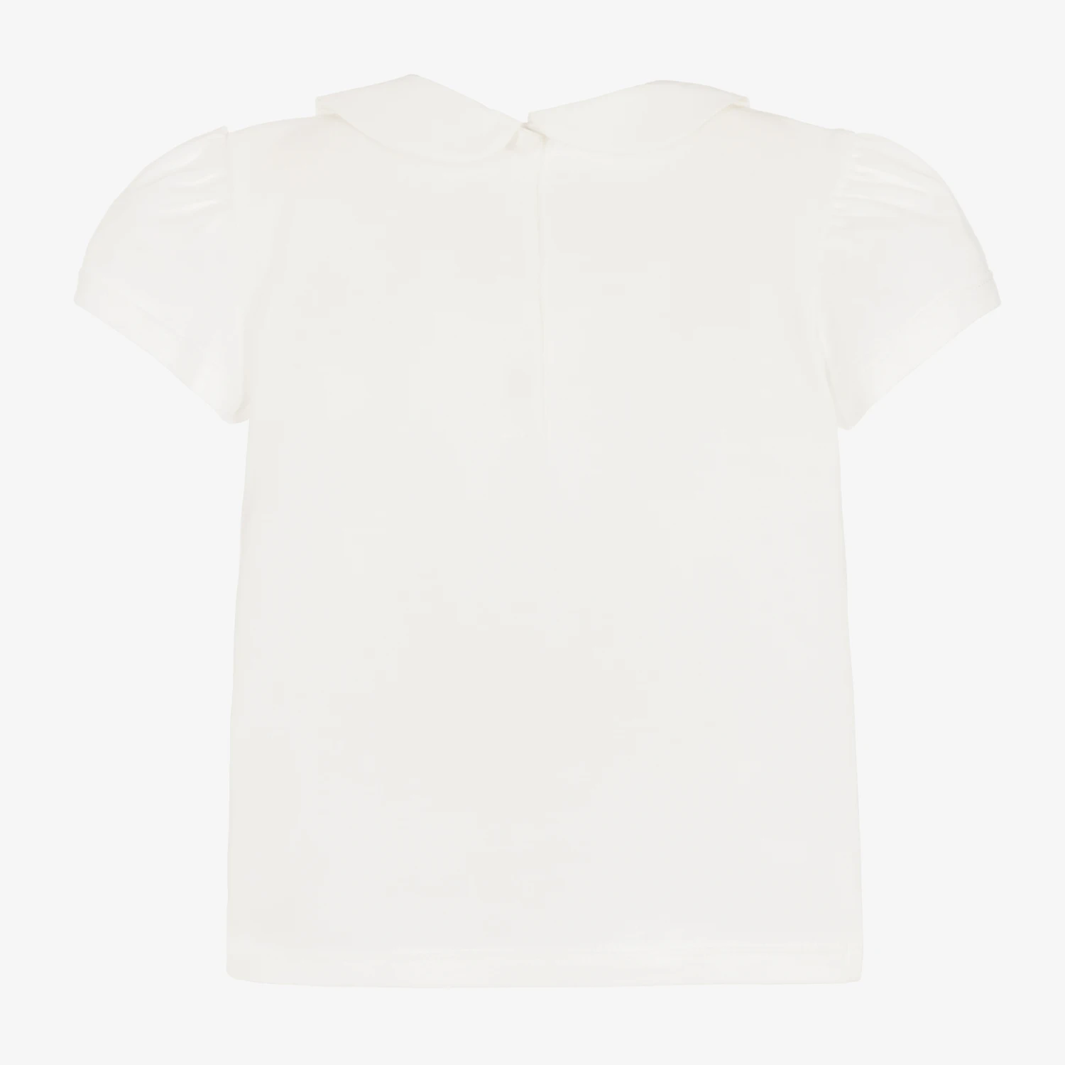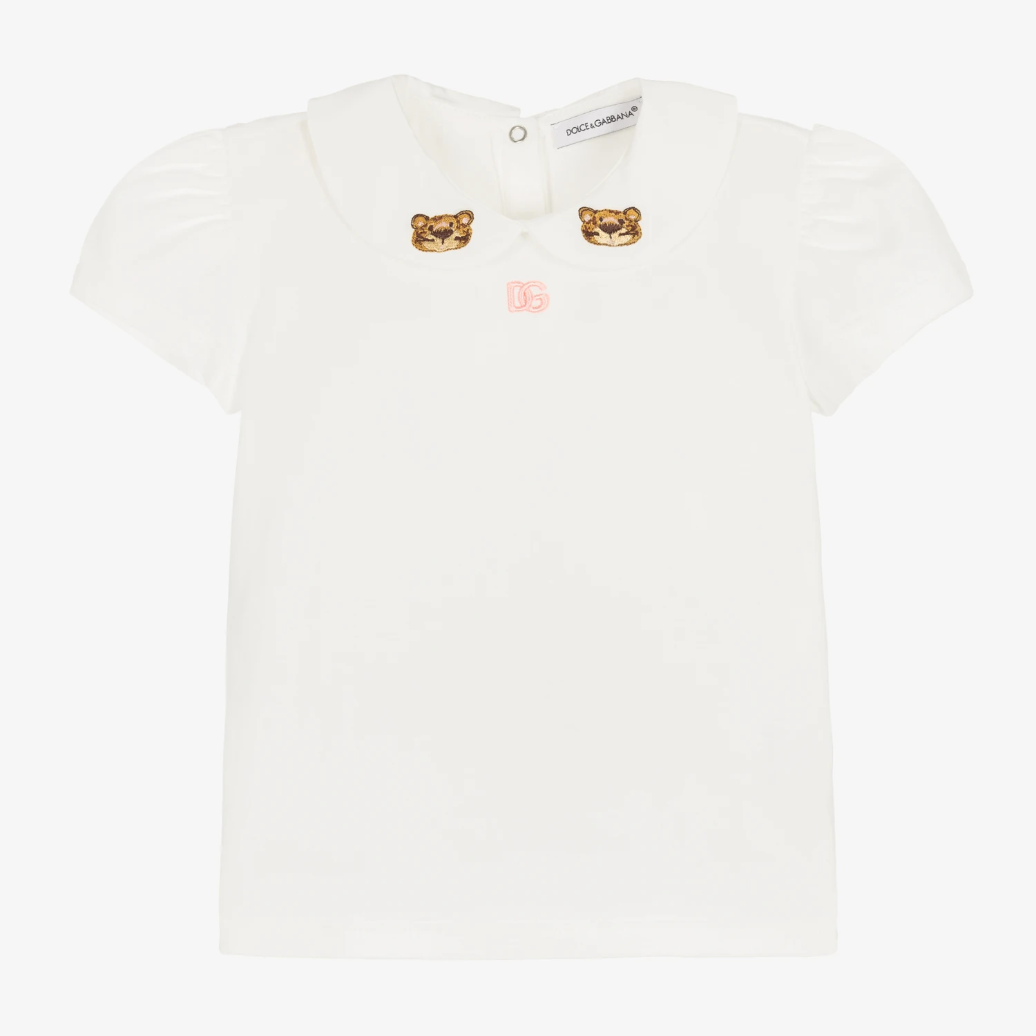 A classic ivory T-shirt for little girls by Italian luxury brand Dolce & Gabbana, made from soft cotton jersey. With a traditional feel, this signature piece has a rounded poplin collar with sweet leopard motifs embroidered on the front. There is also a small pink crossover DG logo embroidered on the chest. The shoulders are gently gathered and popper fastenings are neatly concealed on the back to help with dressing.