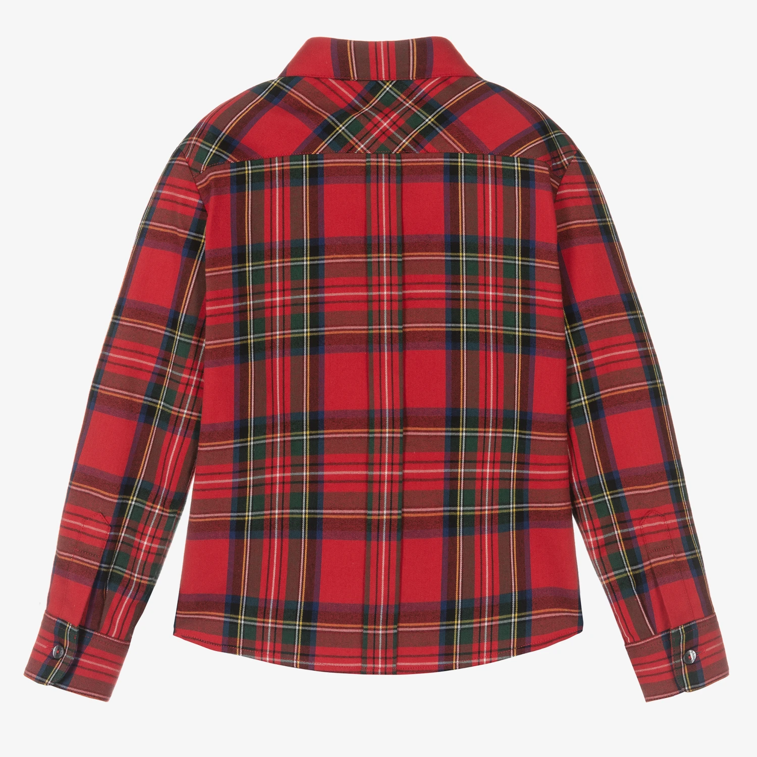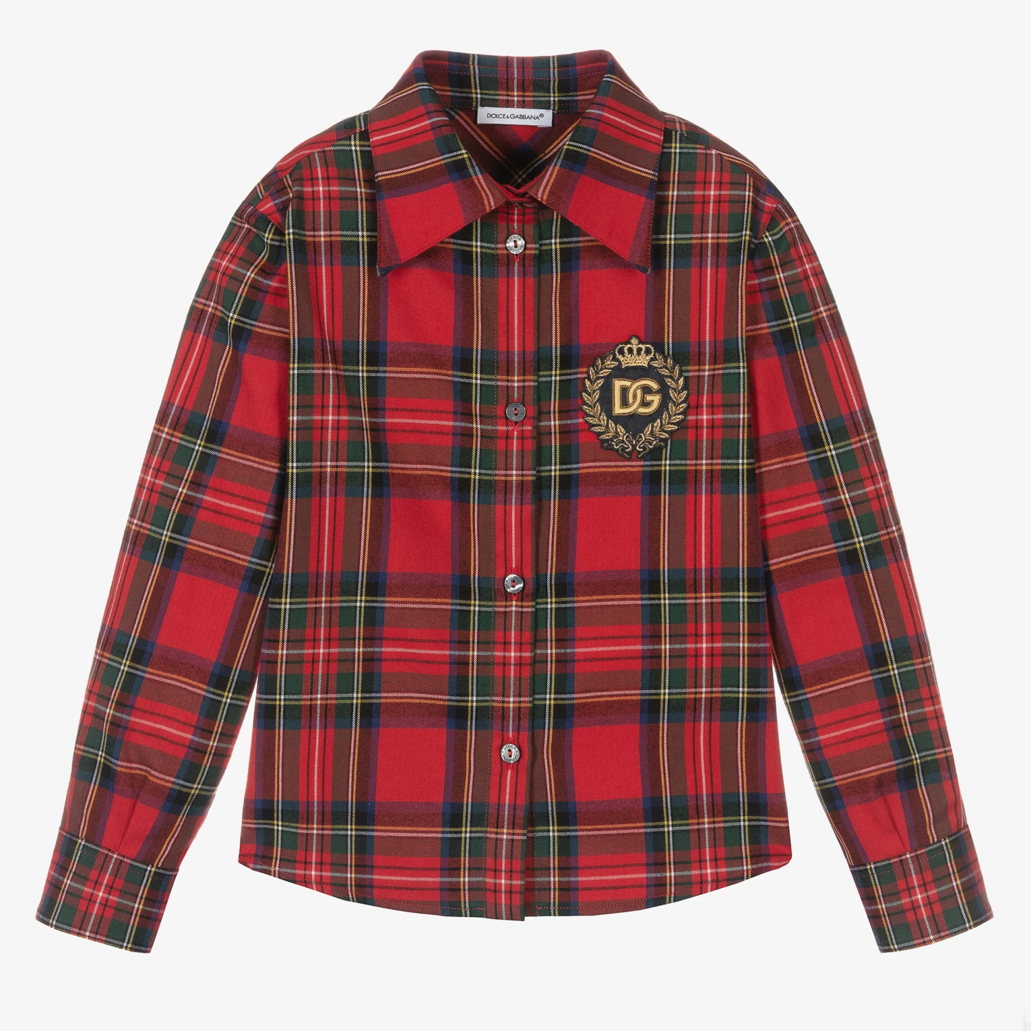 Bold red quadri-check tartan blouse for girls by luxury brand, Dolce & Gabbana. Made in soft brushed feel cotton, this varsity-inspired design has a pointed collar and mother-of-pearl front button fastenings. A black and gold heraldic DG logo badge is embroidered on the chest.