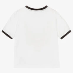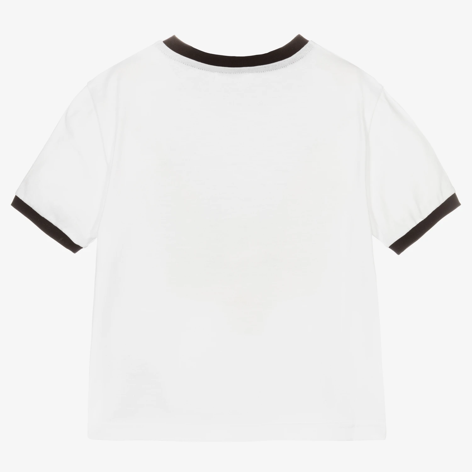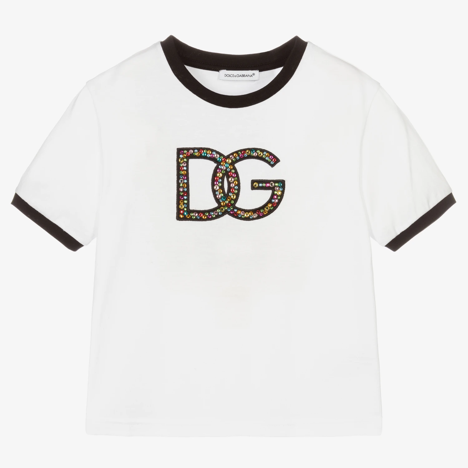 White T-shirt for girls by luxury Italian designer Dolce & Gabbana, made in comfortable cotton jersey. With black trims, it has a black crossover DG logo appliqué on the front, sparkling with colourful diamantés.