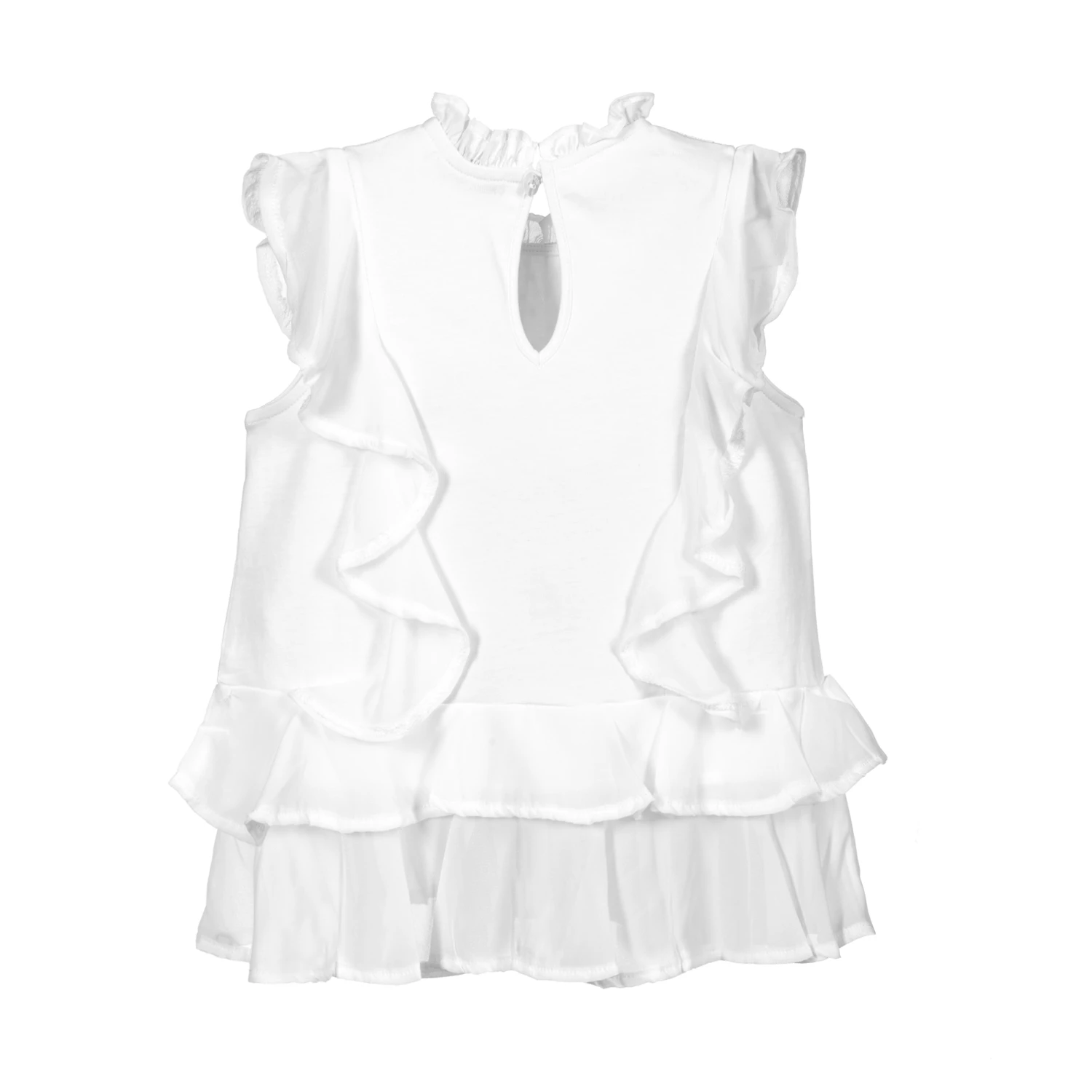 Pretty white top for girls by Dr. Kid, made in soft cotton jersey with ruffled chiffon trim. It has a dotted tulle panel on the front and fastens with a button on the back.