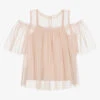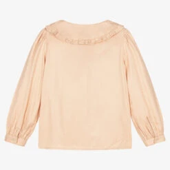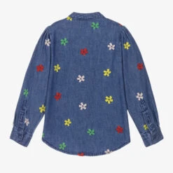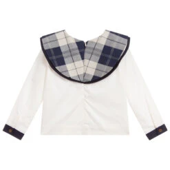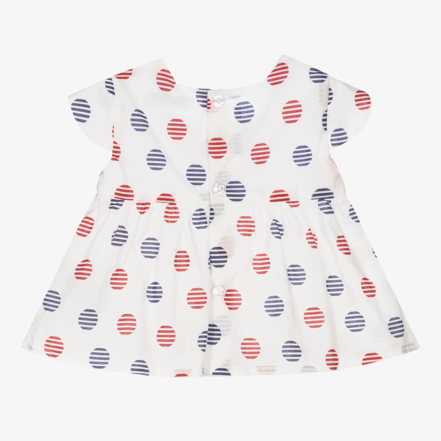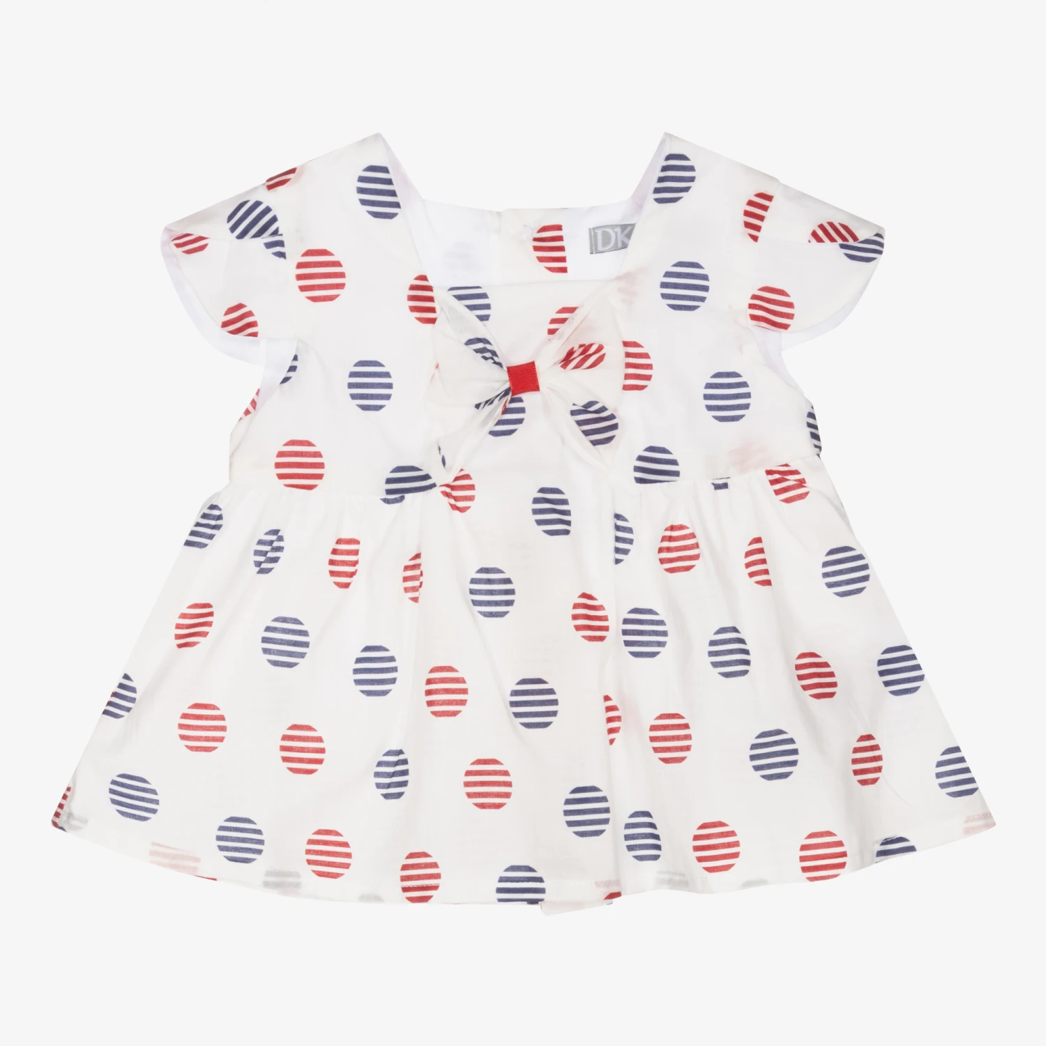 Younger girls white blouse by Dr. Kid, with a striped red and blue polka dot pattern. Made in lightweight cotton, this pretty blouse has tulip sleeves and a bow detail on the front. The bodice has a lightweight lining and there are button fastenings on the back.