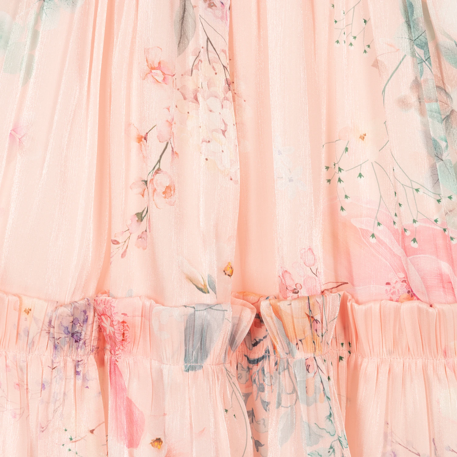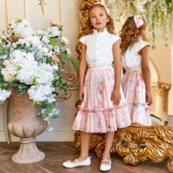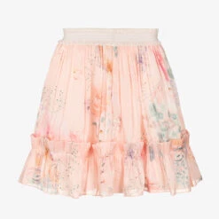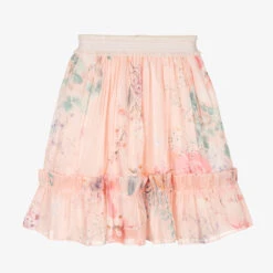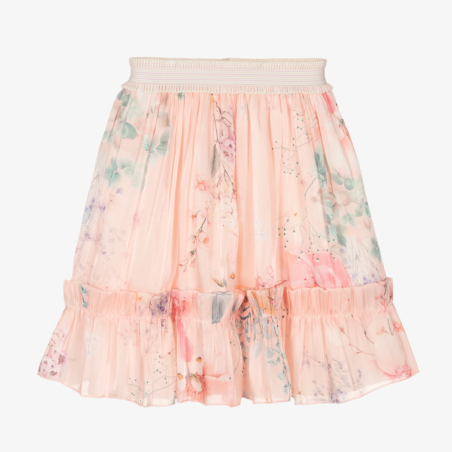 Stunning chiffon skirt for girls by luxury brand Eirene, in a sophisticated shade of light pink. This special occasion skirt has a high sheen, achieving a luxurious look. It is patterned with a delicate floral print all-over and has a striped, stretchy waistband. Promising effortless style and comfort, it has a lightweight cotton lining.