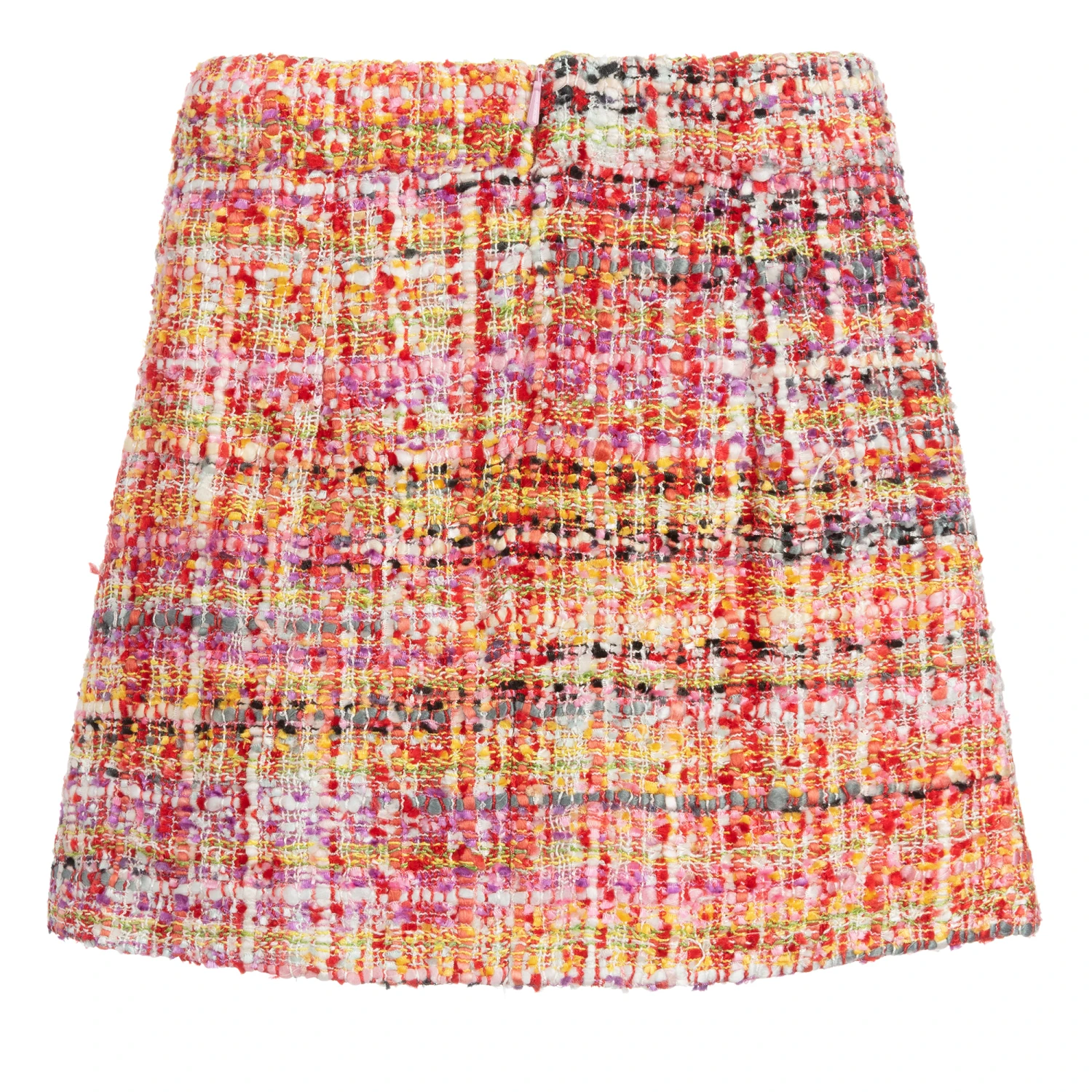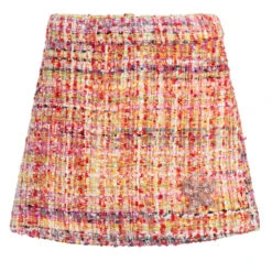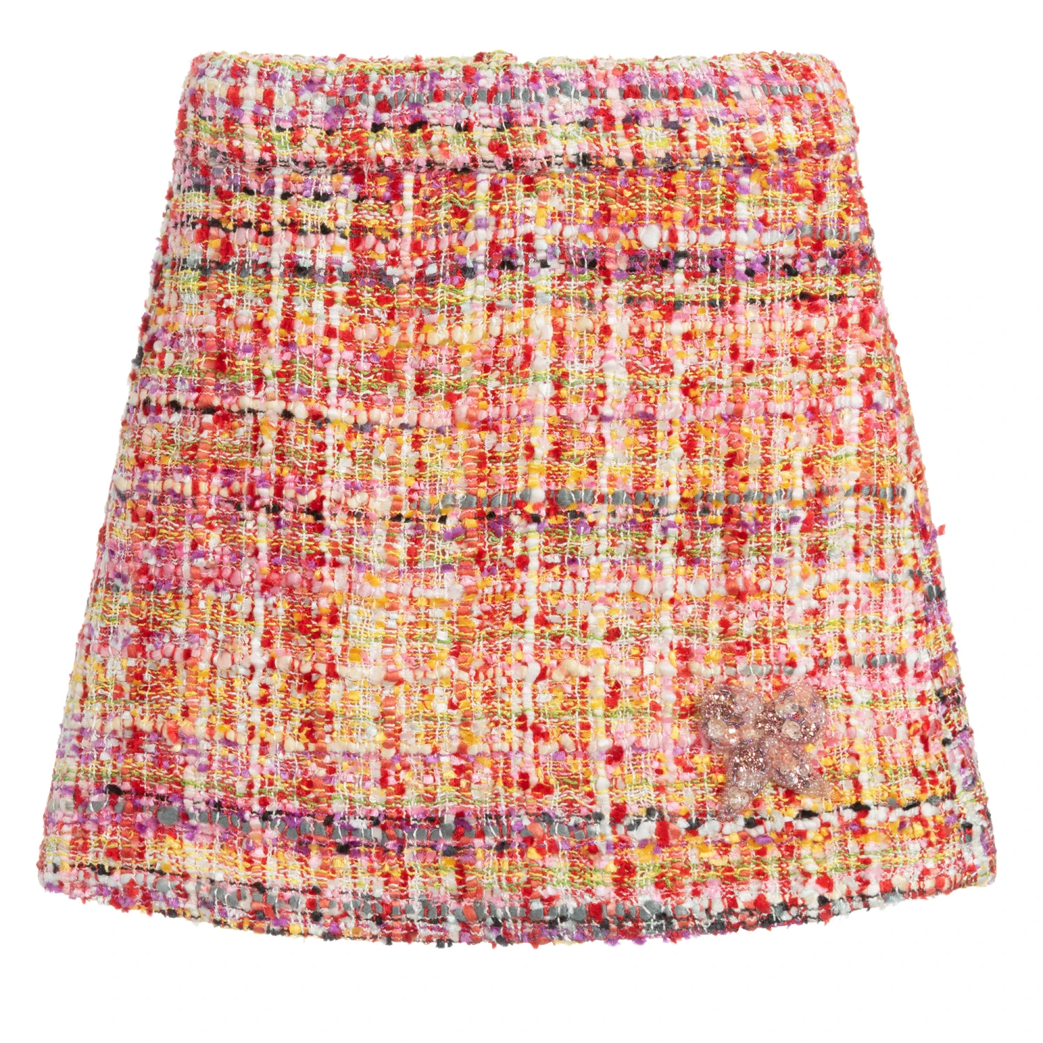 Smart tweed skirt by Eirene, exclusive to Childrensalon. Made in a pink, red and yellow viscose blend, it has a pretty, beaded bow appliqué on the hemline.
