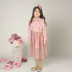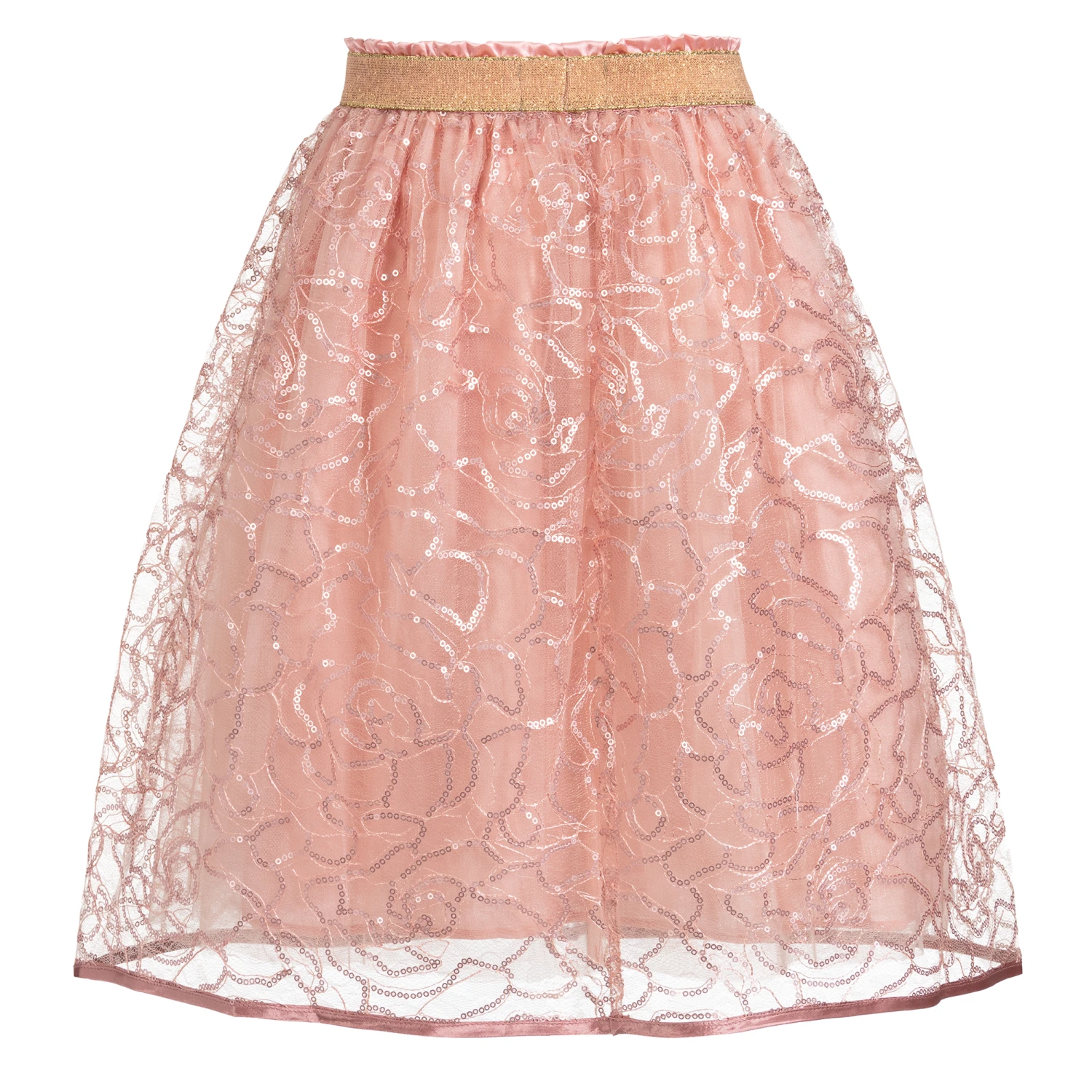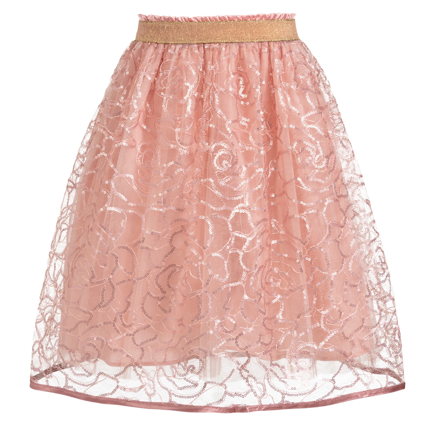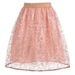 Girls blush pink special occasion lace skirt by Eirene. The delicate cobweb lace overlay is decorated with sparkly sequins, with double tulle underskirts and a cotton lining. The waistband is elasticated with a sparkly gold band.
