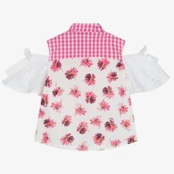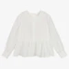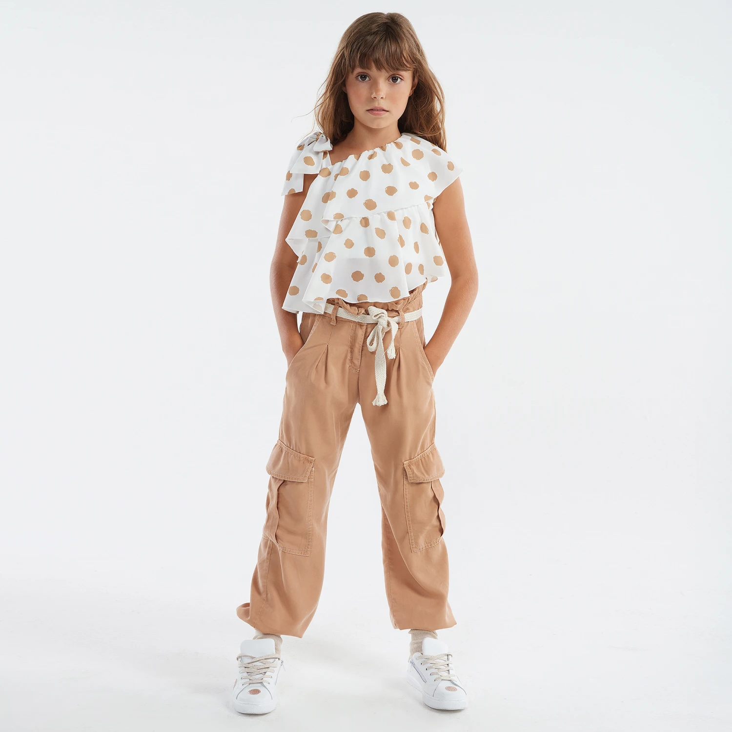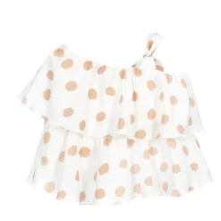 Stylish for girls, an ivory chiffon blouse by Elsy, with a beige spotted design. Soft and lightweight, is has a large frill across the shoulders, with a stretchy elasticated neckline. There is a single tie shoulder strap with bow detail and a lightweight jersey lining, for added comfort.