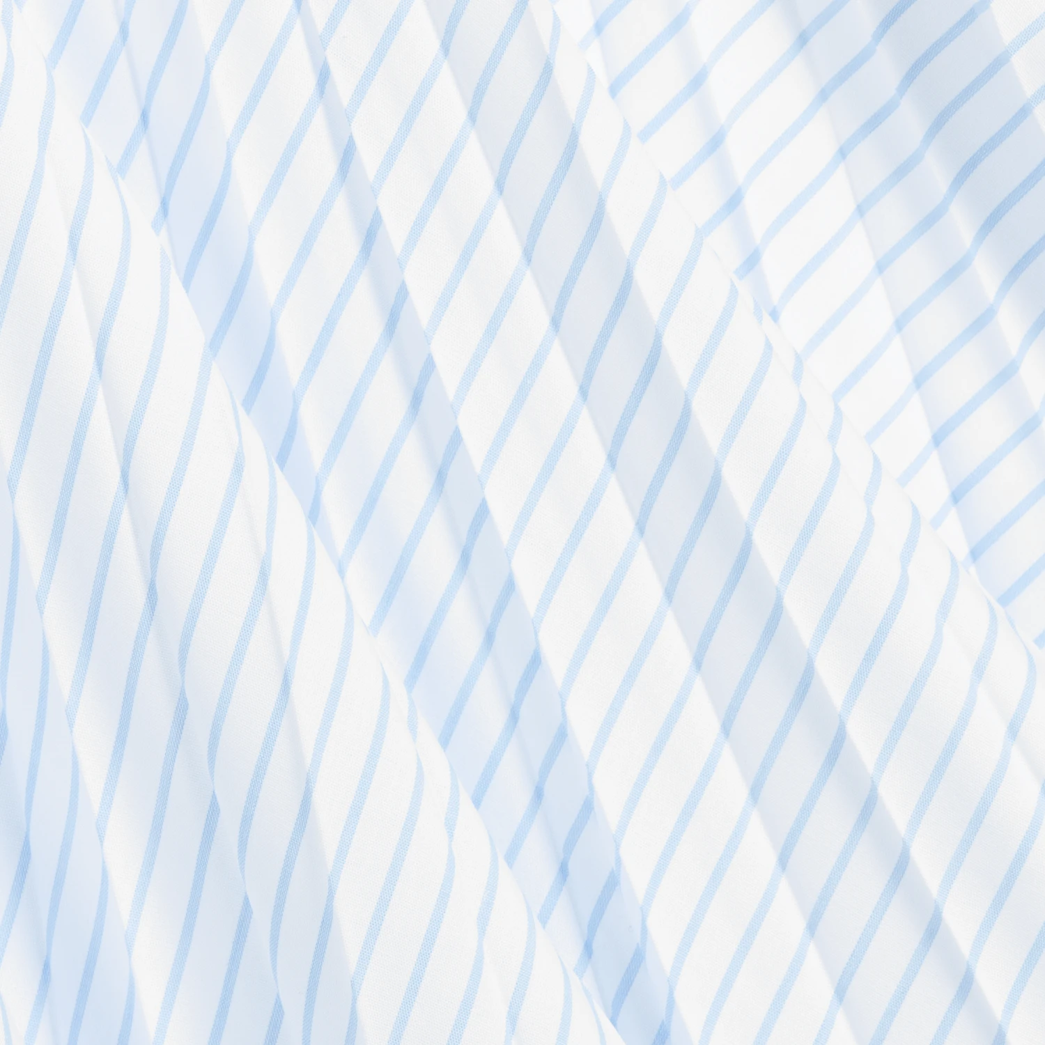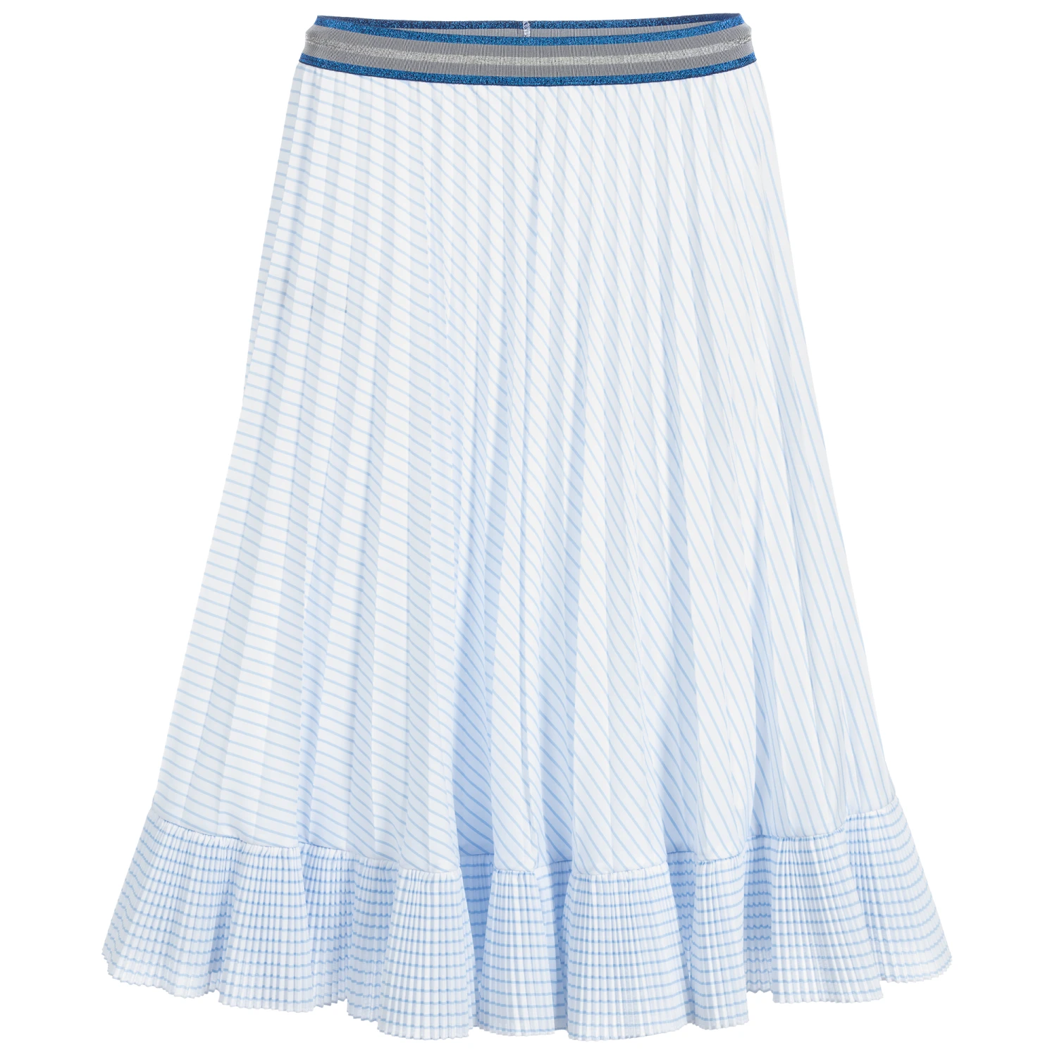 A lovely pleated skirt for girls by Elsy, in white with pale blue stripes. It is made in a lightweight polycotton blend with a sparkly blue and silver elasticated waistband, and finely pleated hem. This elegant skirt is comfortably lined in lightweight cotton.