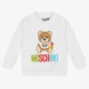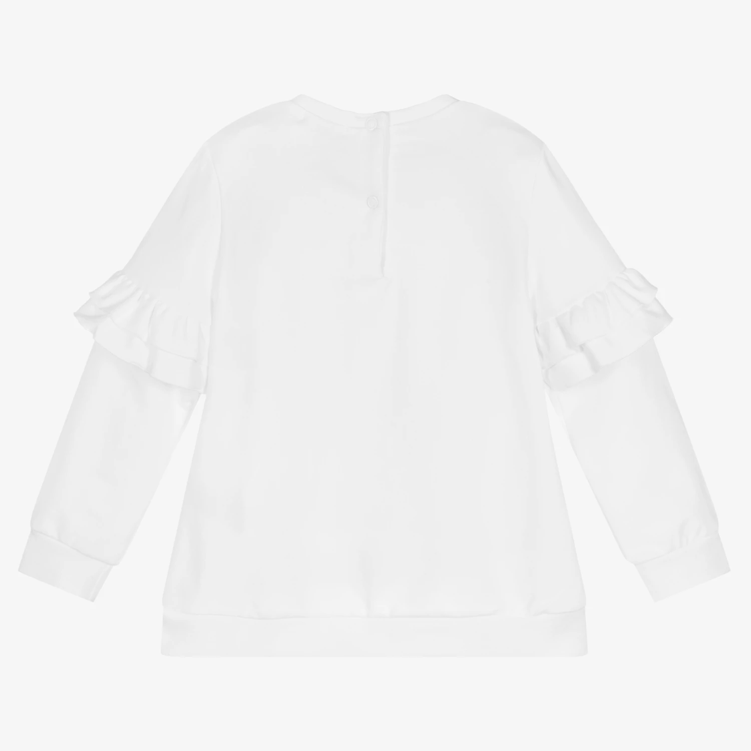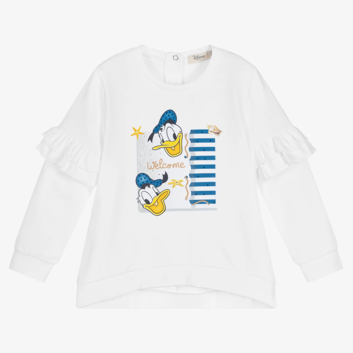 White sweatshirt for girls by Everything Must Change. Made in comfortable cotton jersey, it has a blue, white and yellow Donald Duck print on the front, sparkling with rhinestones. There are pretty ruffles on the sleeves.
