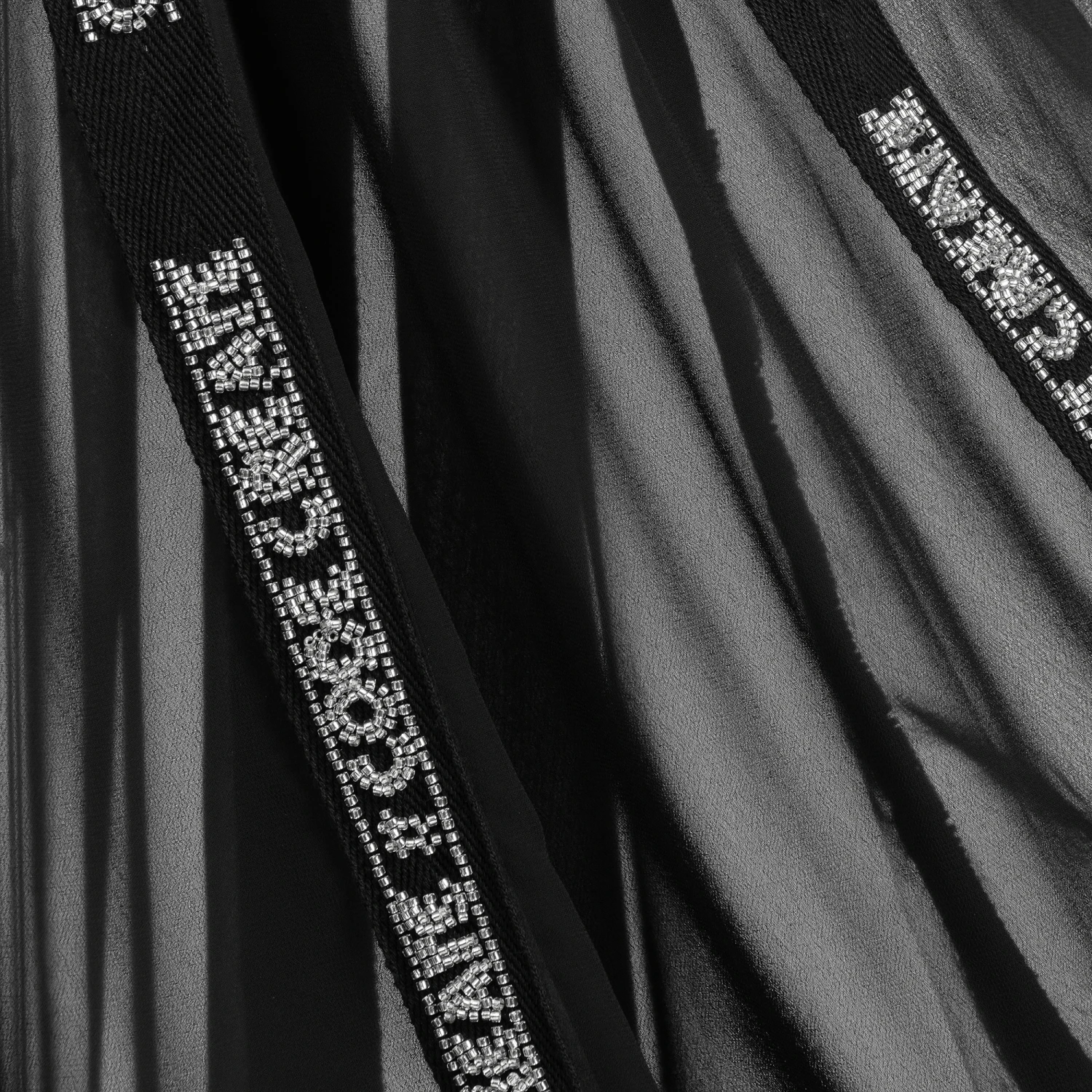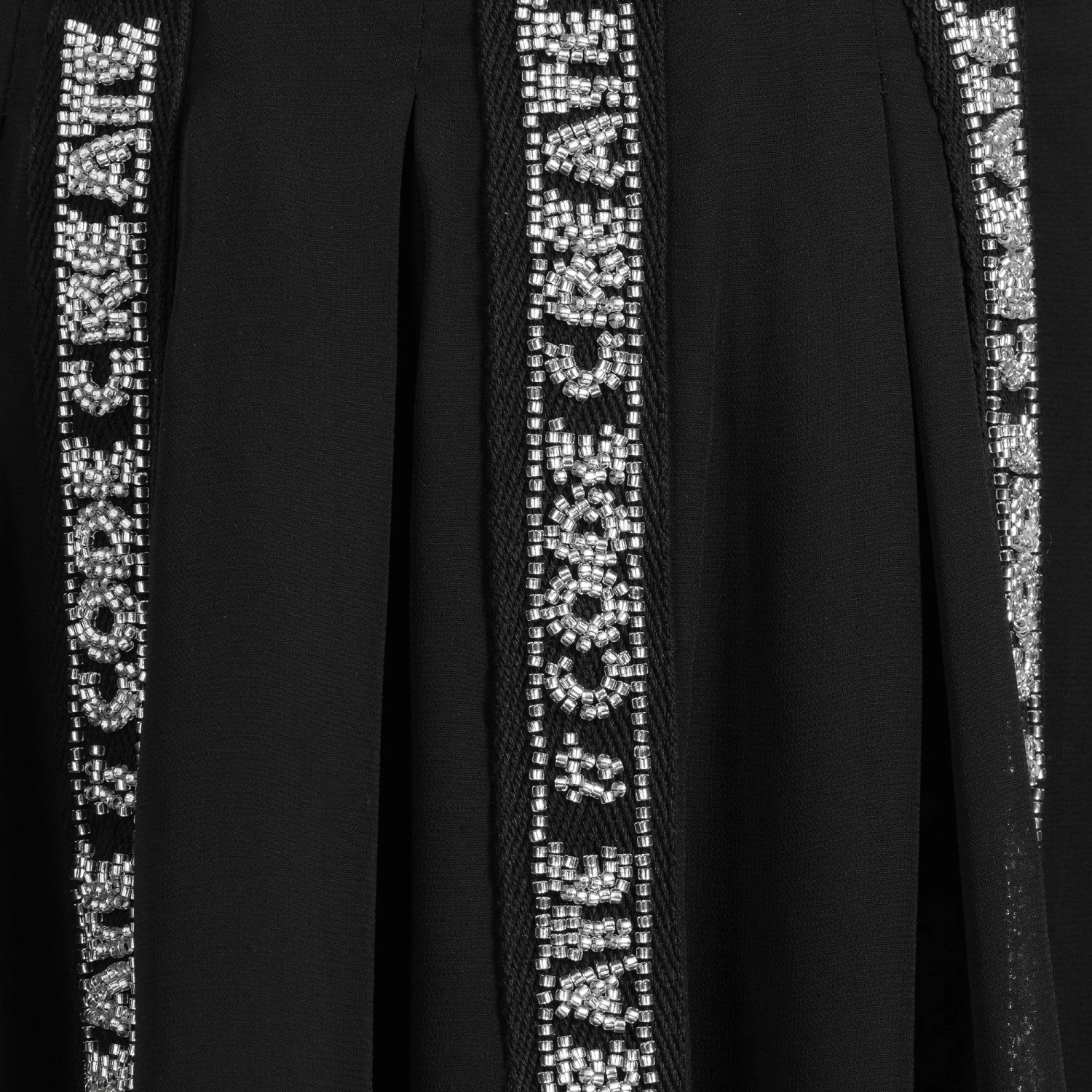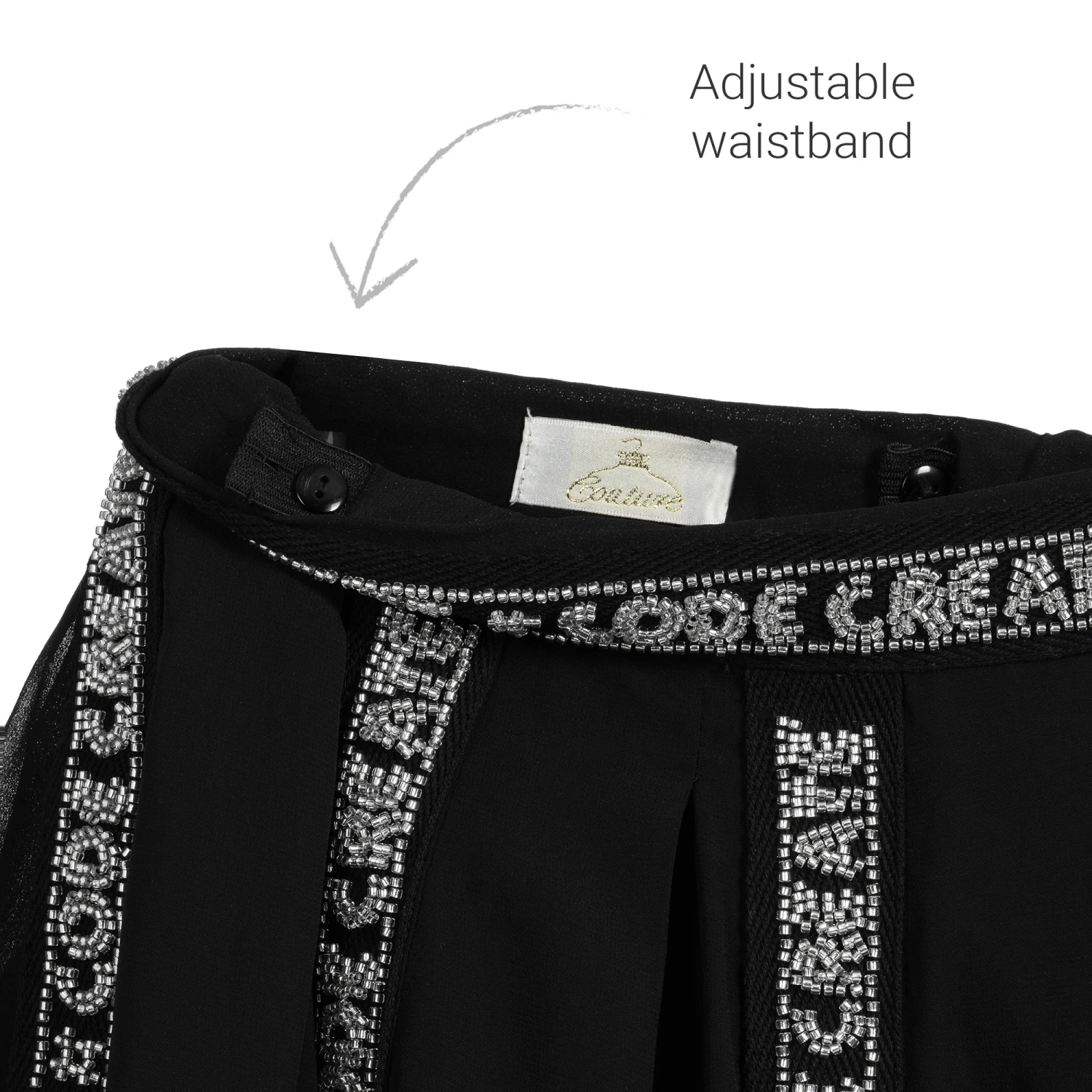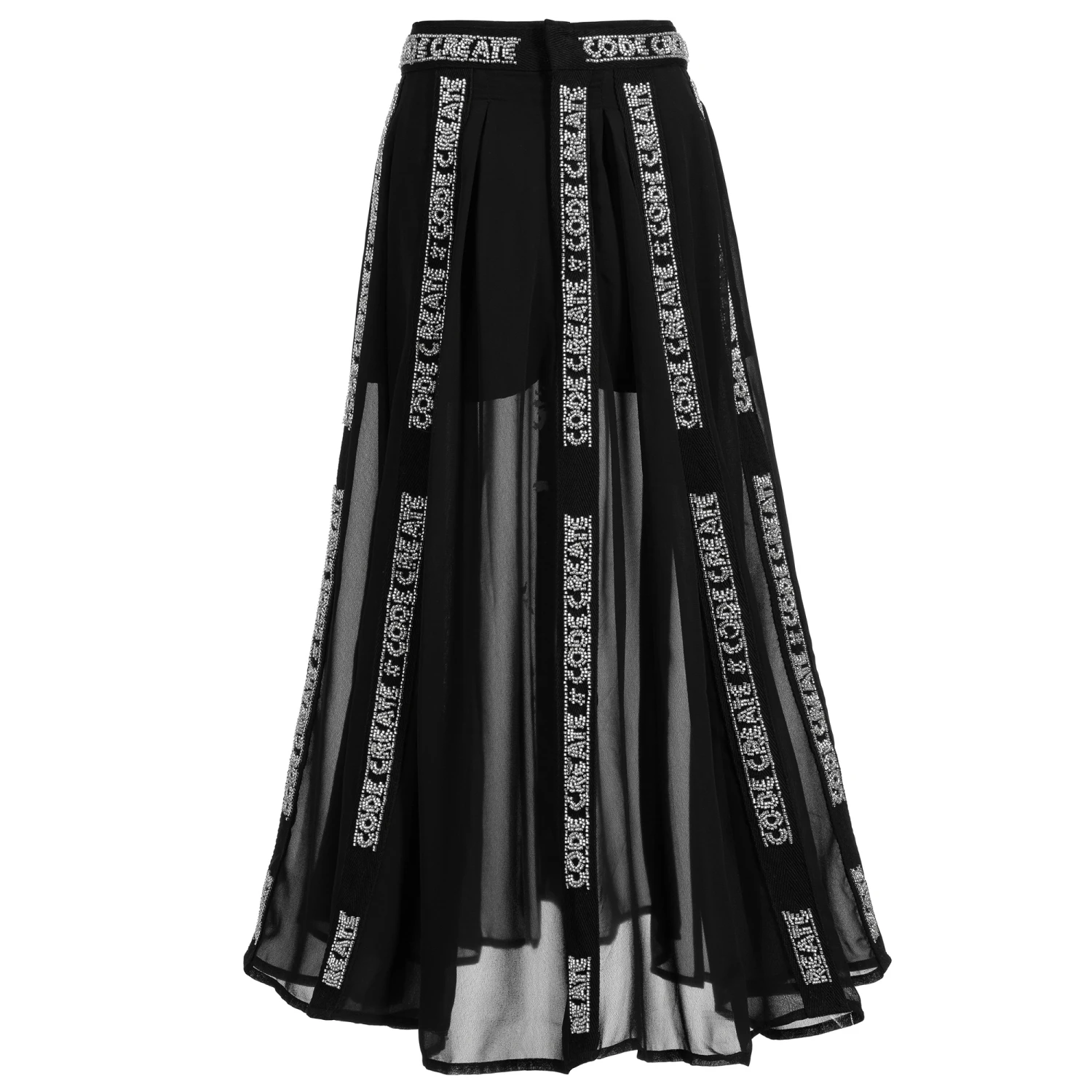 Girls long black skirt by Fun & Fun Couture, made in lightweight chiffon. It is decorated with silver beads spelling out the words ‘Code Create’. The skirt is sheer with a shorts lining and adjustable waistband.
