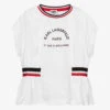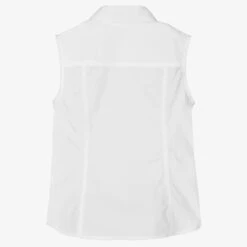 Off white sleeveless shirt for girls by Fun & Fun, made in lightweight cotton poplin. Cool and comfortable, this style staple has a classic pointed collar, epaulettes, and decorative gold buttons on the shoulders. It has a concealed button placket, decorative patch pockets on the chest and a curved hem.