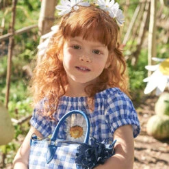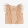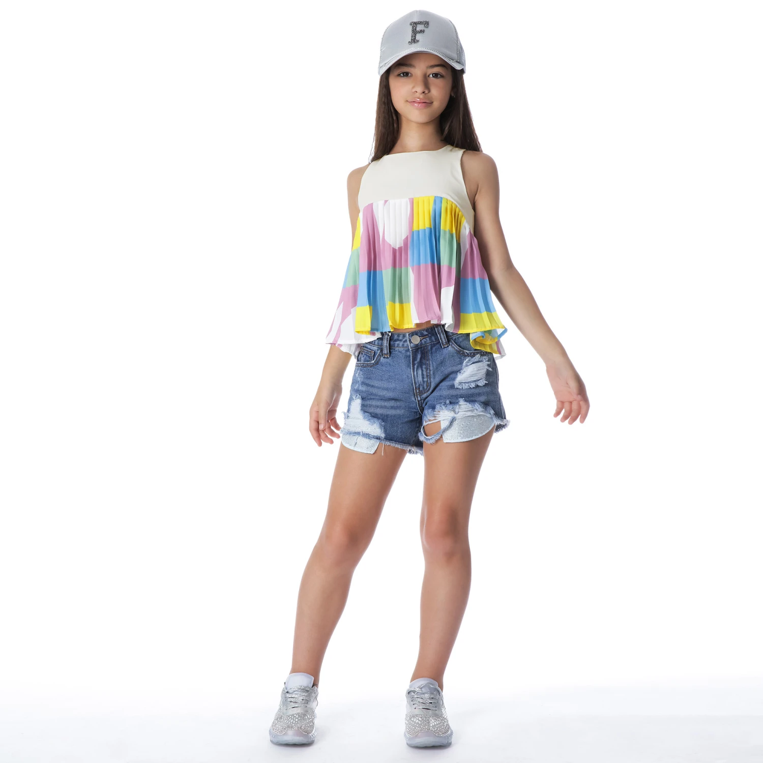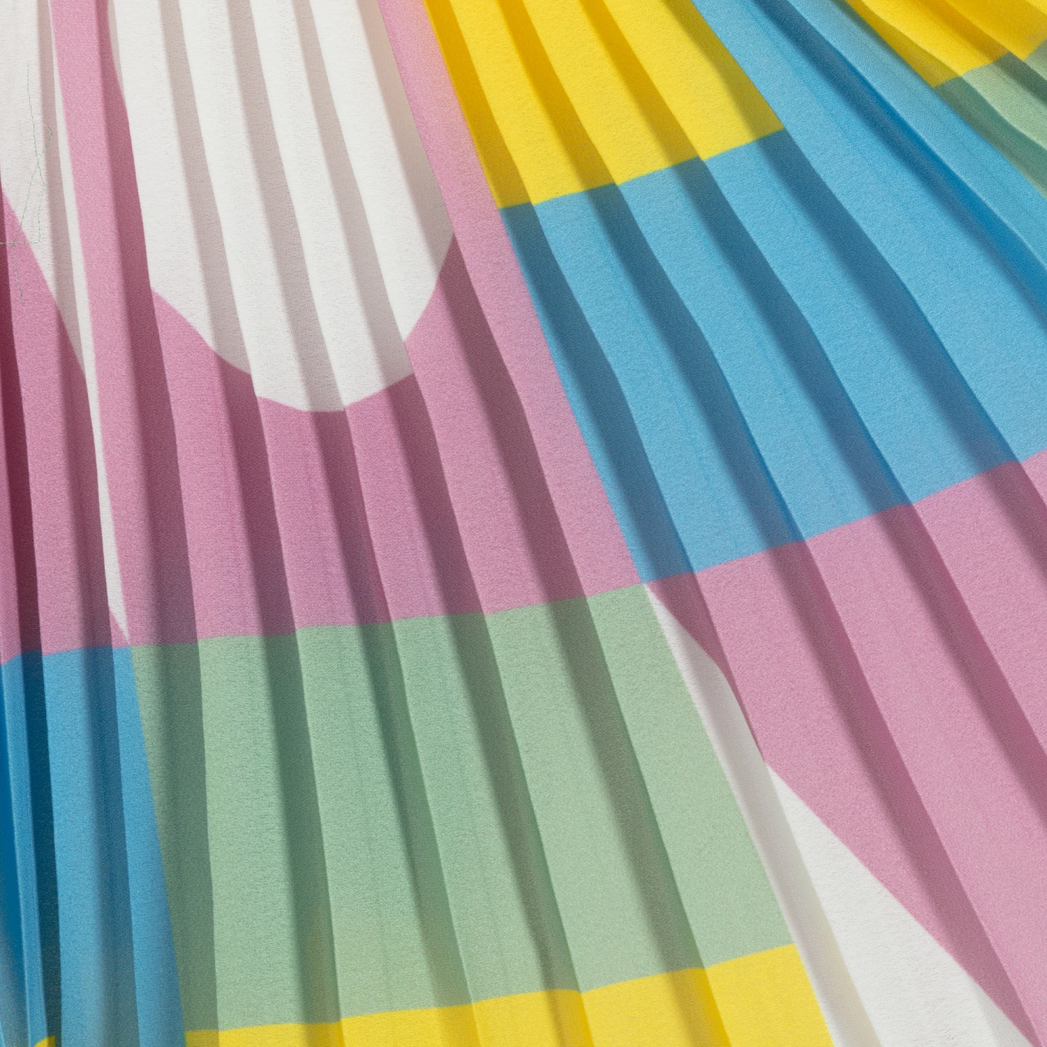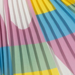 Pink, yellow, green, blue and ivory top for girls by Fun & Fun. It has an ivory satin bodice with lightweight, pleated polyester crêpe below. There is a concealed zip fastening on the back.