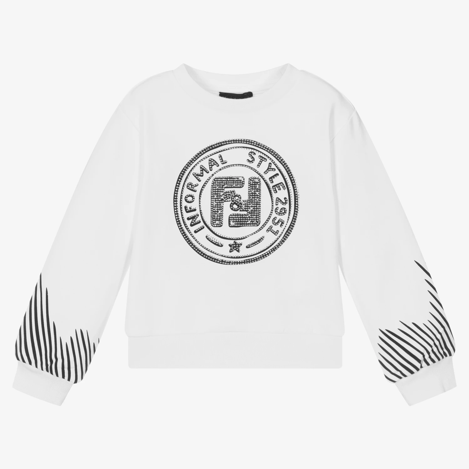 Off-white sweatshirt for girls by Italian designer Fun & Fun, made in comfortable cotton jersey. It has the brand’s black printed logo with sparkling diamantés on the front and black stripe detailing on the sleeves.