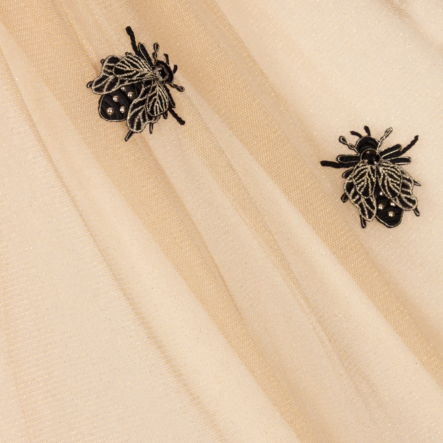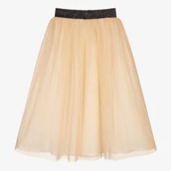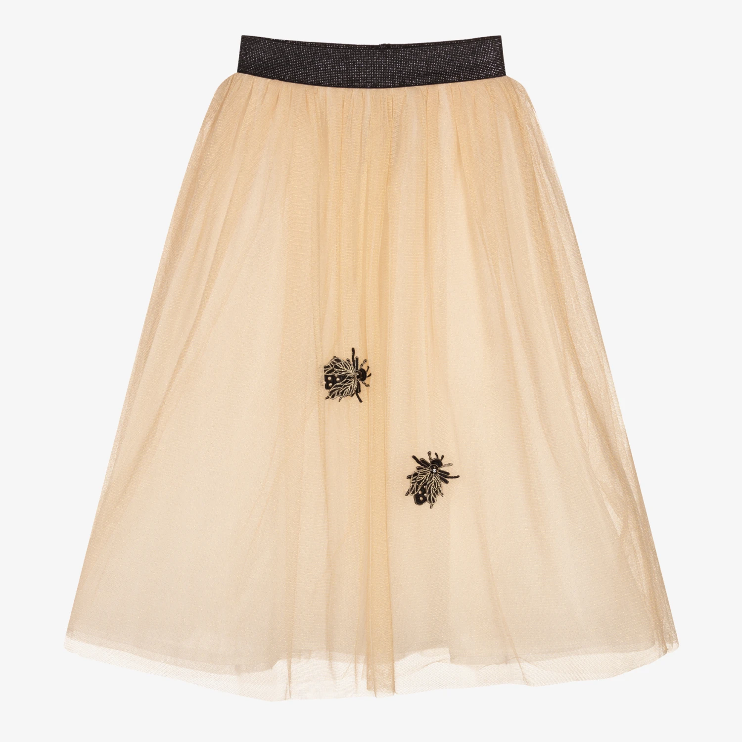 Girls gold maxi skirt from Giamo, made in soft and shimmery tulle. It has a glittery black elasticated waistband and a lightweight white cotton lining. There are black beetle appliqués on the front, embellished with black gems and gold embroidery.