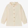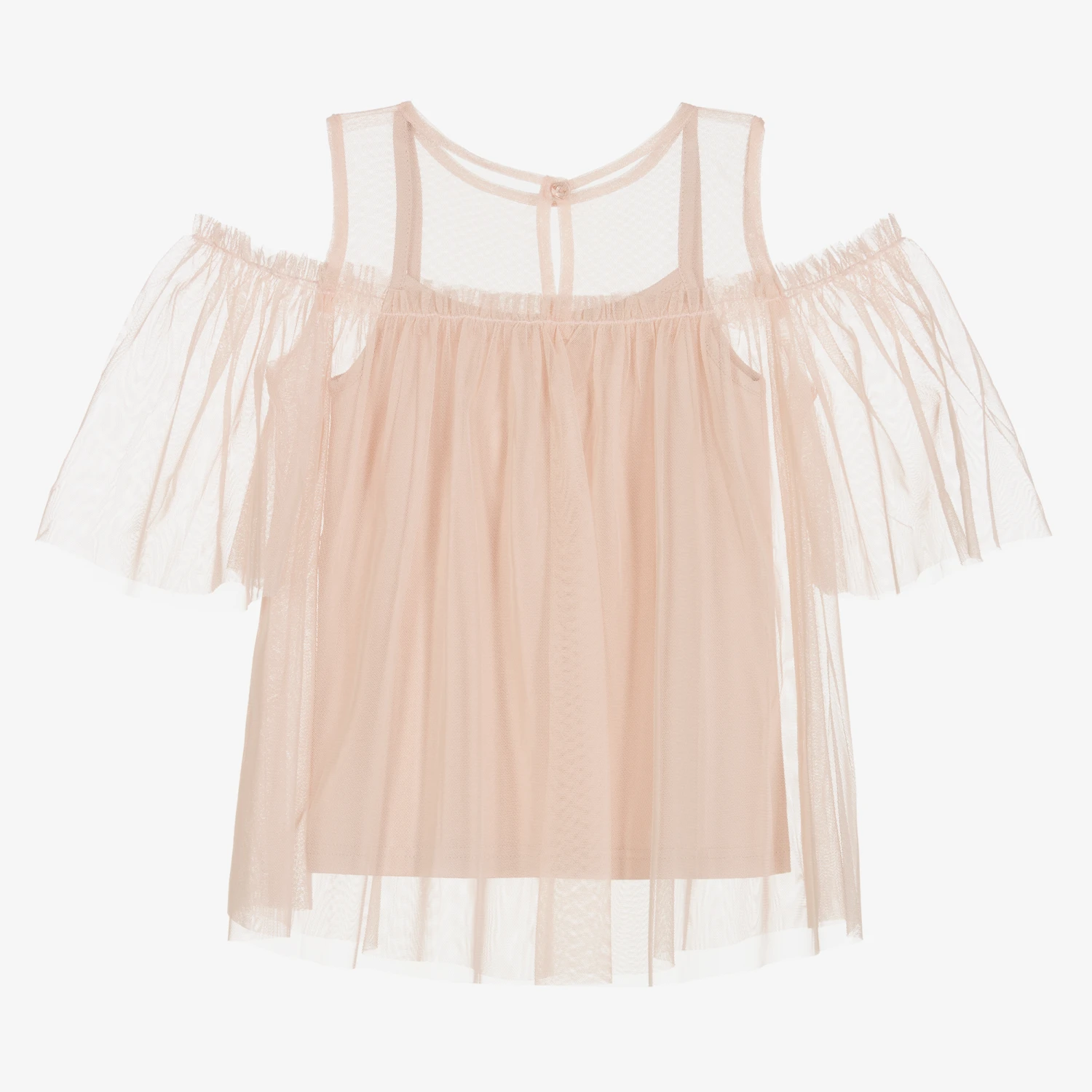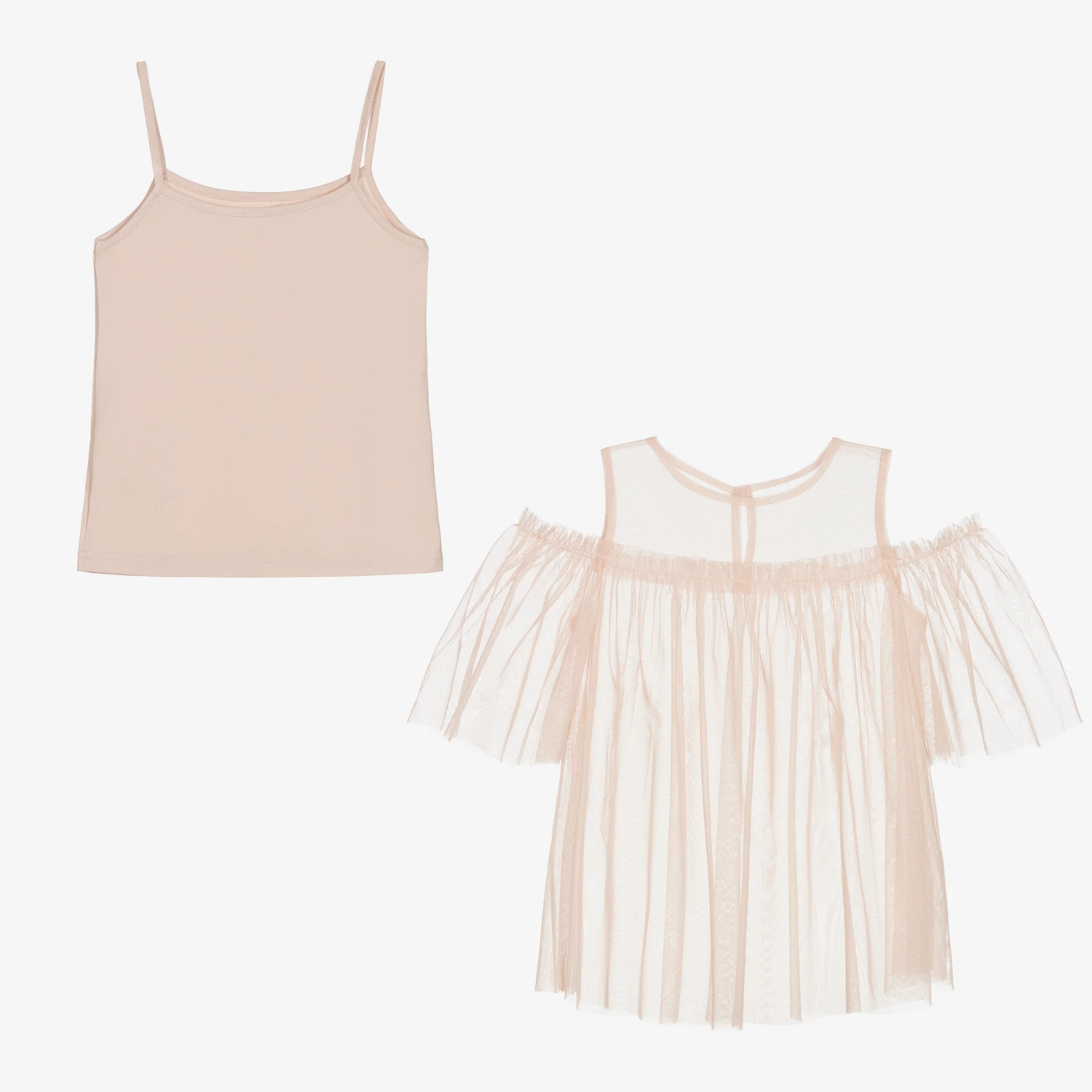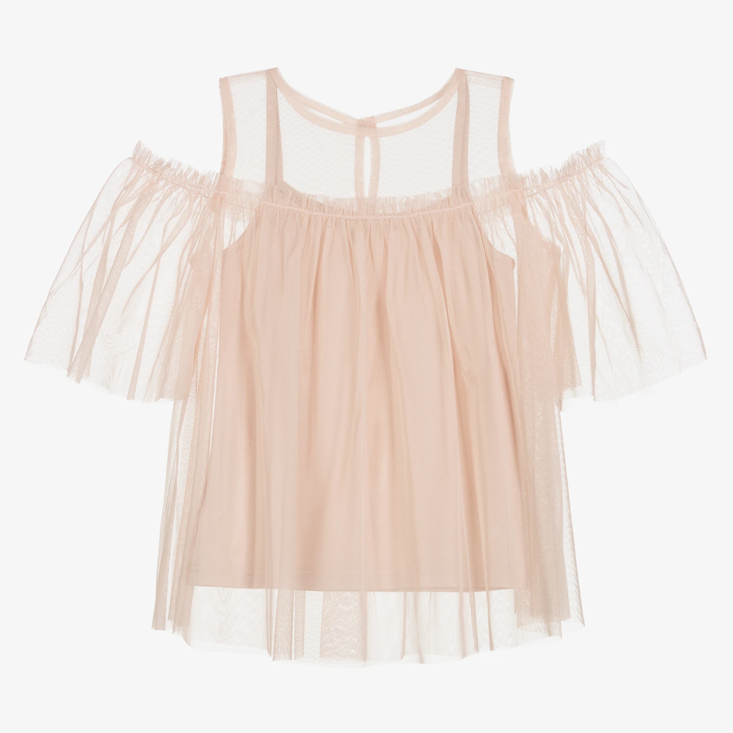 Girls beautiful peach pink blouse by Giamo, made in soft, sheer tulle. It has a stylish cold shoulder design with elasticated, flutter sleeves and a full gathered shape. It comes with a matching cotton jersey vest top, to be worn as a layer underneath.