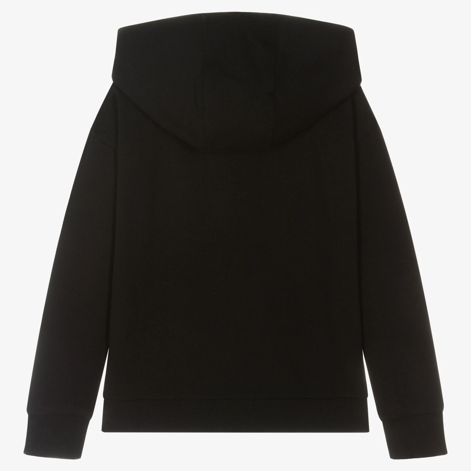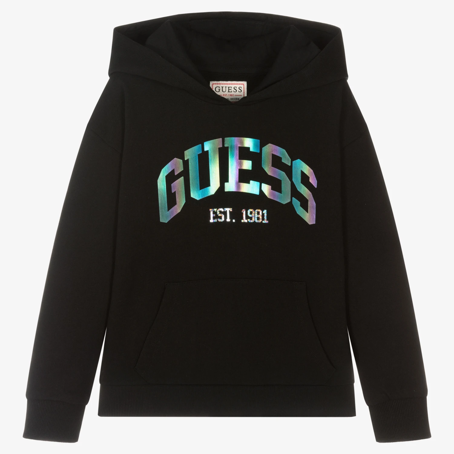 Black hooded top for girls by Guess, made in mid-weight organic cotton jersey. The front has a metallic logo appliqué and silver glitter Est 1981, with a useful pouch pocket and ribbed cuffs and hem.