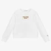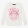 Beautiful and vibrant for girls, a colourful Guess sweatshirt with a raised glittery gold Triangle logo on the front. Made in lightweight cotton sweatshirt jersey, it has a bold geometric pattern, incorporating roses and subtle logo prints, in red, pink, purple and yellow. A classic casual style, it has pale pink ribbed trims.