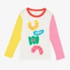 Eye-catching white T-shirt for girls by American brand Guess, made in soft cotton jersey. This cool tee is printed on the front with the signature Triangle logo in shiny gold sequins above a beautiful red and blue floral print. Printed on the back with a colourful geometric pattern, incorporating red roses and subtle logos, it has a longer length, curved hem to complete the look.